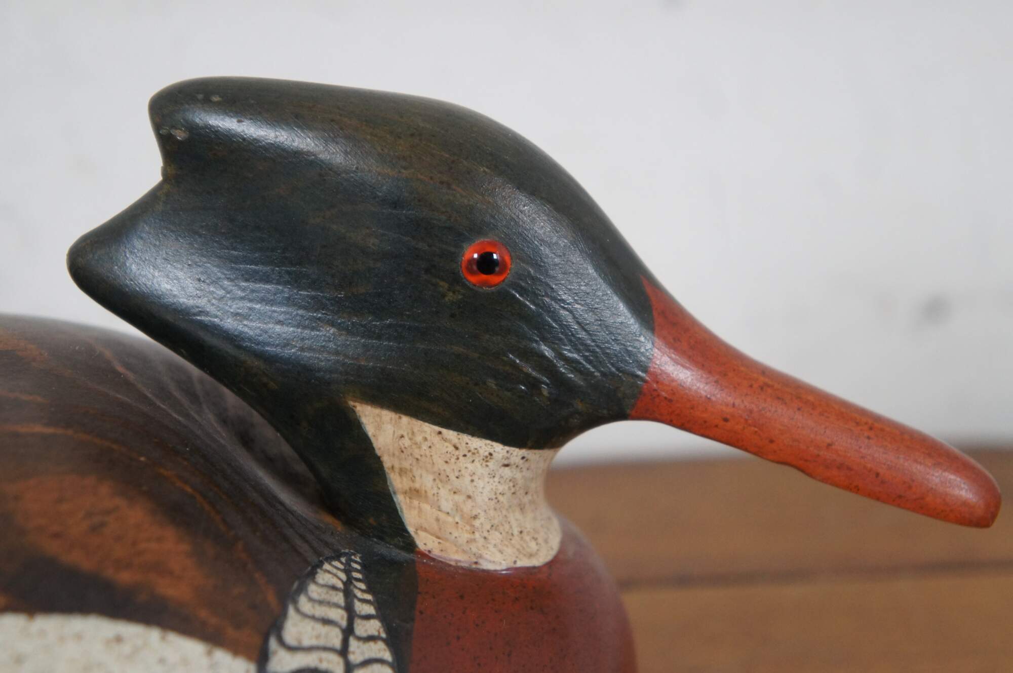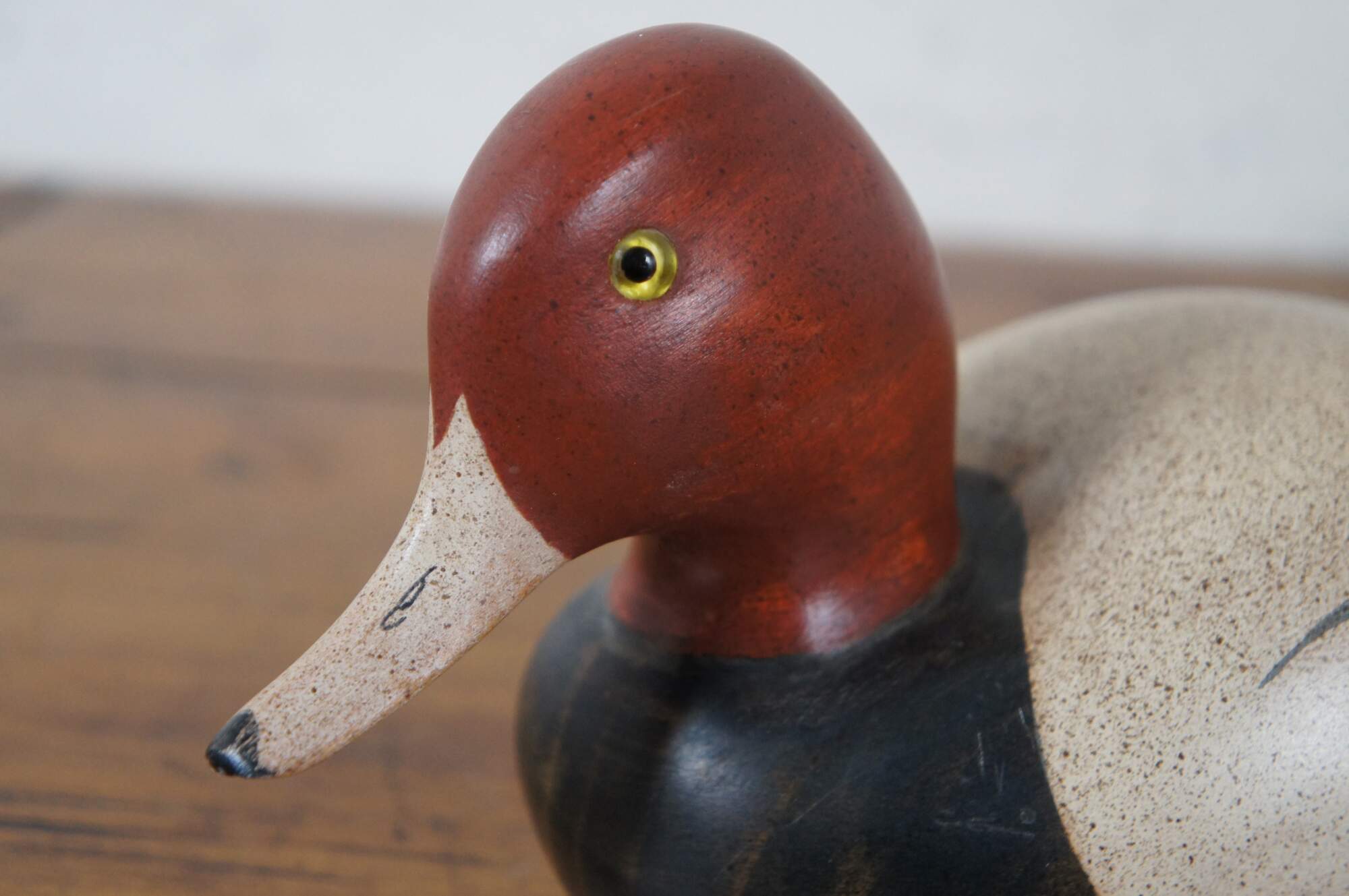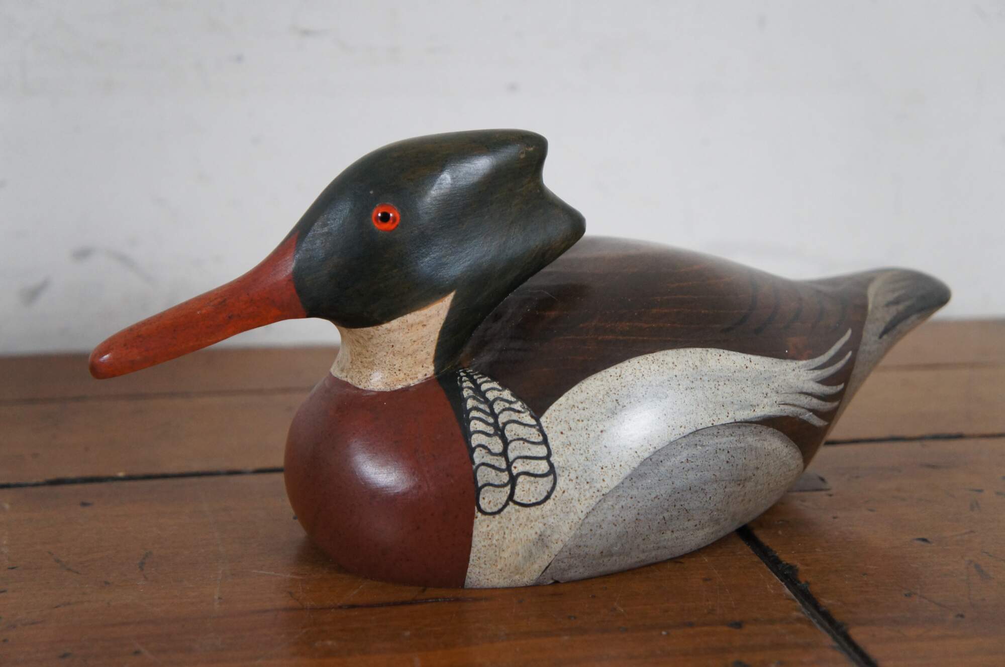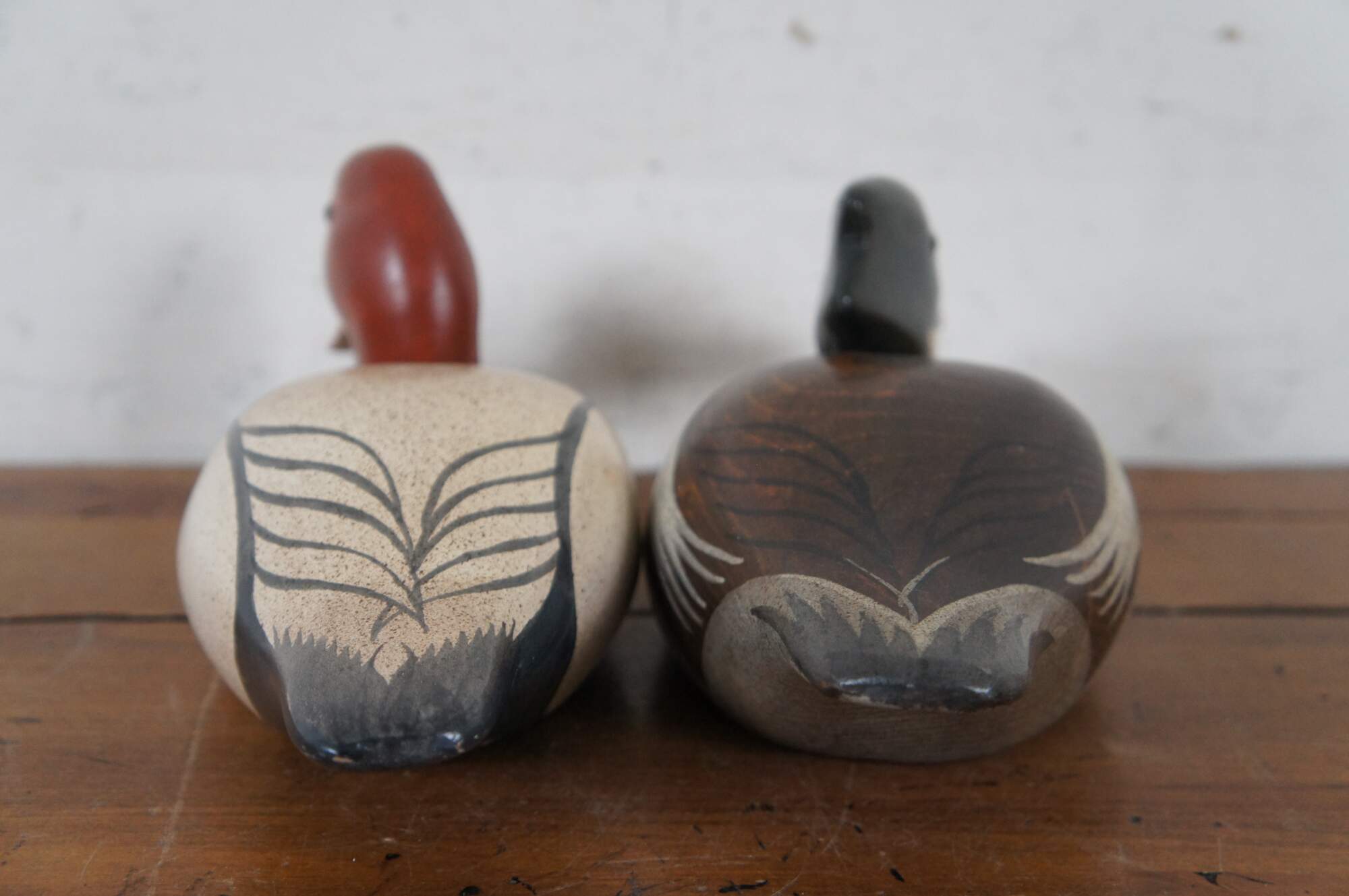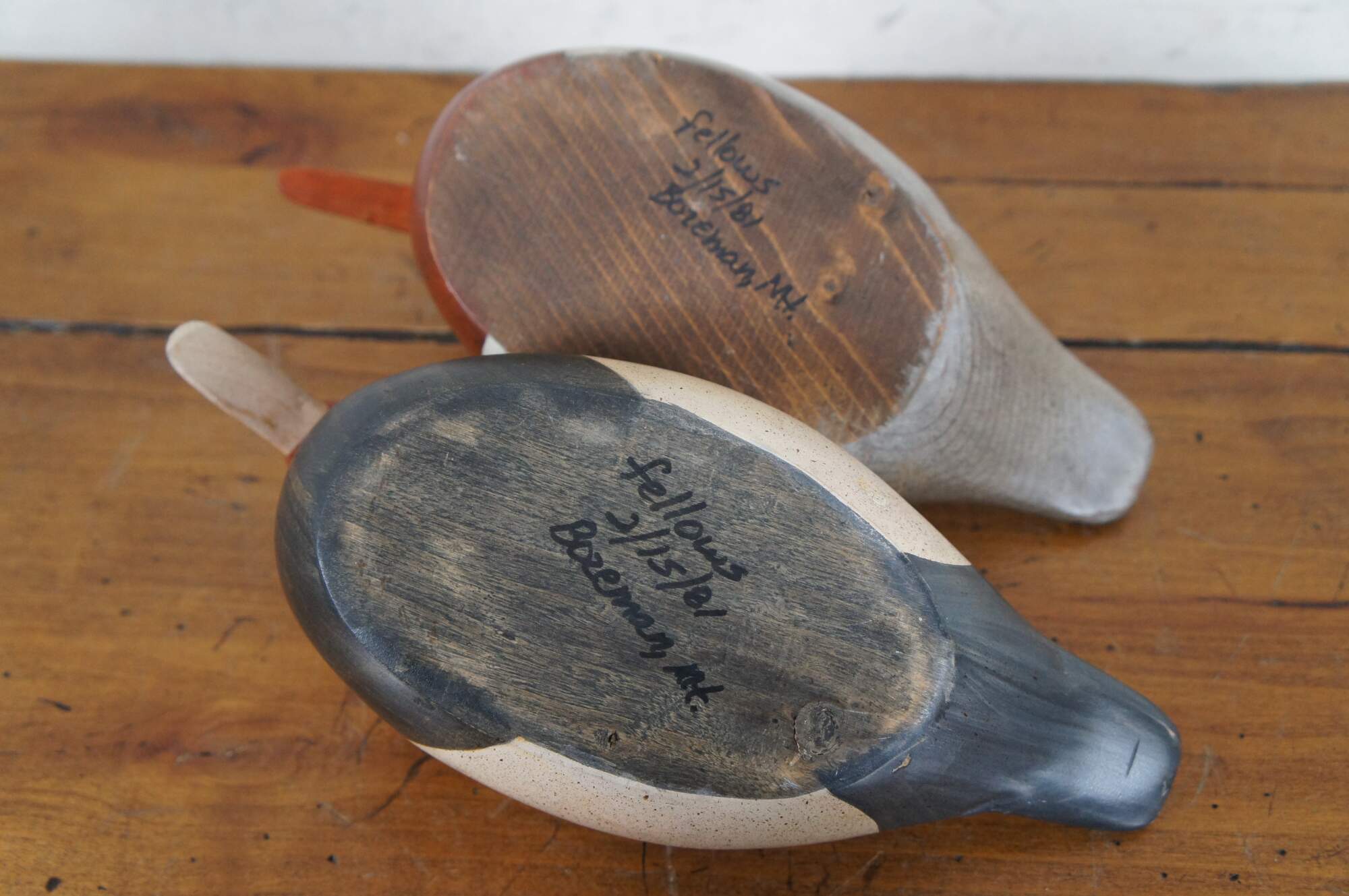 Pair of vintage carved and painted wooden duck decoys / figurines - one Redhead Drake and one Red-breasted Merganser - signed by artist craig Fellows of Big Sky Carvers of Bozeman, MT and dated 2/15/81.