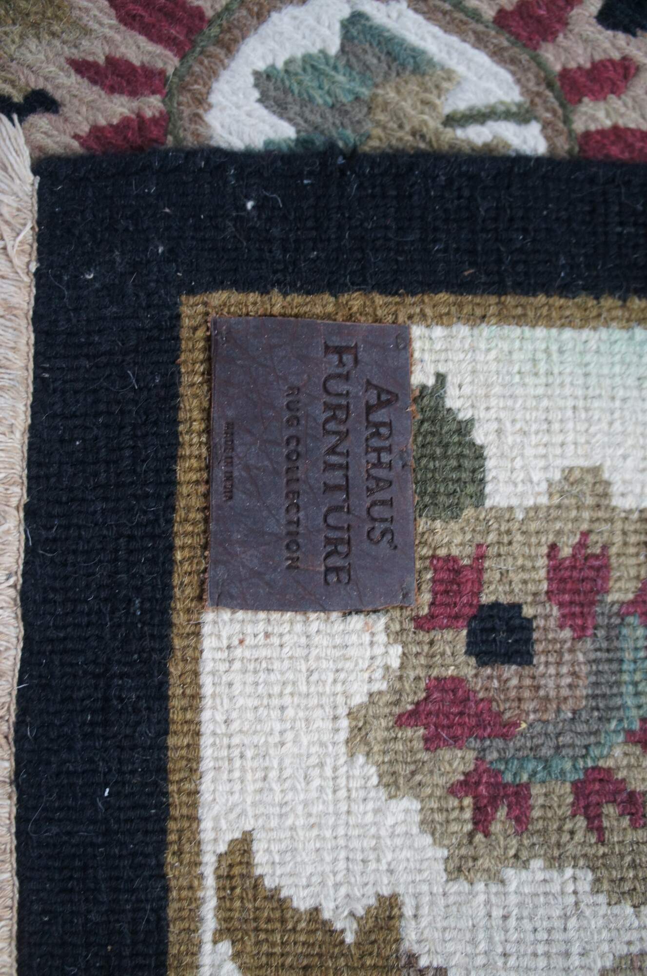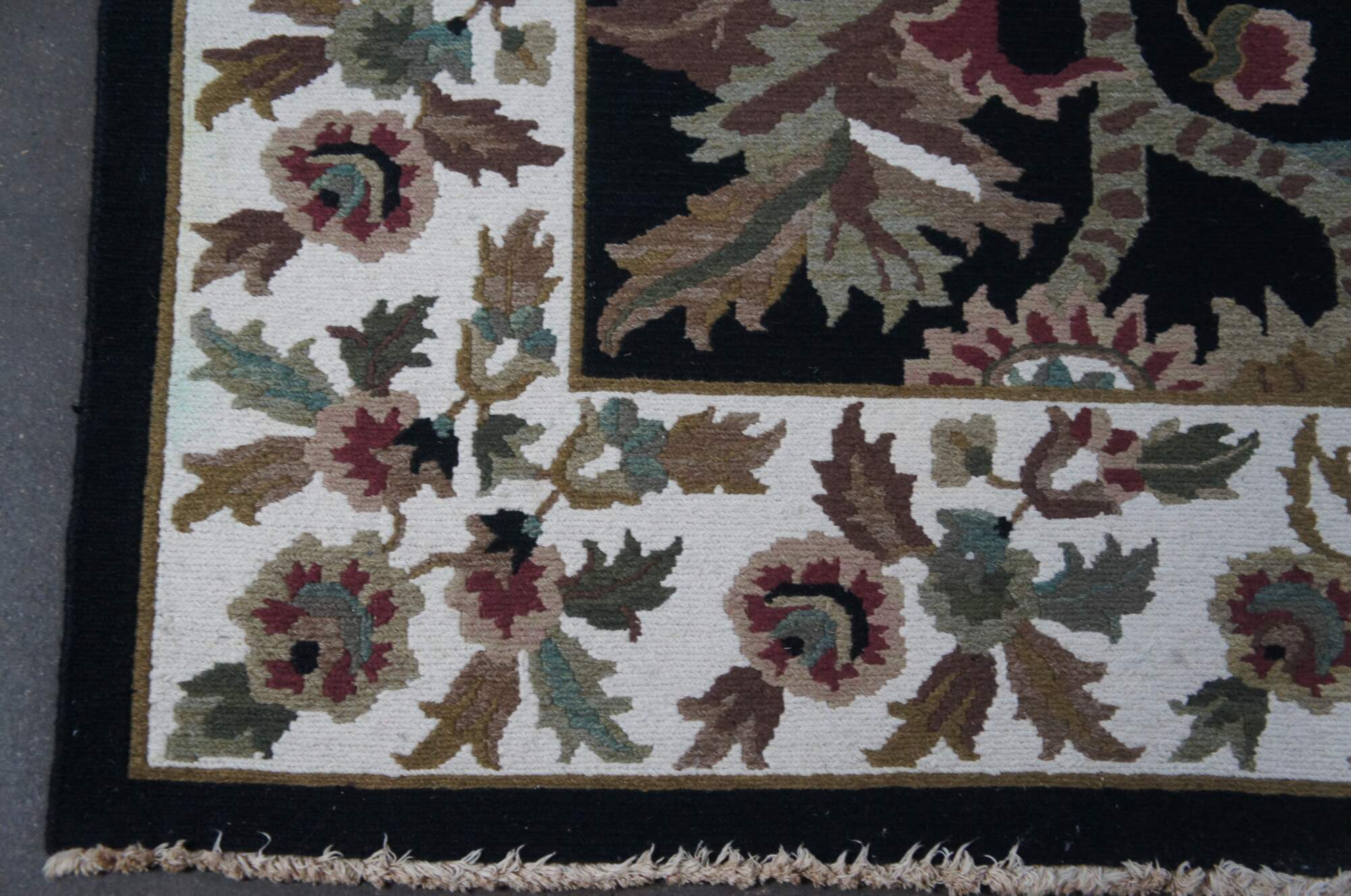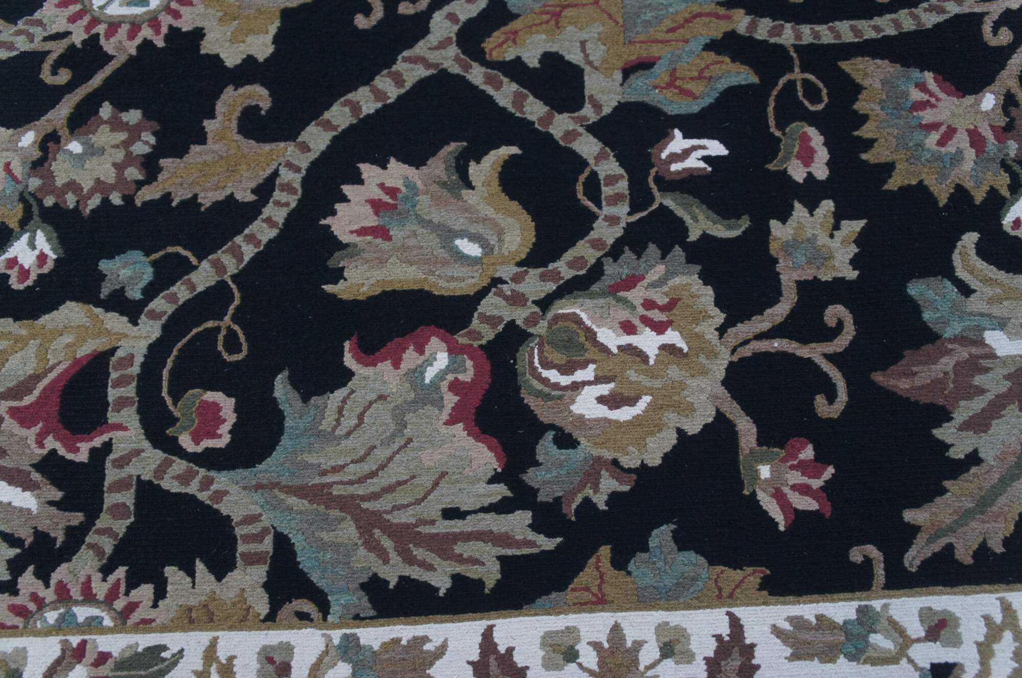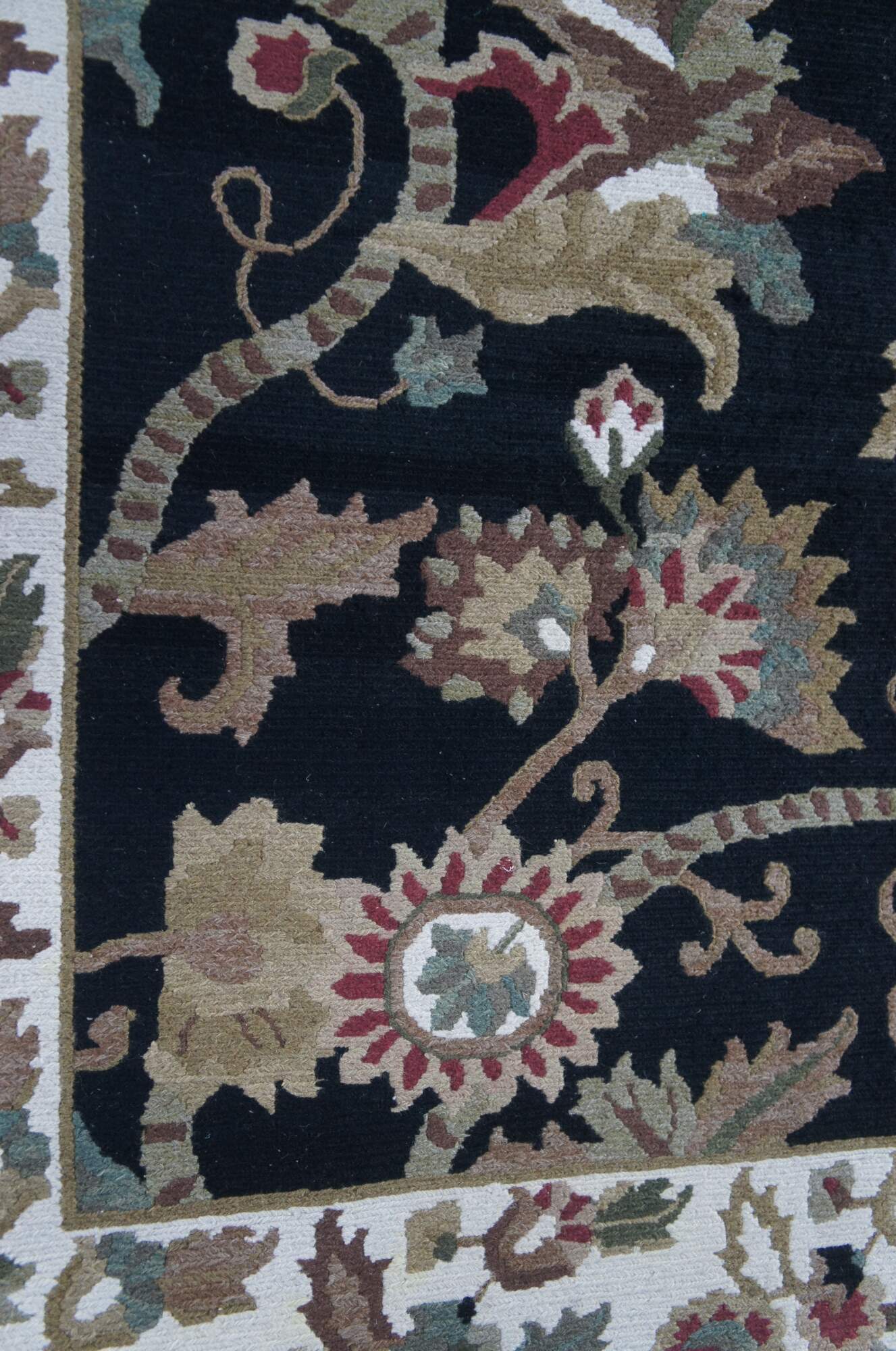 Deep blue / black field with greens, tans, reds, pinks, browns, creme / beige. Made in India. MSRP $6000