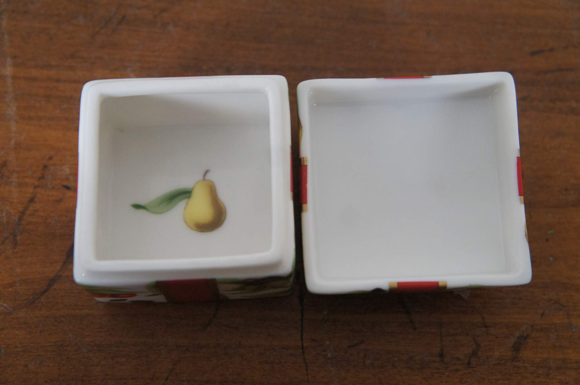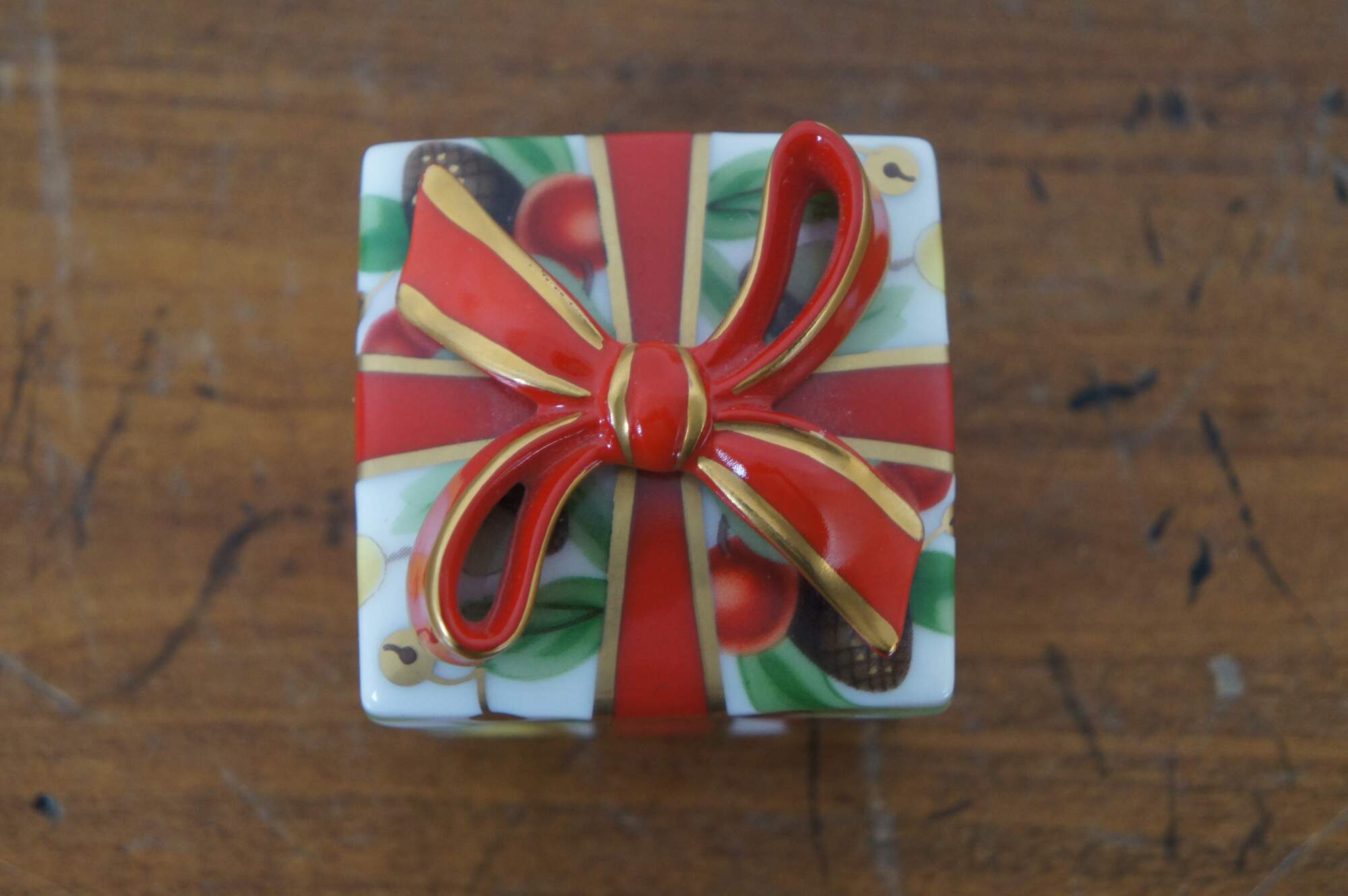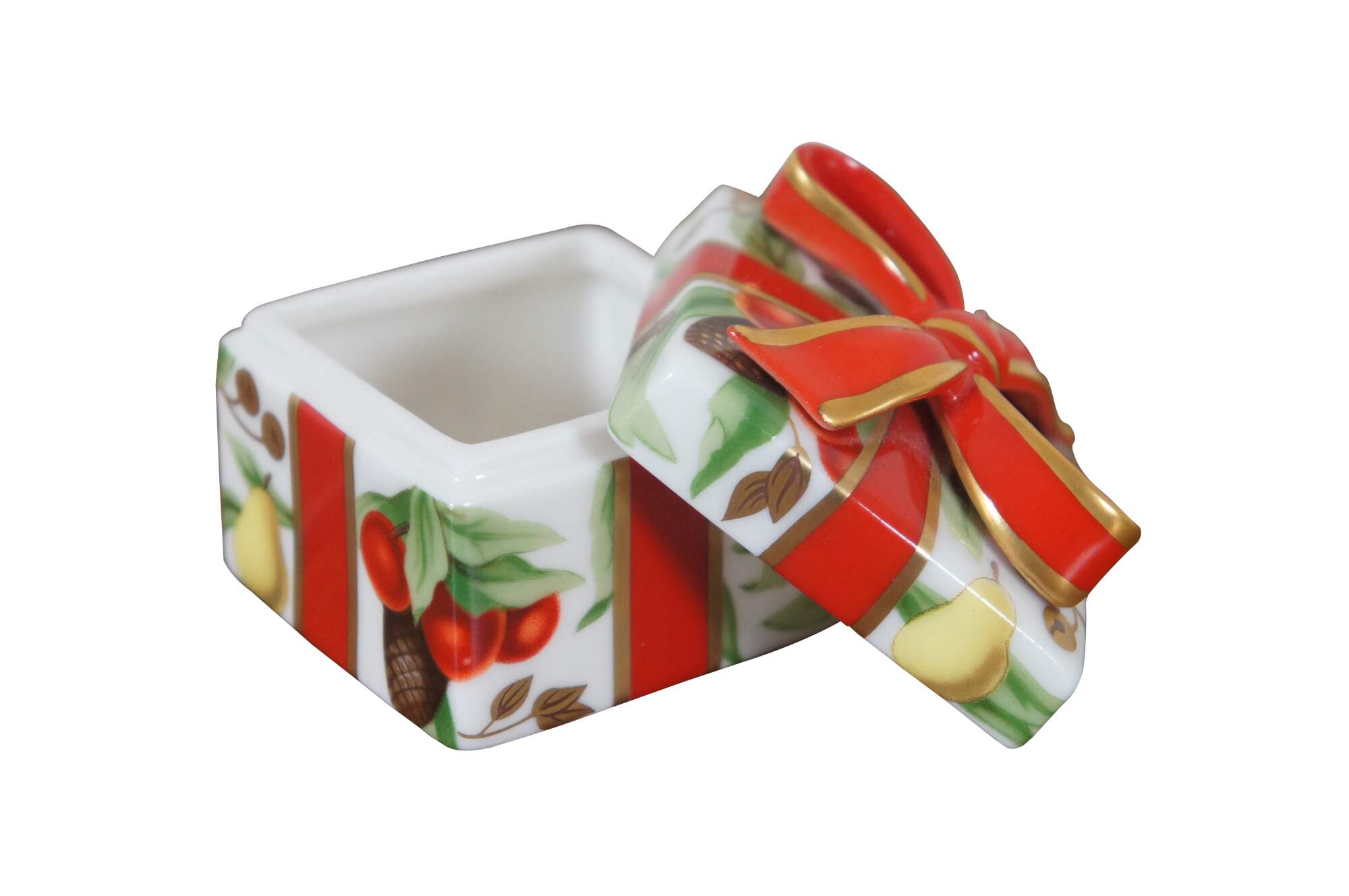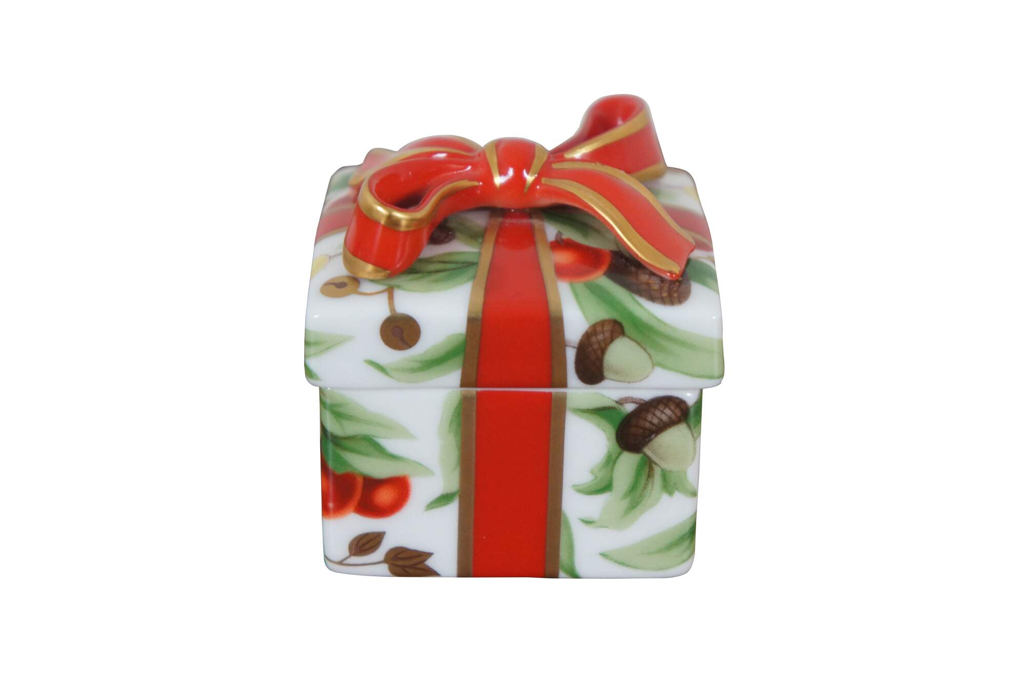Vintage Tiffany and Company "Tiffany Holiday" white porcelain limoge style trinket box in the shape of a square Christmas gift tied with a red bow and hand painted gilt details, litho printed with a design of bells, cherries, pinecones, pears and acorns. Made in Japan.