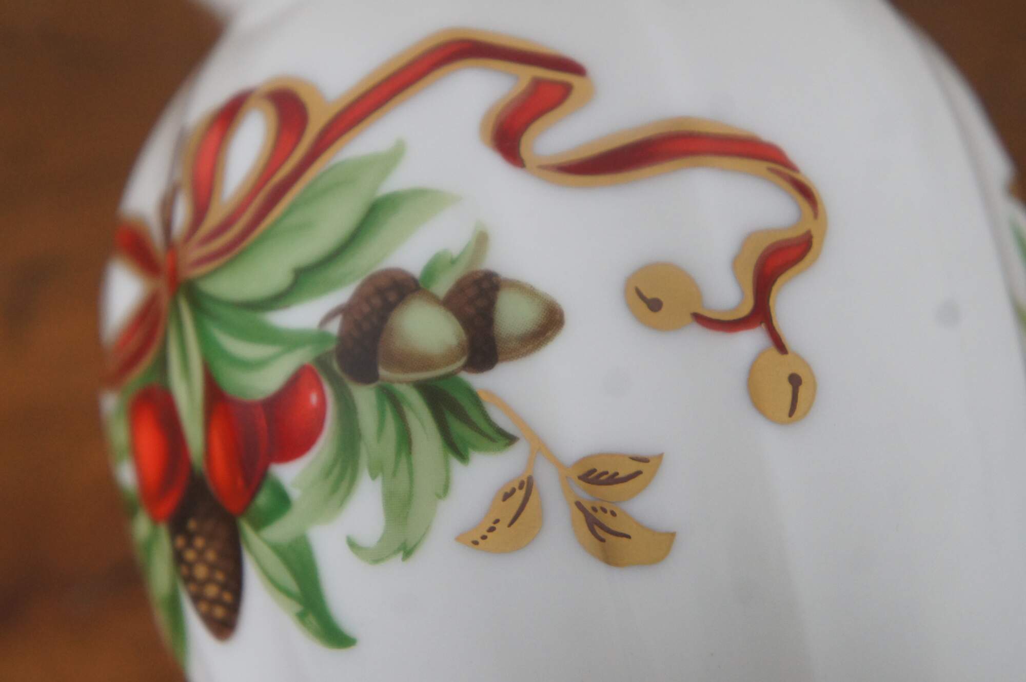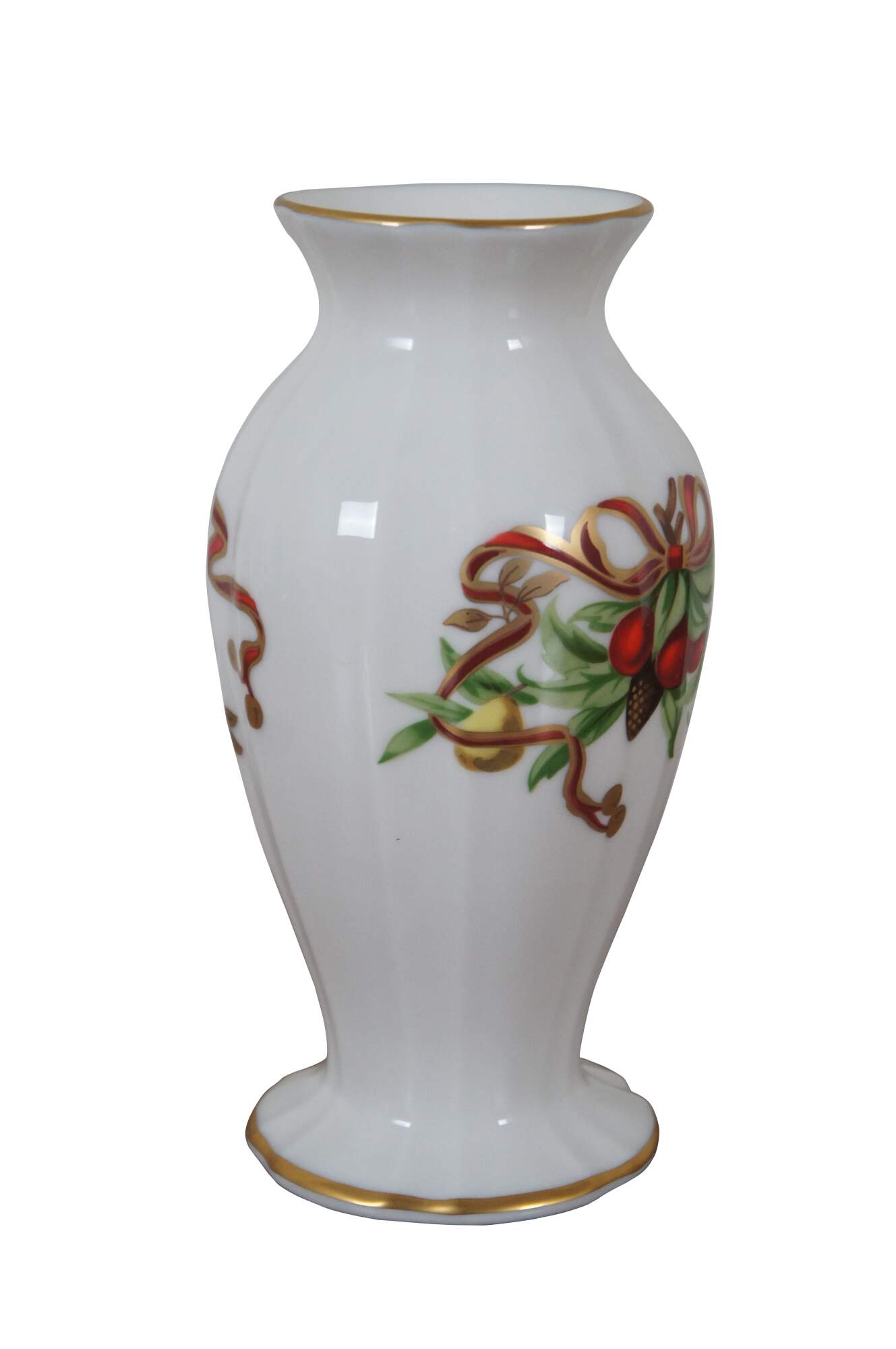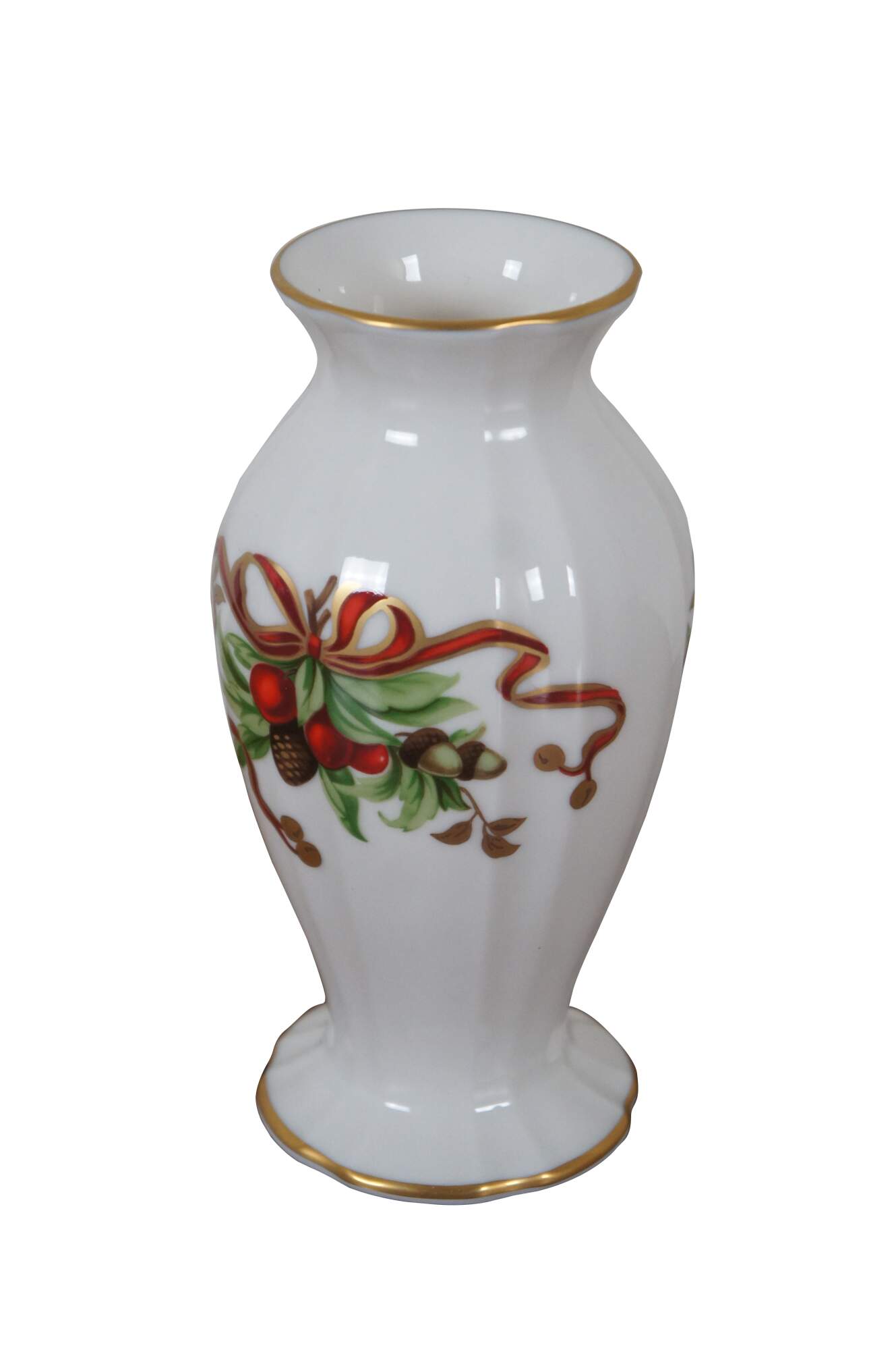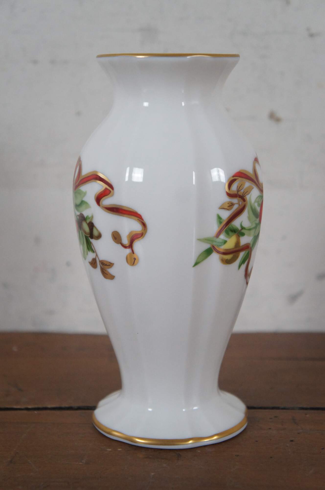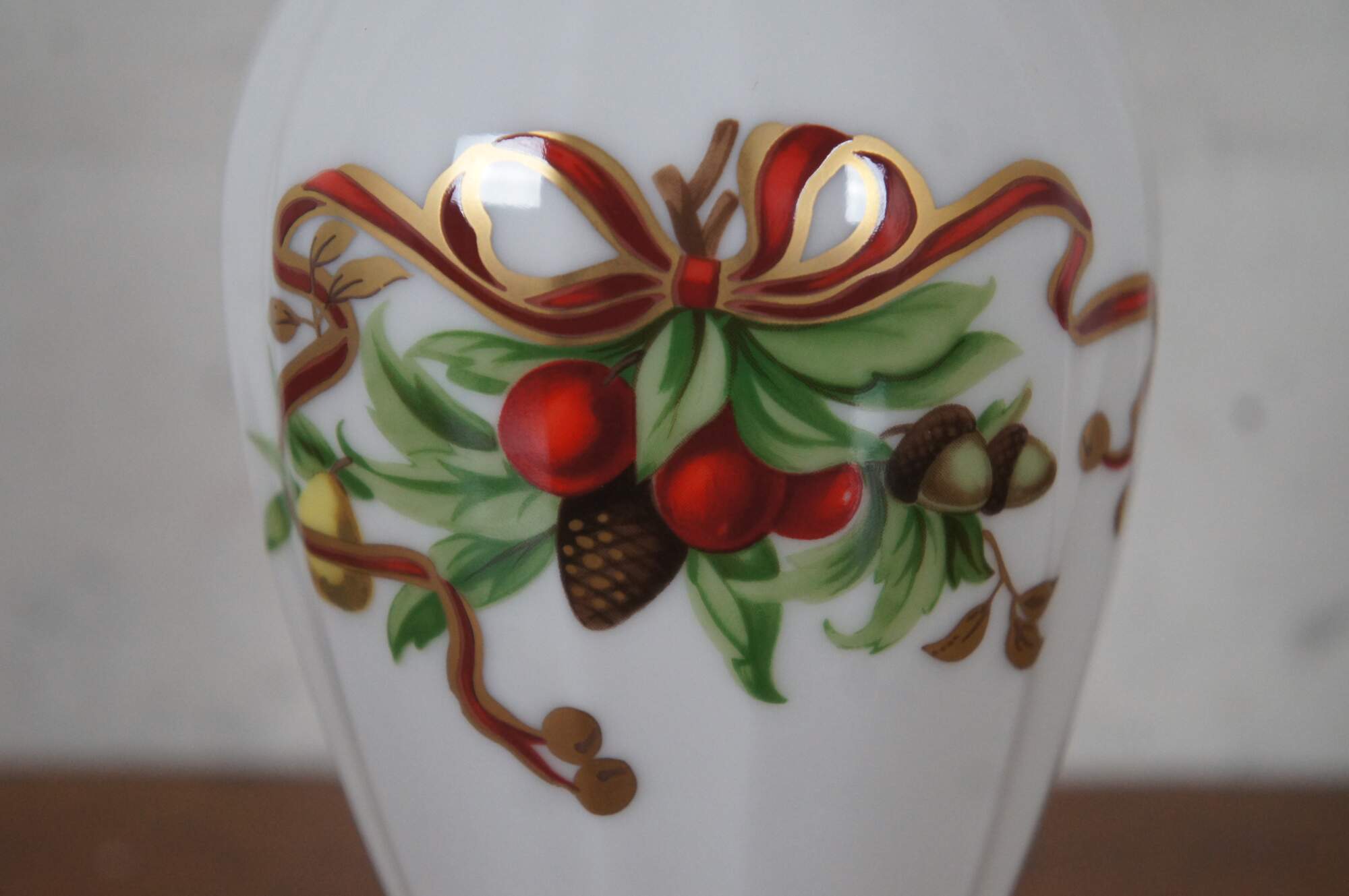 Vintage Tiffany and Company "Tiffany Holiday" white porcelain flower vase, hand painted with gilt details, litho printed with a design of cherries, pinecones, pears, bells, and acorns, tied with a red ribbon. Made in Japan.
