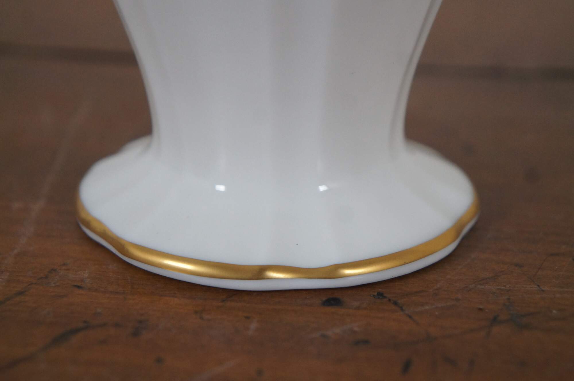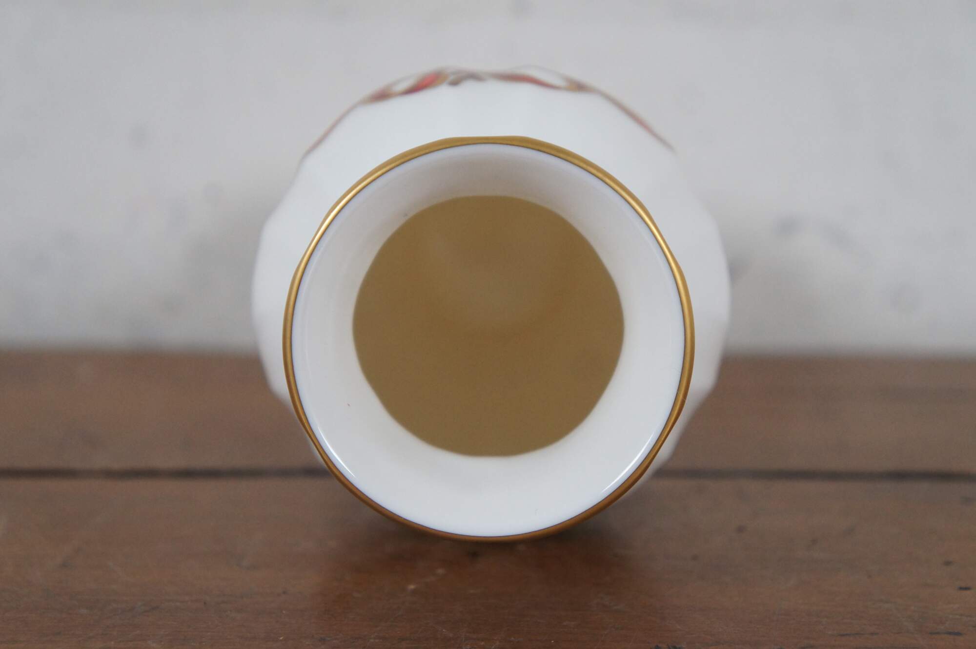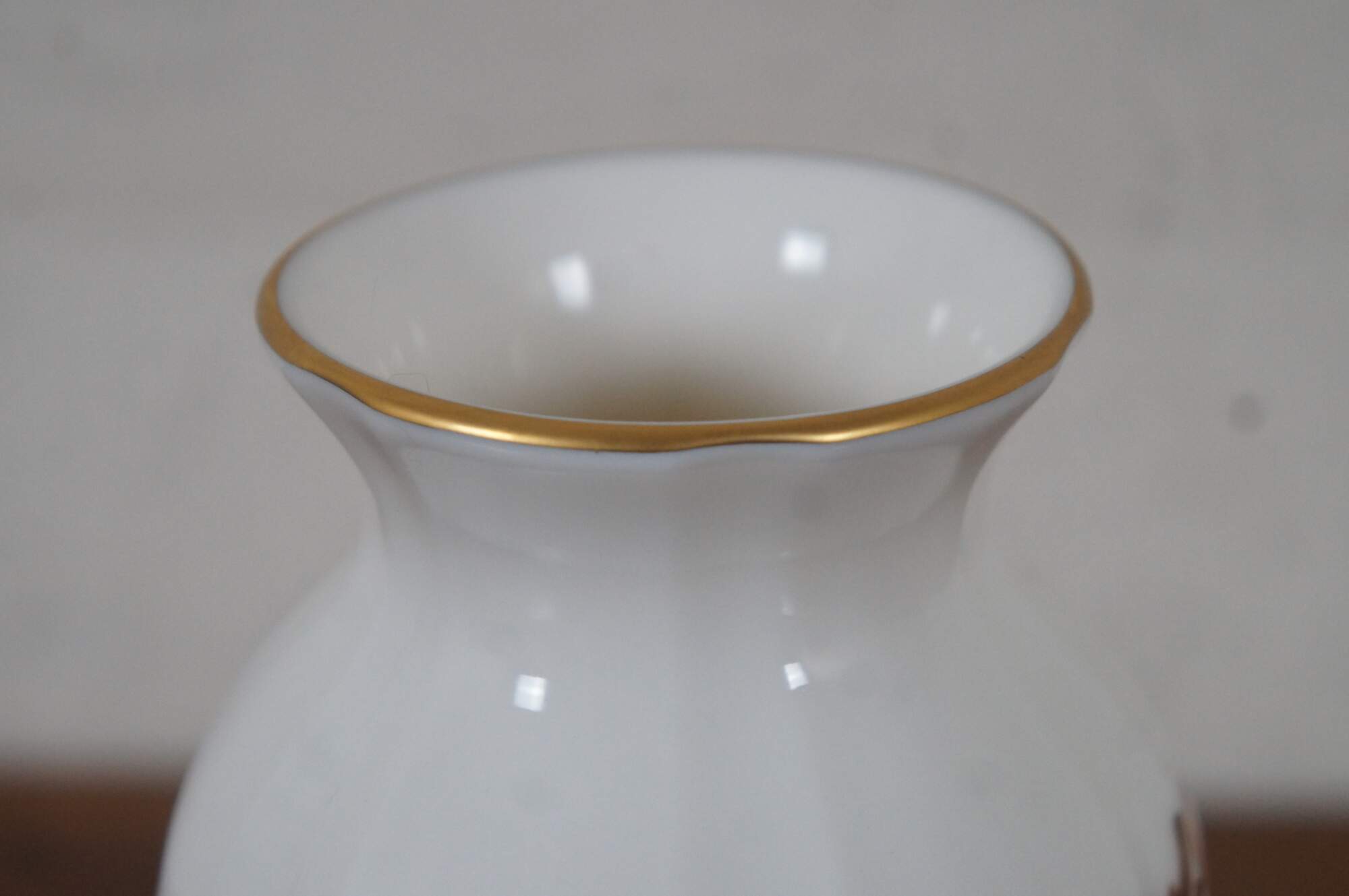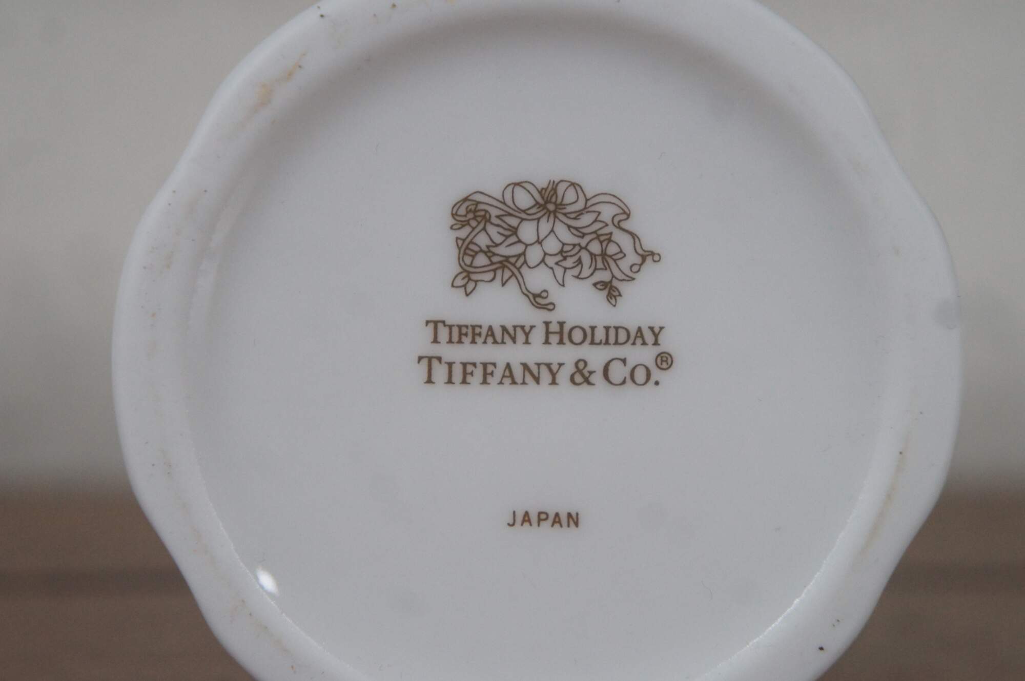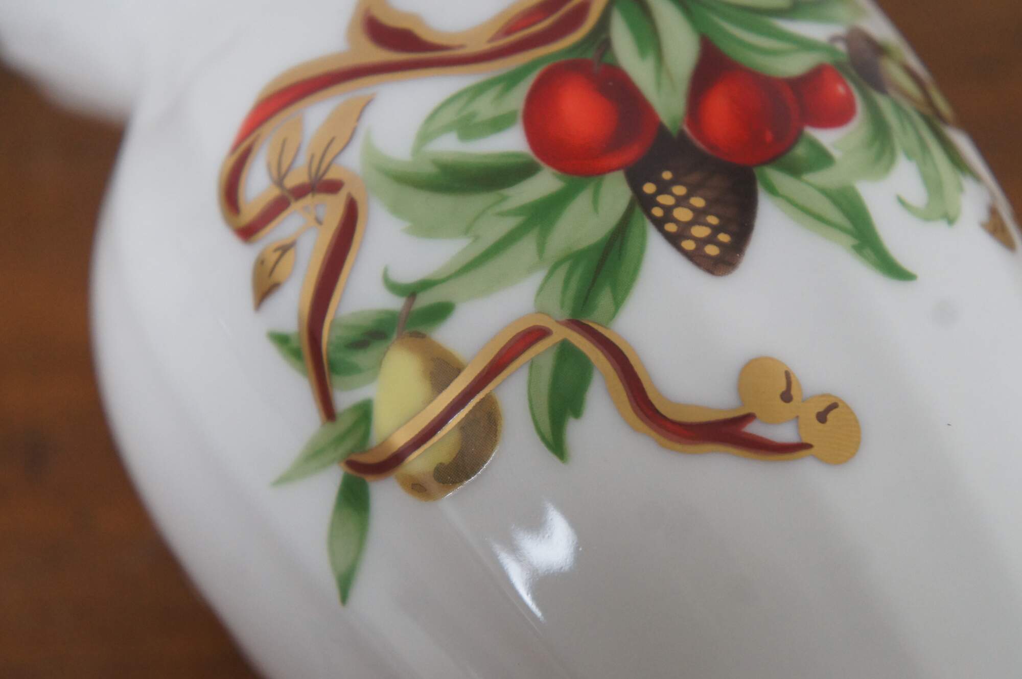 Vintage Tiffany and Company "Tiffany Holiday" white porcelain flower vase, hand painted with gilt details, litho printed with a design of cherries, pinecones, pears, bells, and acorns, tied with a red ribbon. Made in Japan.
