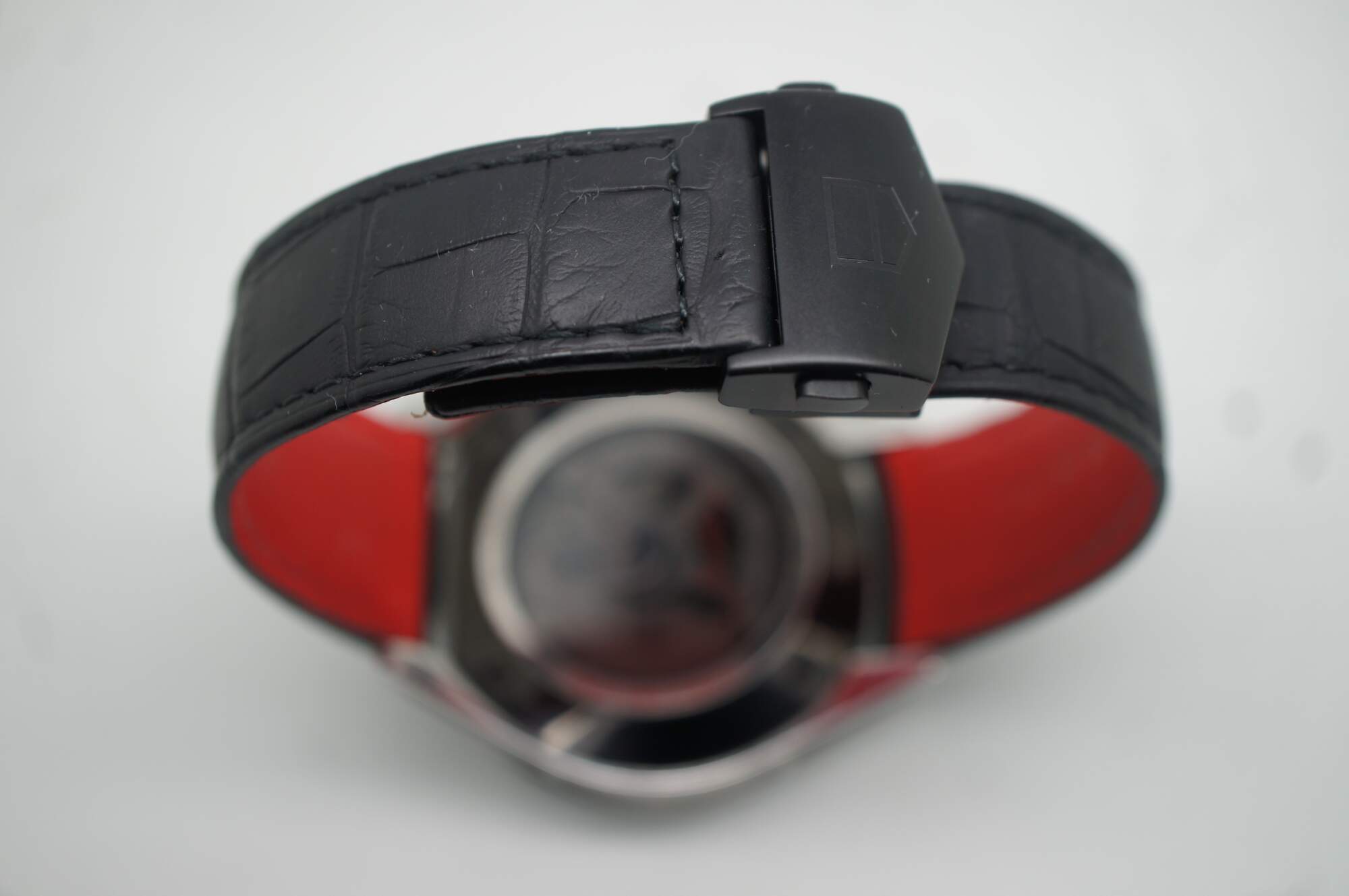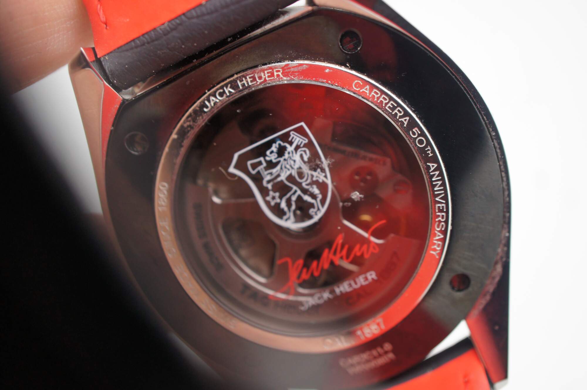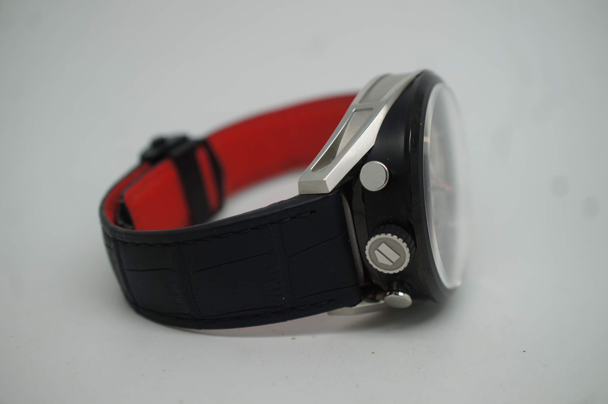 Tag Heuer - Jack Heuer - Carrera 50th Anniversary Swiss made wrist watch. Charcoal gray and silver face, framed in a black case with brushed silver side panels.Tachymetre, Pulsometer, Chronograph, Date Indicator. Black leather band with red interior. CAR2C11-1 / WRW0801. Includes original packaging, box and instruction booklet.