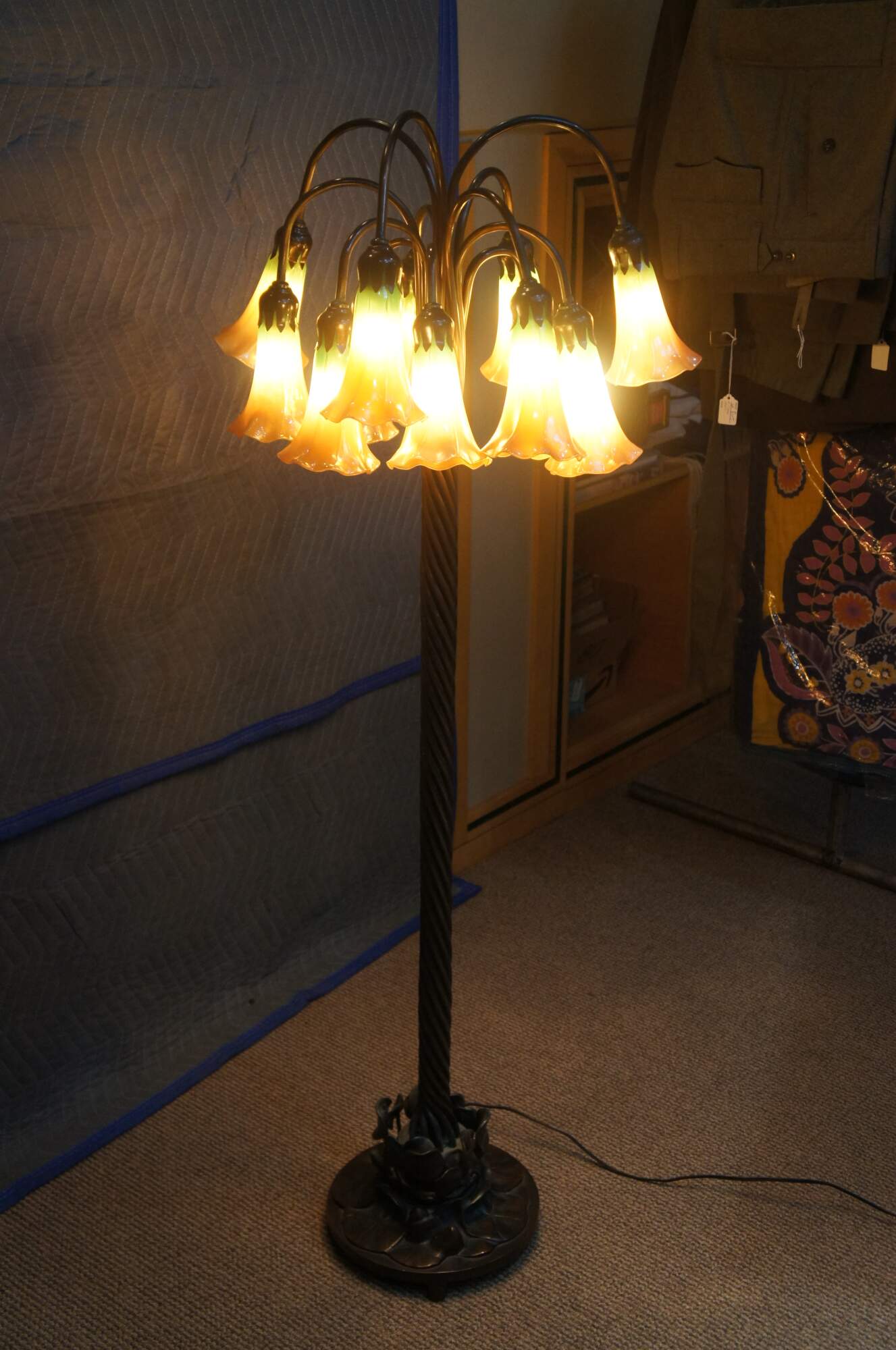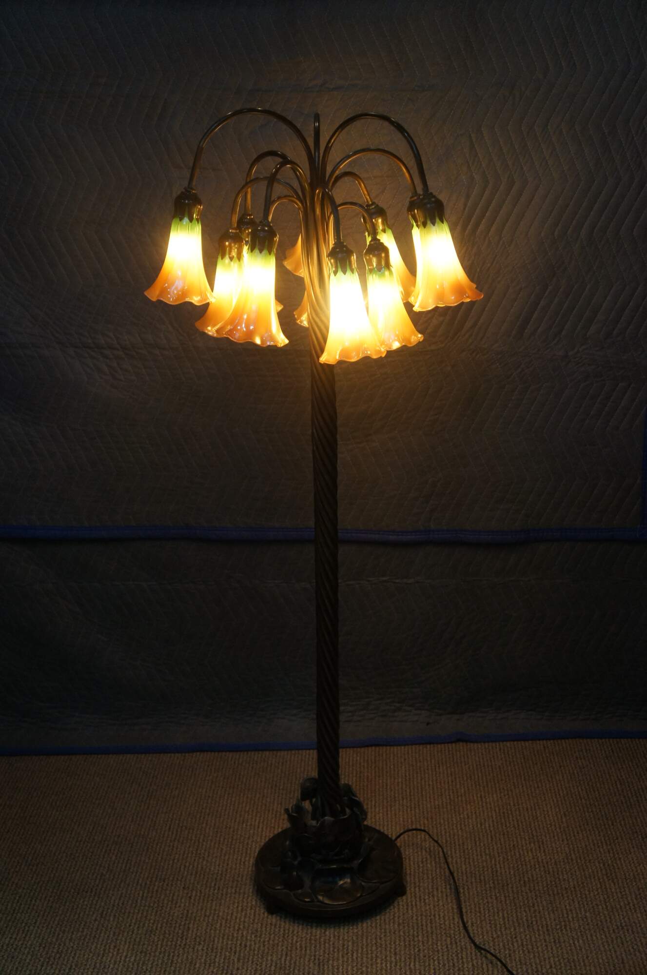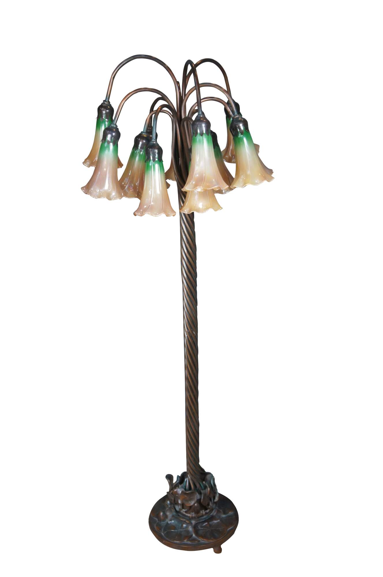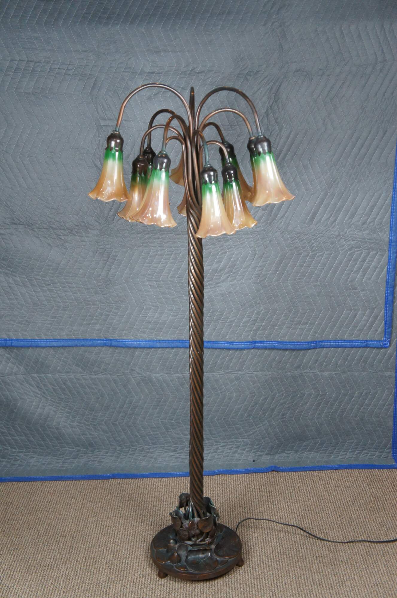 Vintage Tiffany style heavy bronze and copper floor lamp featuring Art Nouveau styling with twisted column and lily pad base supporting twelve floral tulip flared glass shades. Signed along interior of Lilly base. Lamp includes two extra shades. An astounding beauty when lit.