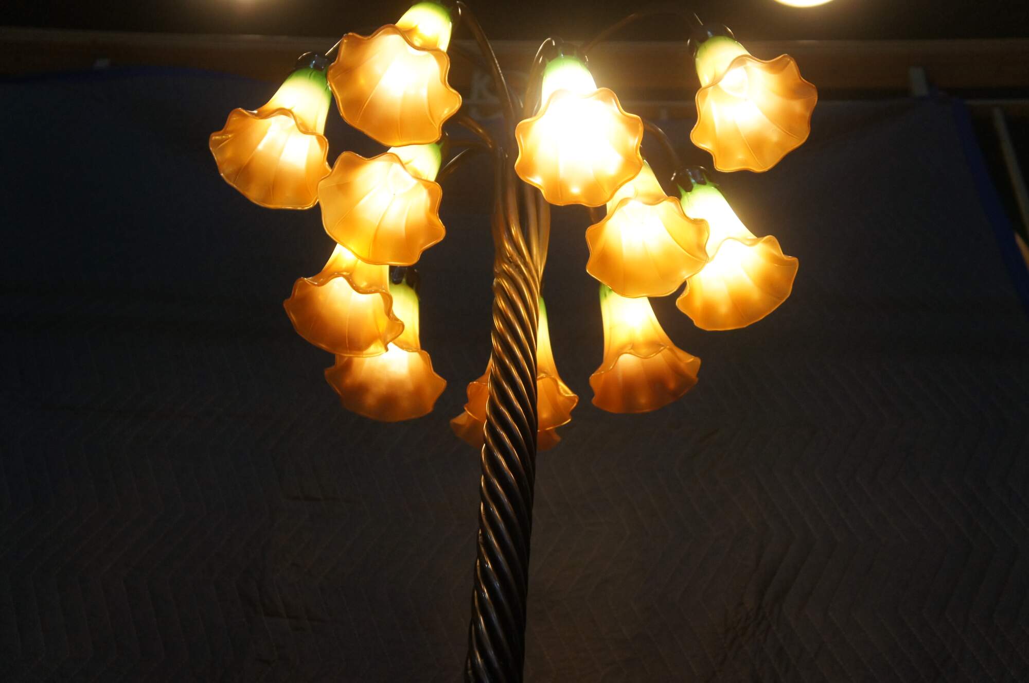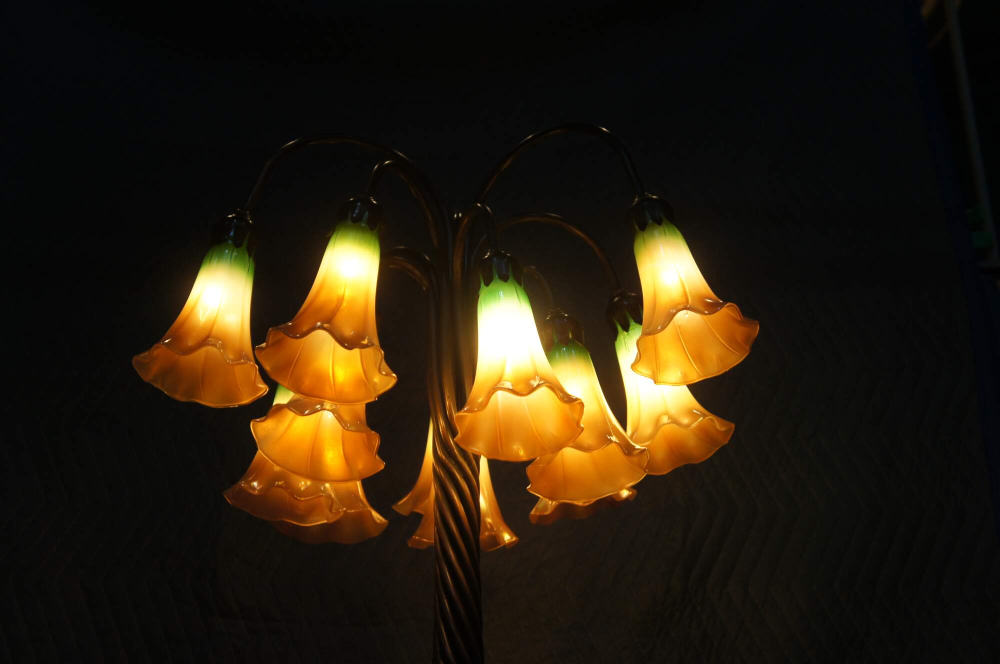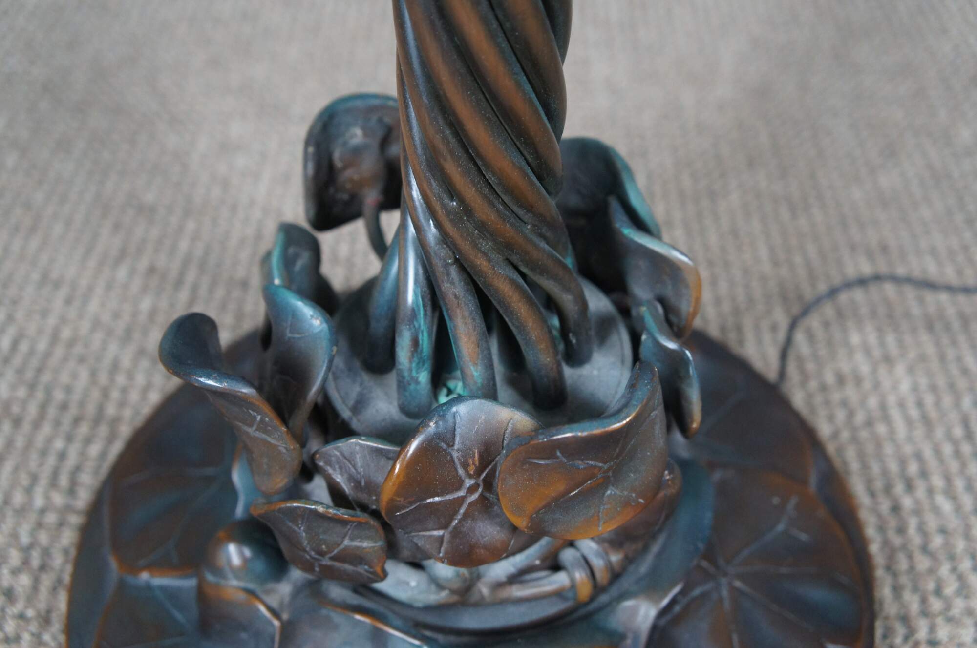 Vintage Tiffany style heavy bronze and copper floor lamp featuring Art Nouveau styling with twisted column and lily pad base supporting twelve floral tulip flared glass shades. Signed along interior of Lilly base. Lamp includes two extra shades. An astounding beauty when lit.