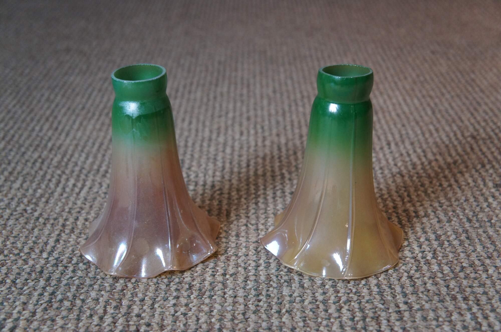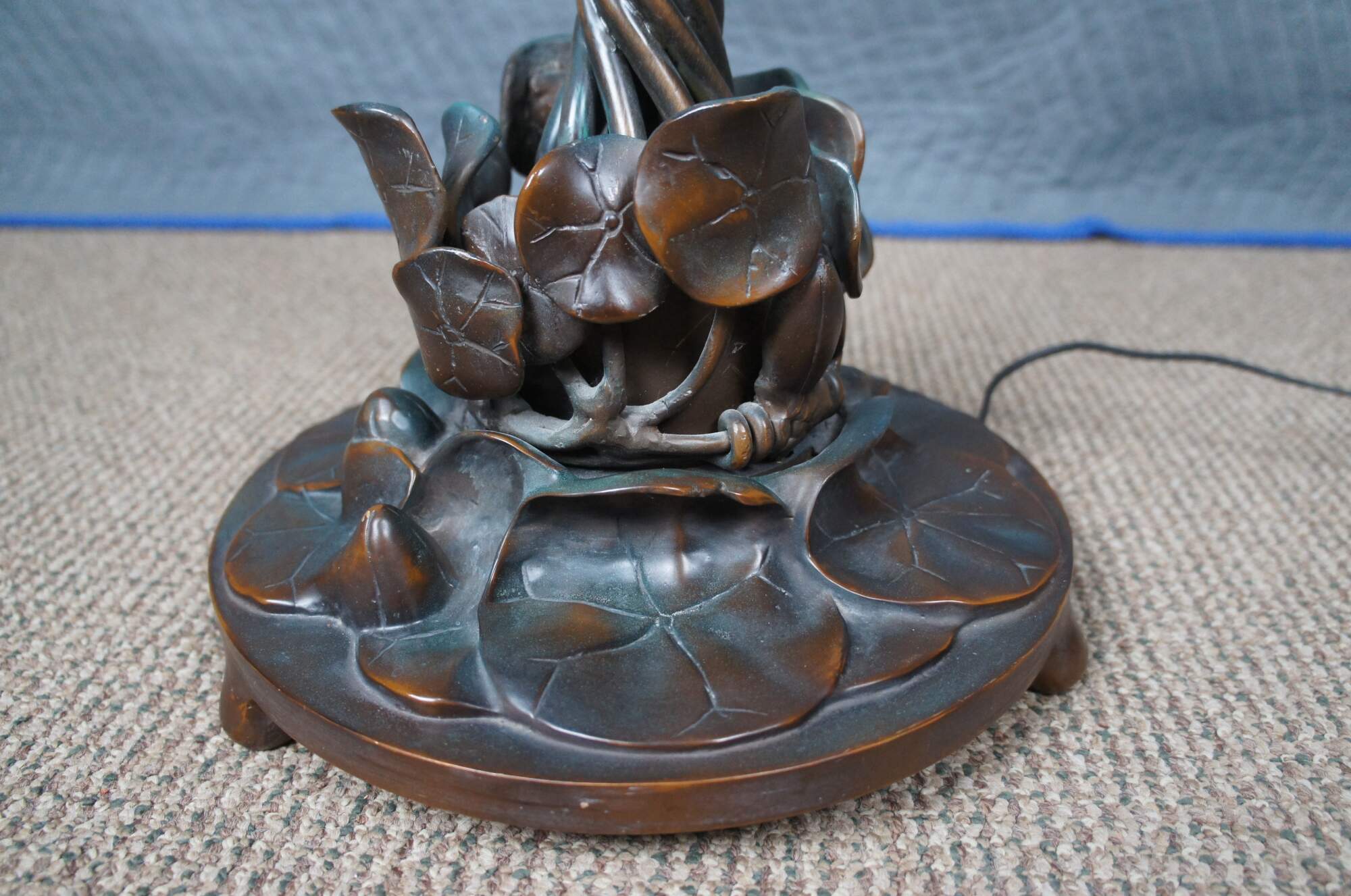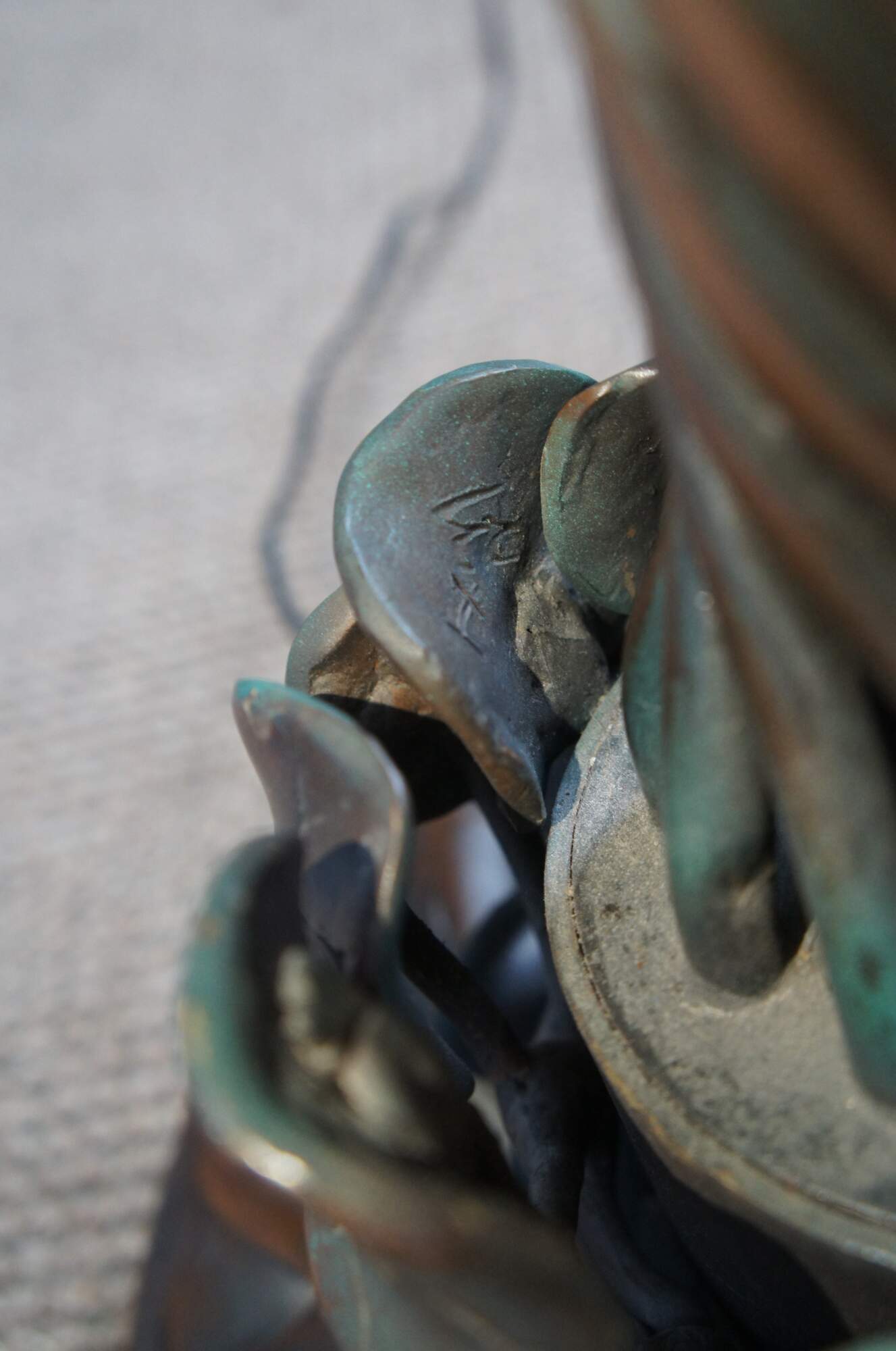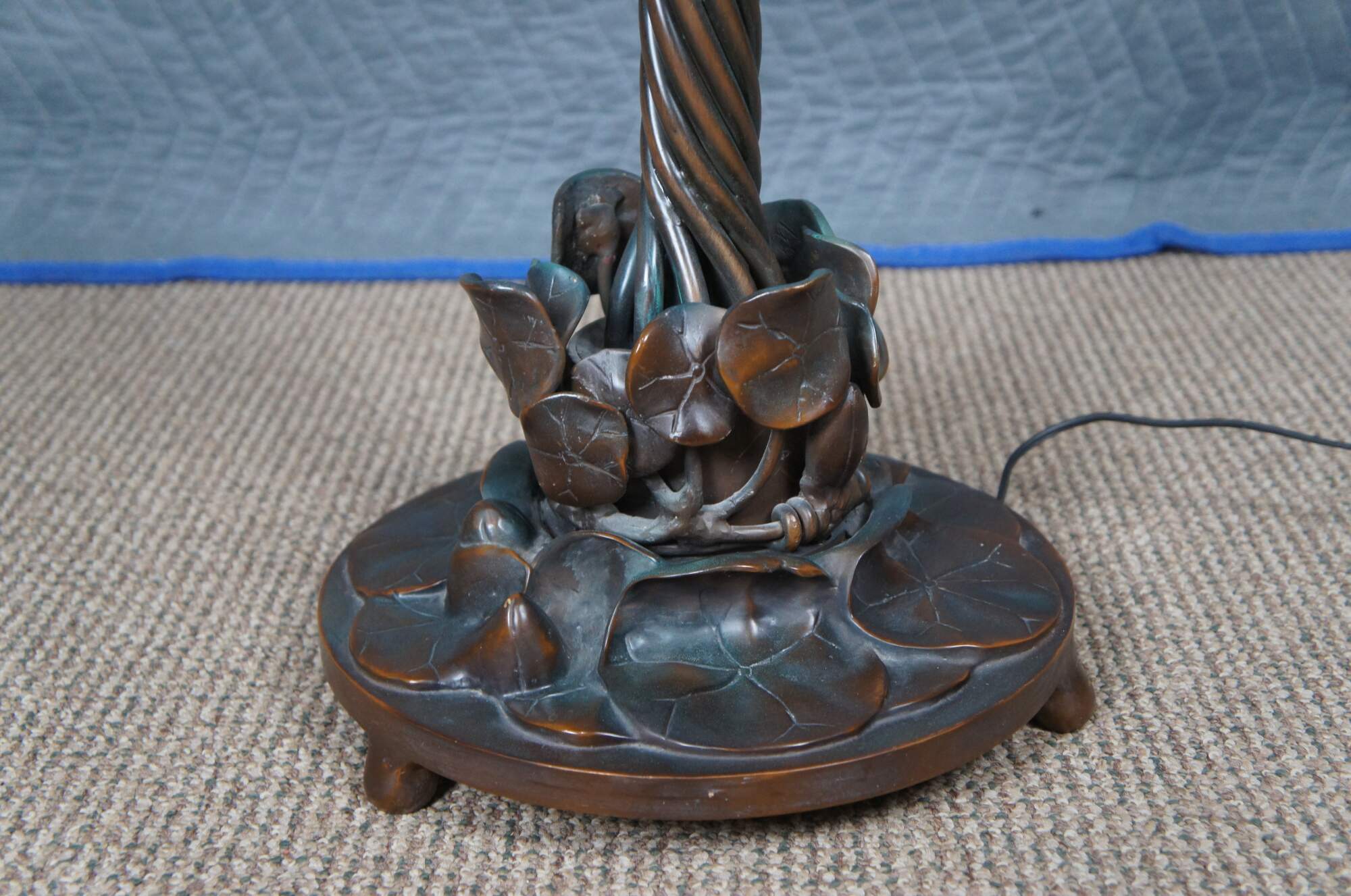 Vintage Tiffany style heavy bronze and copper floor lamp featuring Art Nouveau styling with twisted column and lily pad base supporting twelve floral tulip flared glass shades. Signed along interior of Lilly base. Lamp includes two extra shades. An astounding beauty when lit.