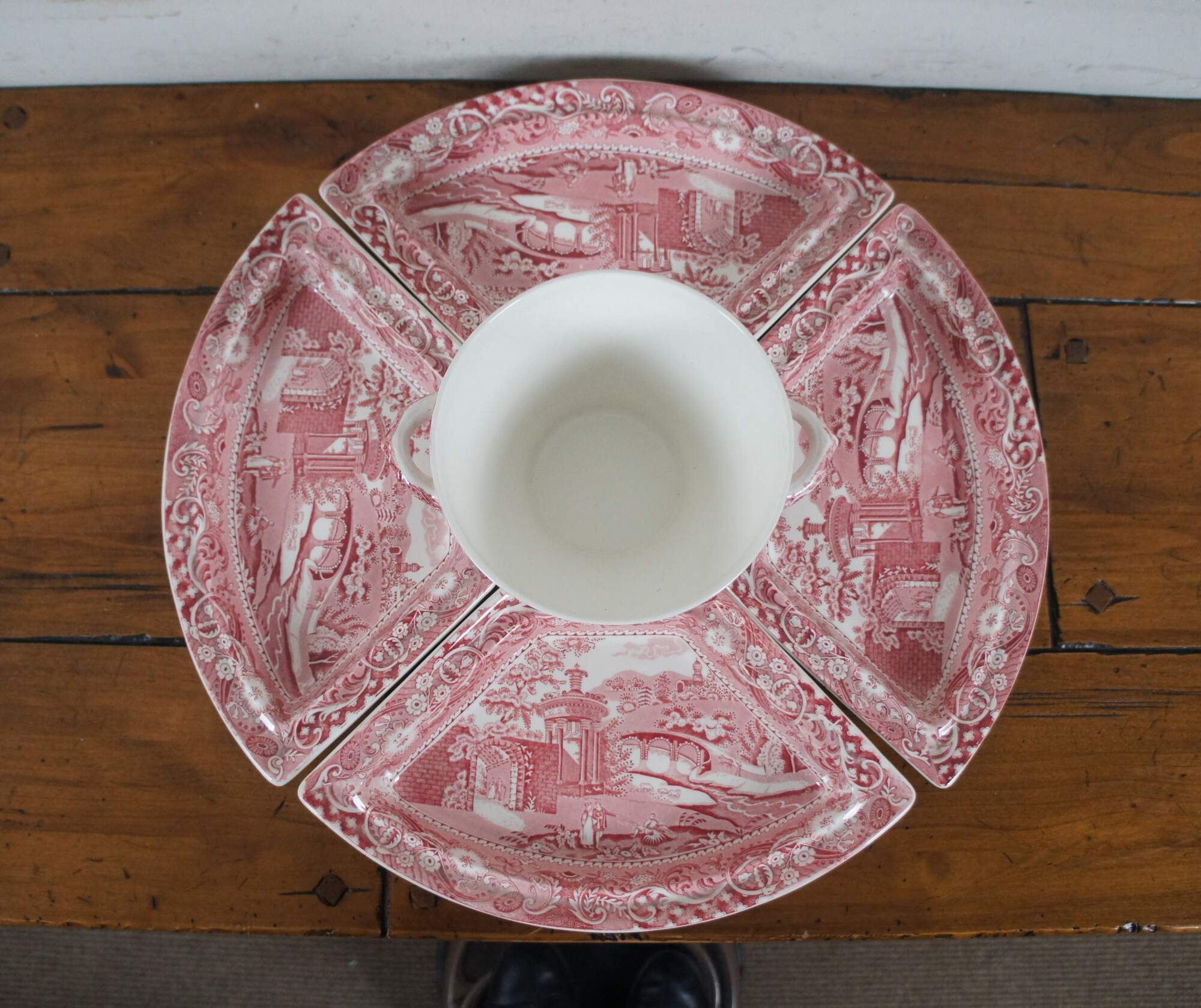 Antique rare complete supper set by W.R. Midwinter in the Landscape pattern, including four lidded crescent shaped serving dishes, tall lidded soup tureen and matching ladle. Designed to fit on a 21" lazy susan.