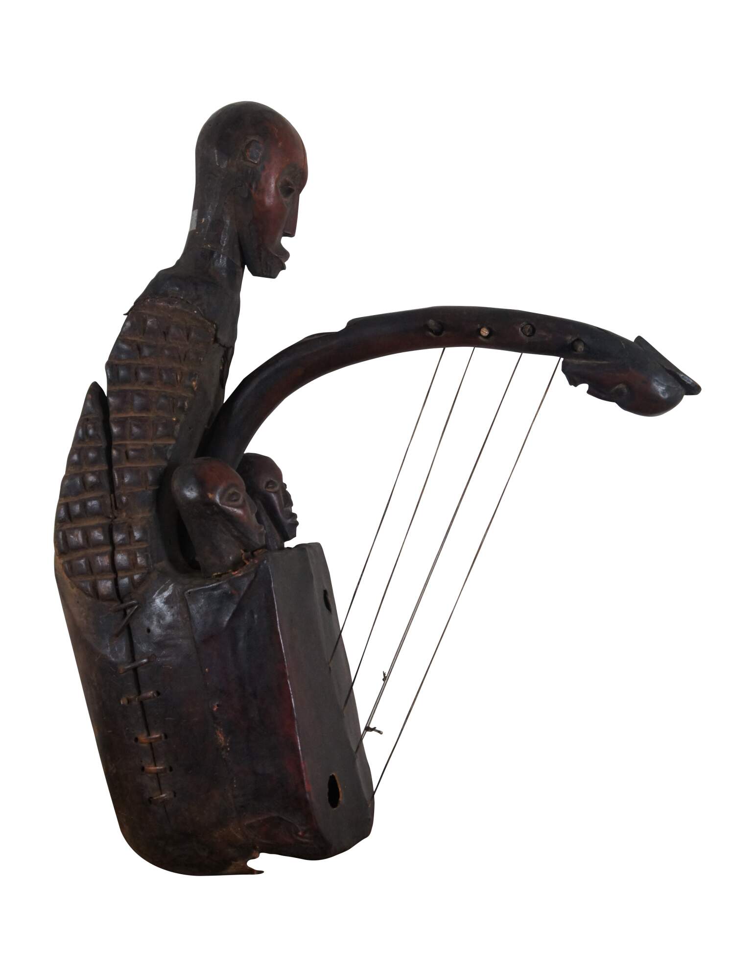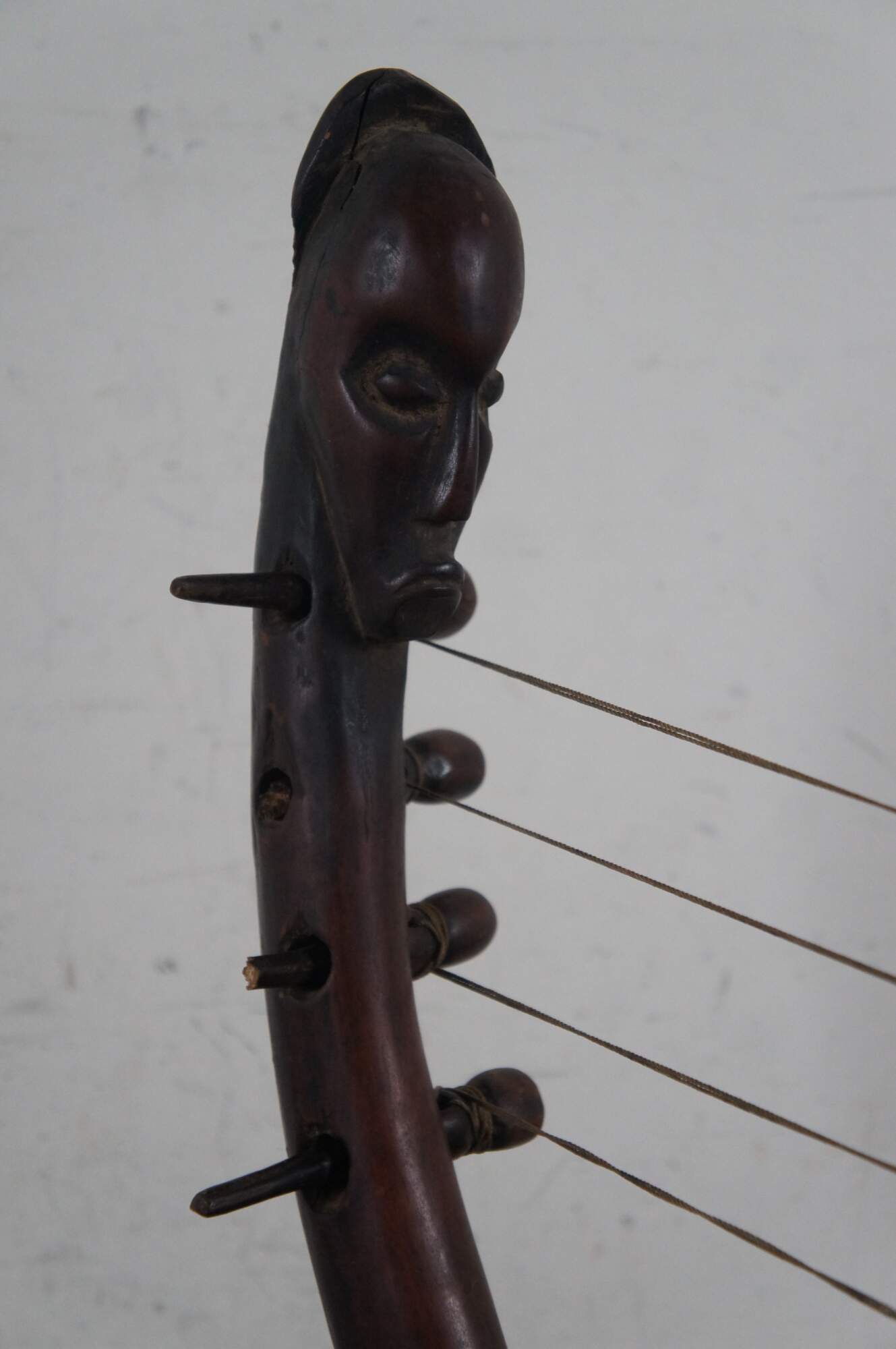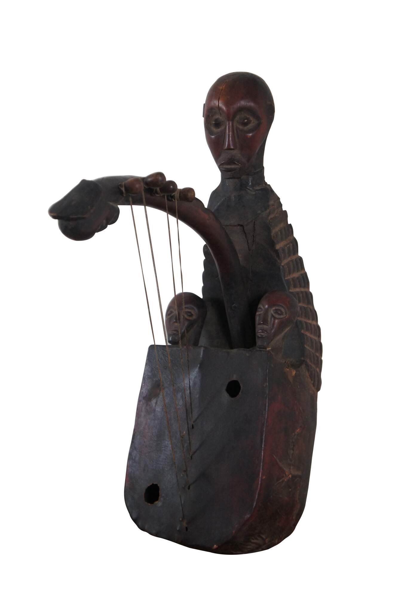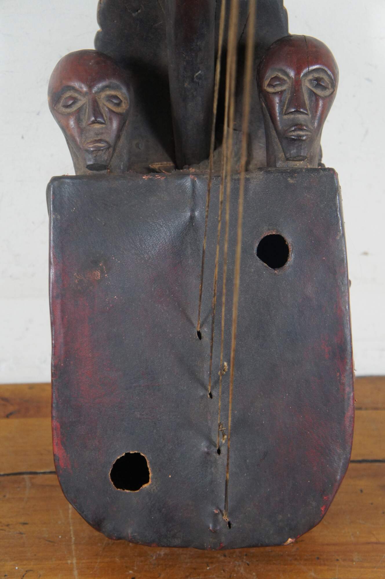 Rare vintage museum quality African Mangbetu fertility harp / domu, an African stringed instrument of the Mangbetu poeple, featuring a round wooden body, stretched red leather head with two sounding holes and four strings on pegs. Hand carved, in the shape of a wooden figure wearing a textured cloak or robe, flanked by two carved heads at the base of the instruments neck, which terminates in a fourth human face. Mauwotu.