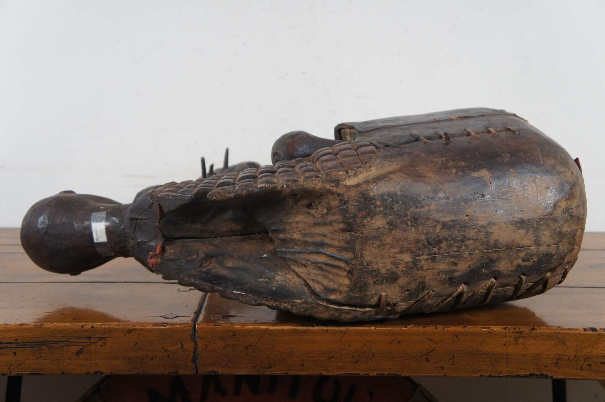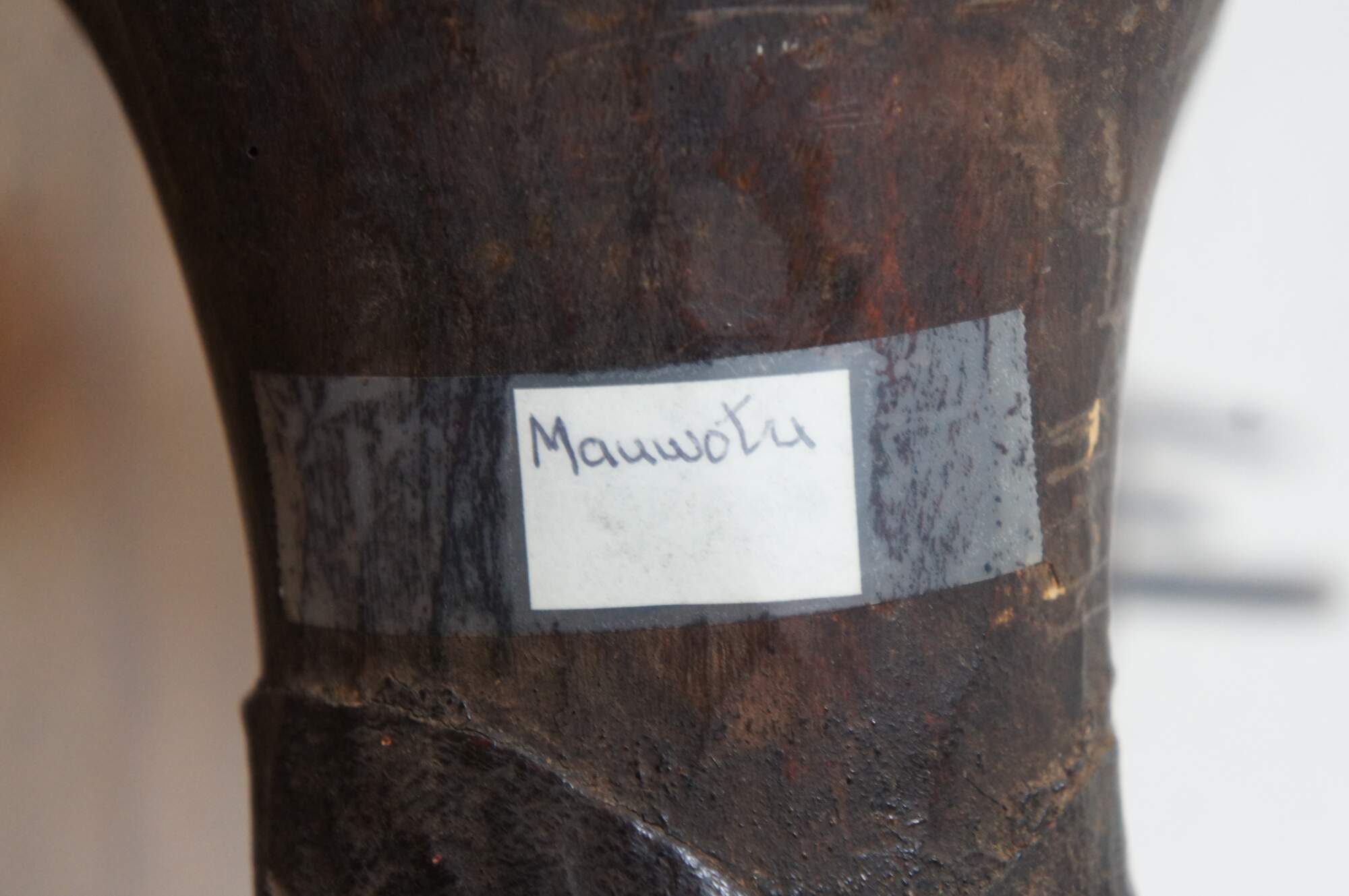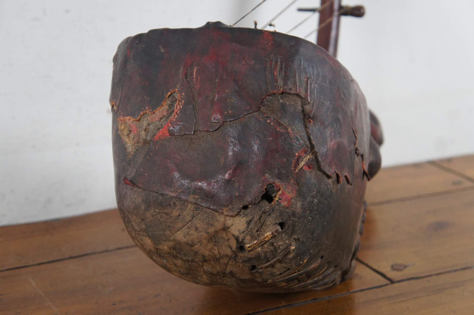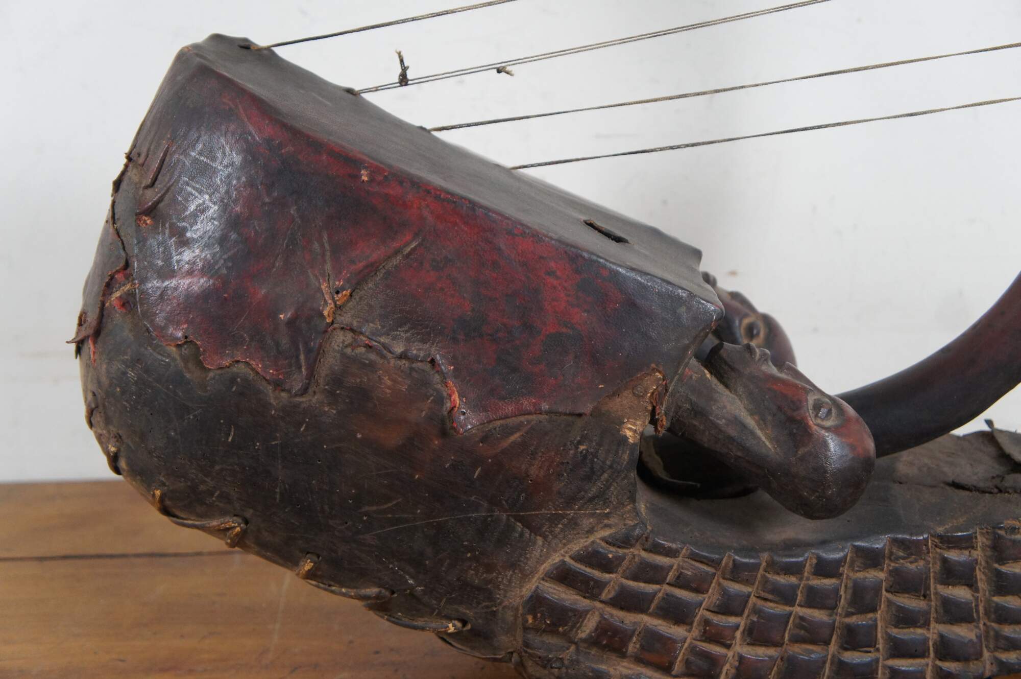 Rare vintage museum quality African Mangbetu fertility harp / domu, an African stringed instrument of the Mangbetu poeple, featuring a round wooden body, stretched red leather head with two sounding holes and four strings on pegs. Hand carved, in the shape of a wooden figure wearing a textured cloak or robe, flanked by two carved heads at the base of the instruments neck, which terminates in a fourth human face. Mauwotu.