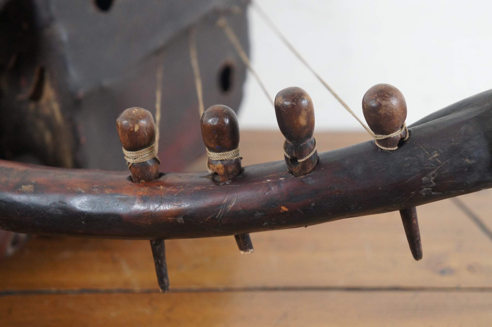 The harp first appeared in Mangbetu culture some time in the late nineteenth century, and reached its peak during the colonial period of the early twentieth century. Many believe that the initial practice of carving representations of human heads was adopted from the neighboring Azande peoples to the north. As cultural and musical traditions have changed over the years in Mangbetu culture, musical instruments have appeared and disappeared. Some Mangbetu elders claim that the heads of the harp represented Queen Nenzima and King Yangala, and that after their deaths the practice of that particular style gradually declined. Today, harps are no longer found in Mangbetu society." (Source: The Metrololitan Museum of Art)