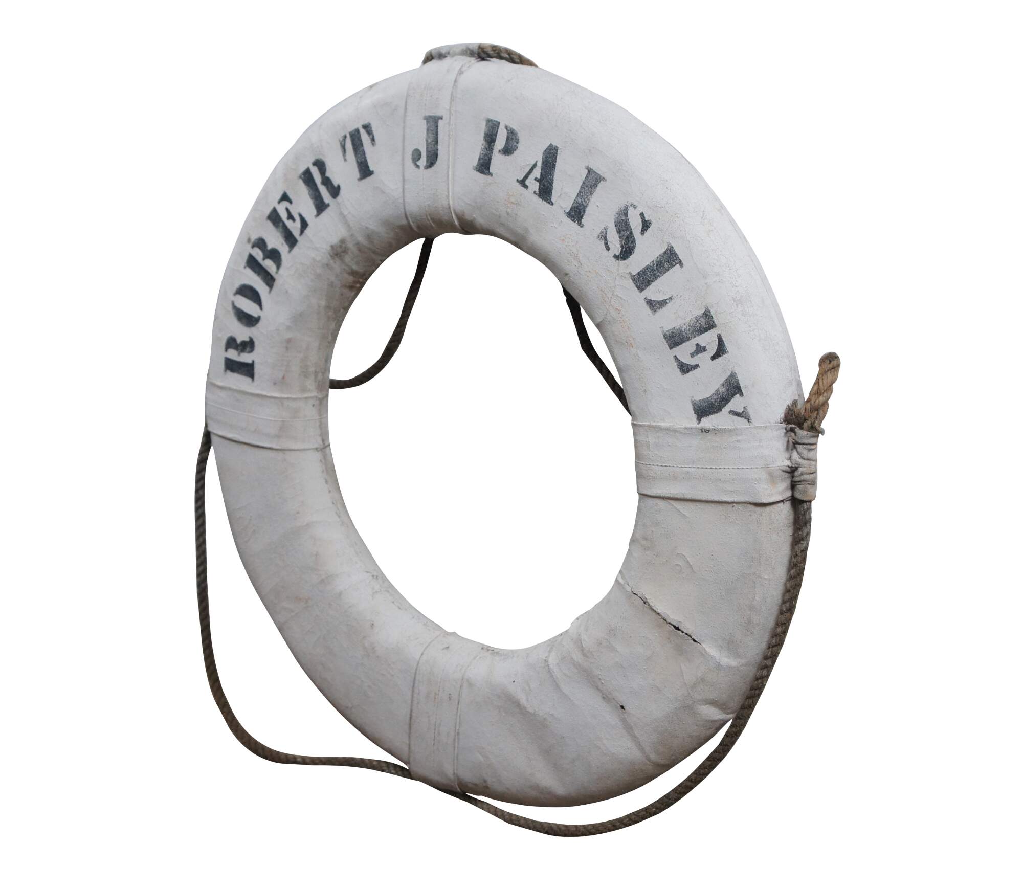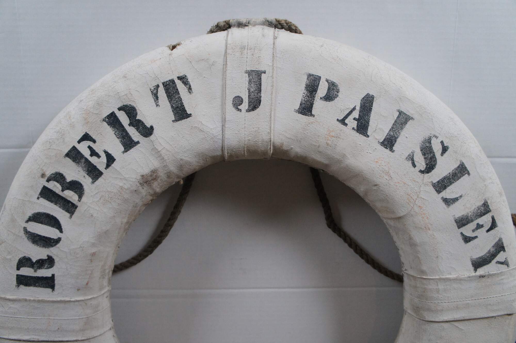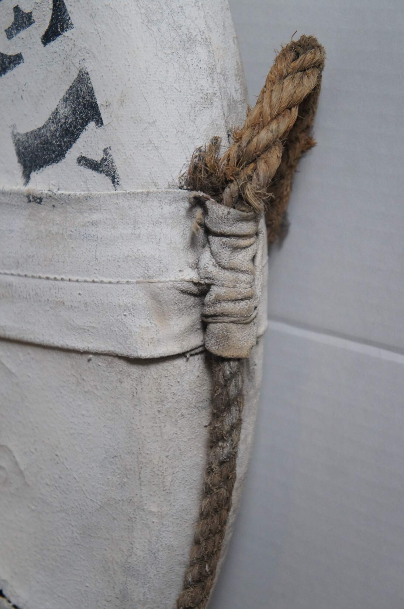 Antique Robert J. Paisley boat life preserver buoy safety ring featuring a hard foam core with a white painted canvas cover and hemp rope handles.