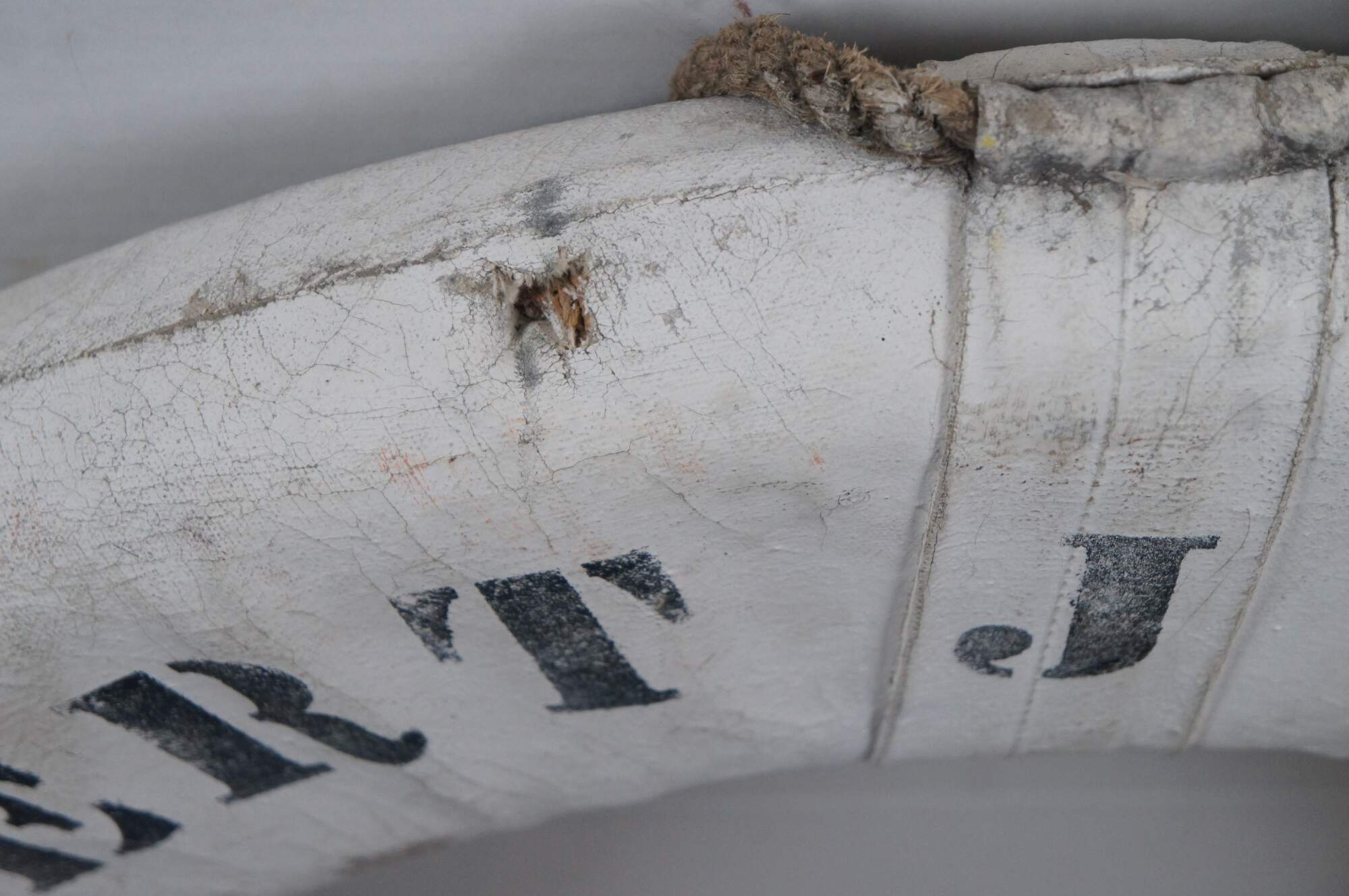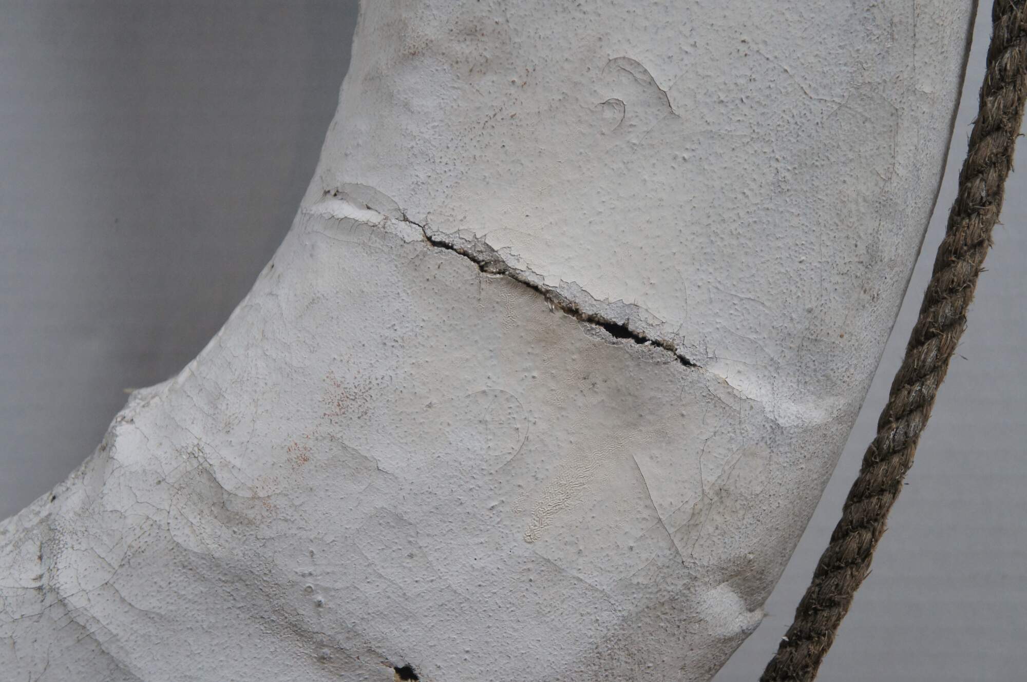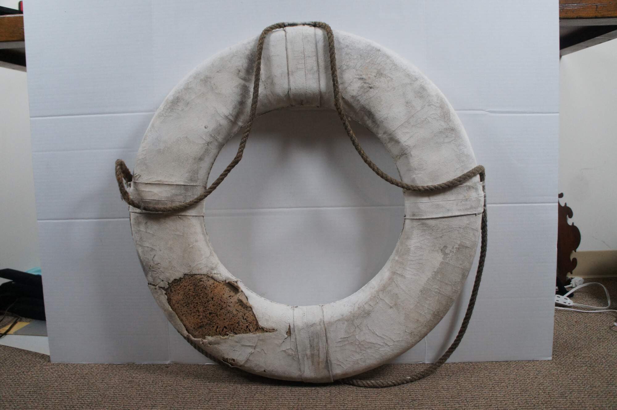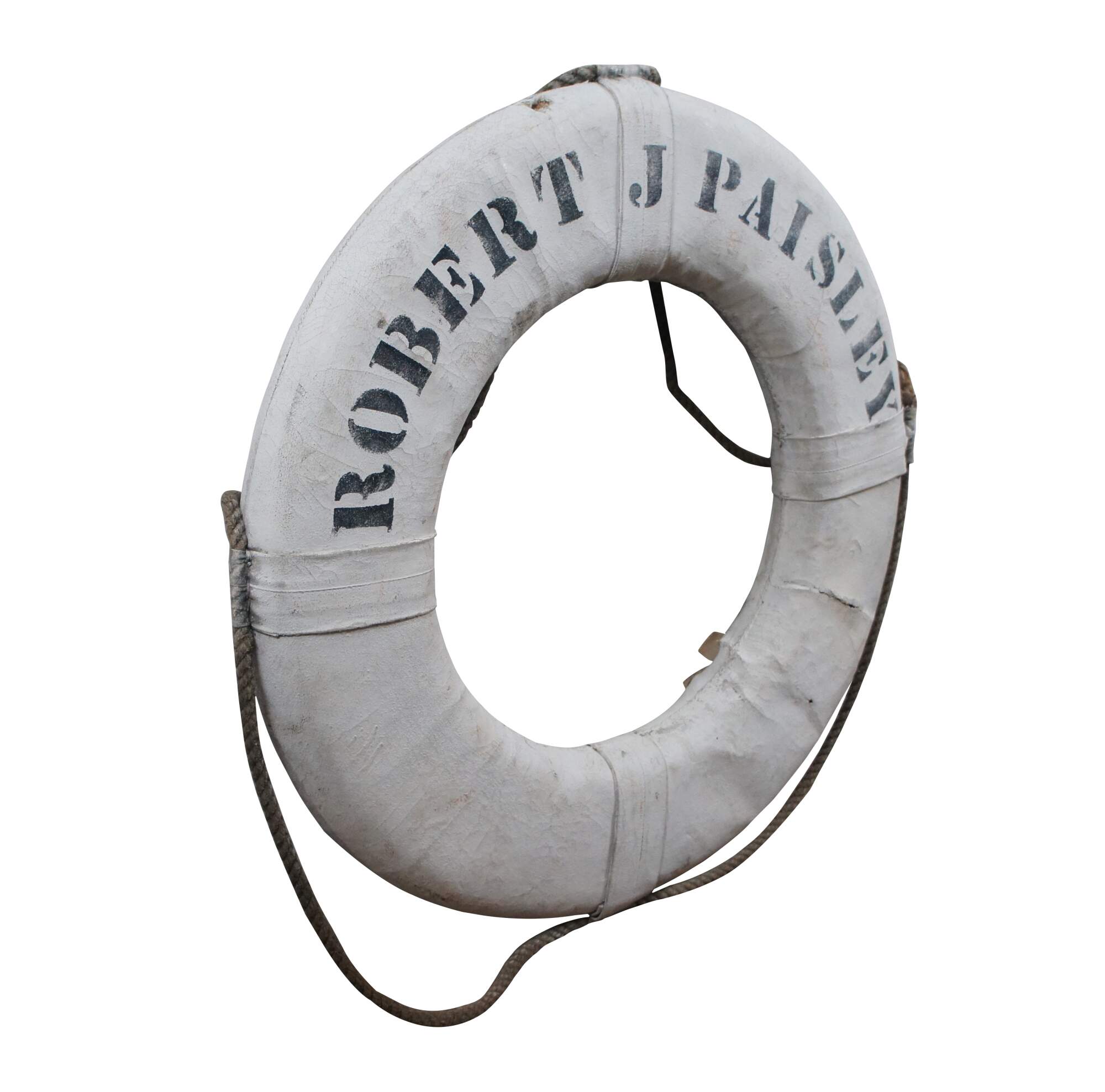 Antique Robert J. Paisley boat life preserver buoy safety ring featuring a hard foam core with a white painted canvas cover and hemp rope handles.