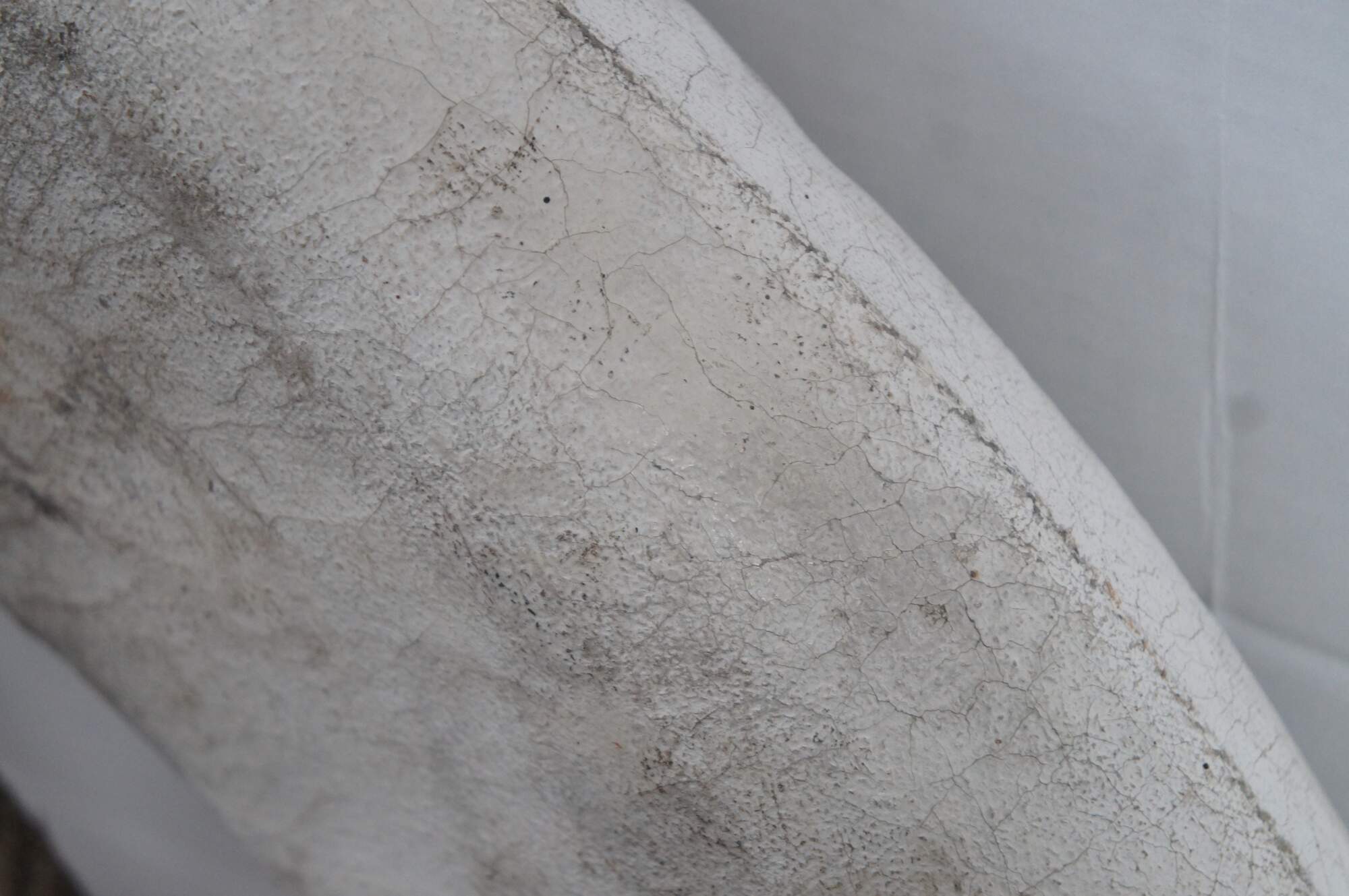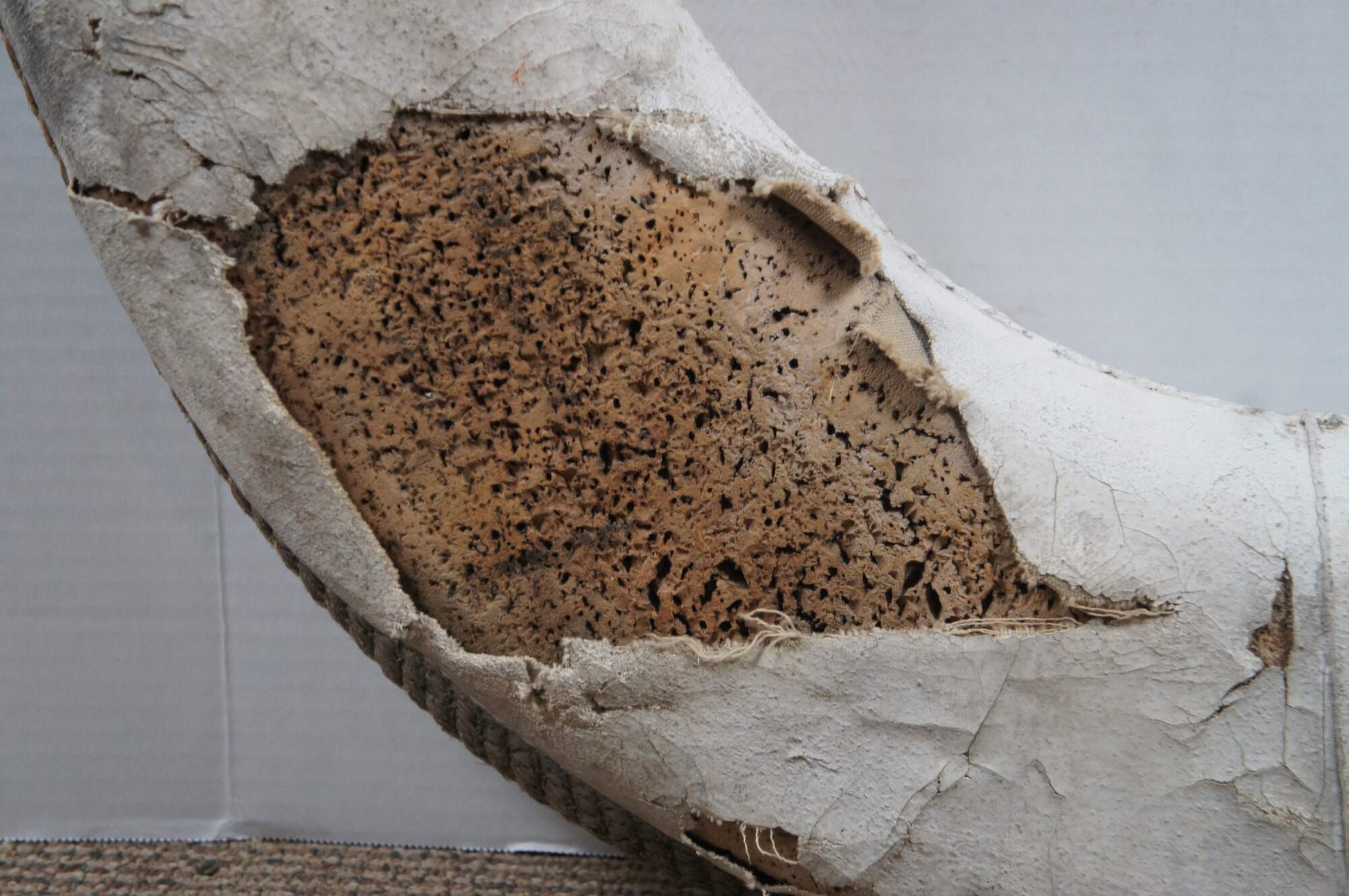 Good Overall - Some stains/discoloration; cracking/splits in canvas; one torn section of canvas on back, puncture to front