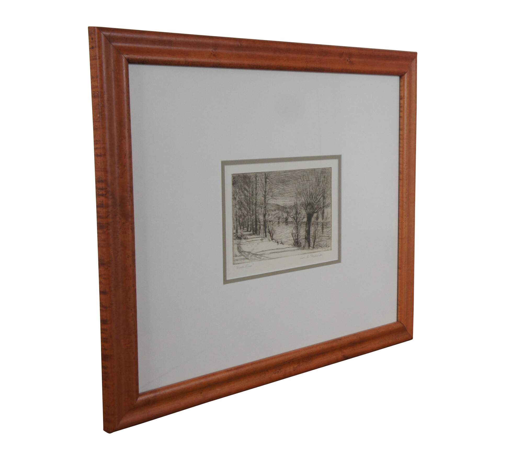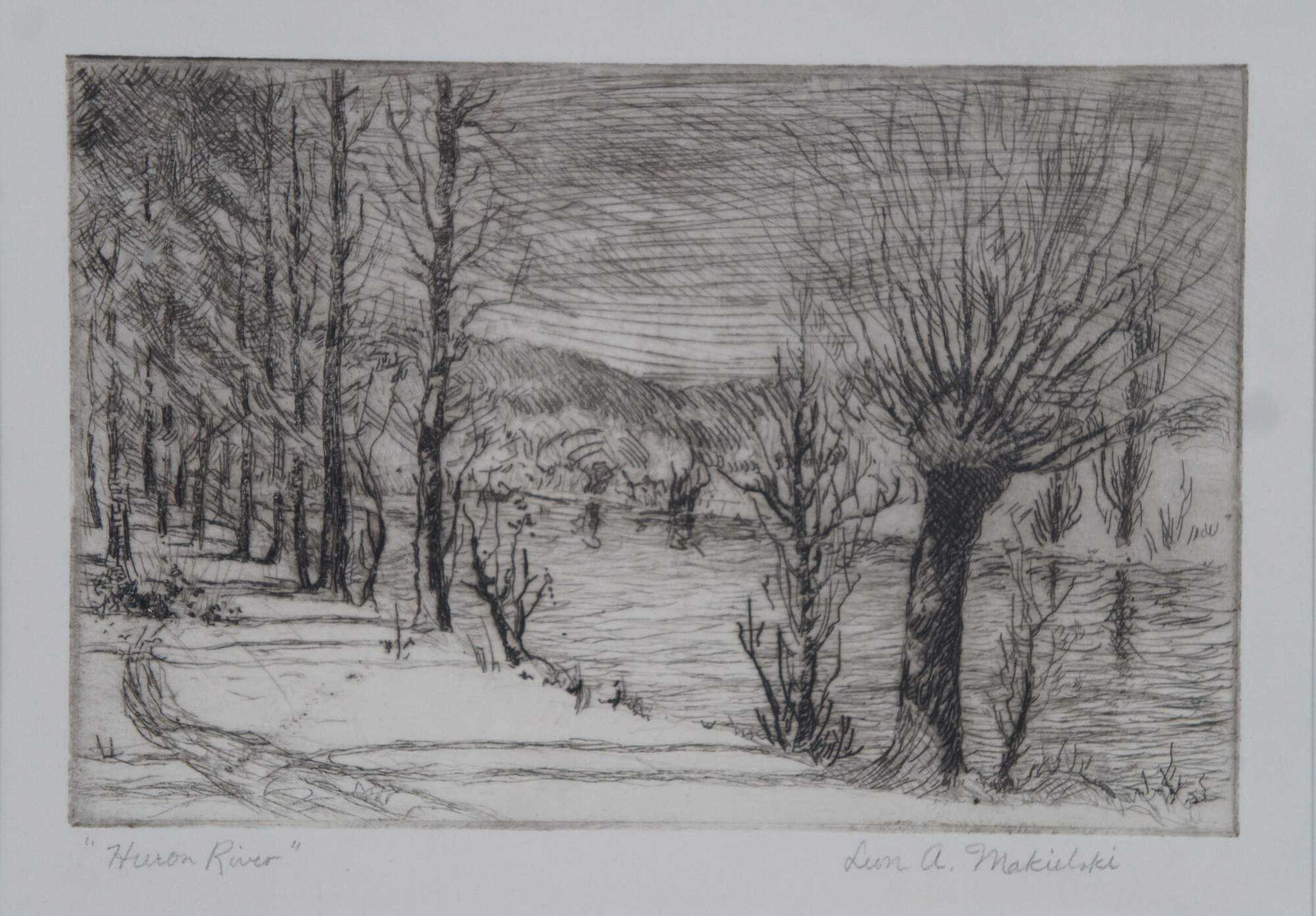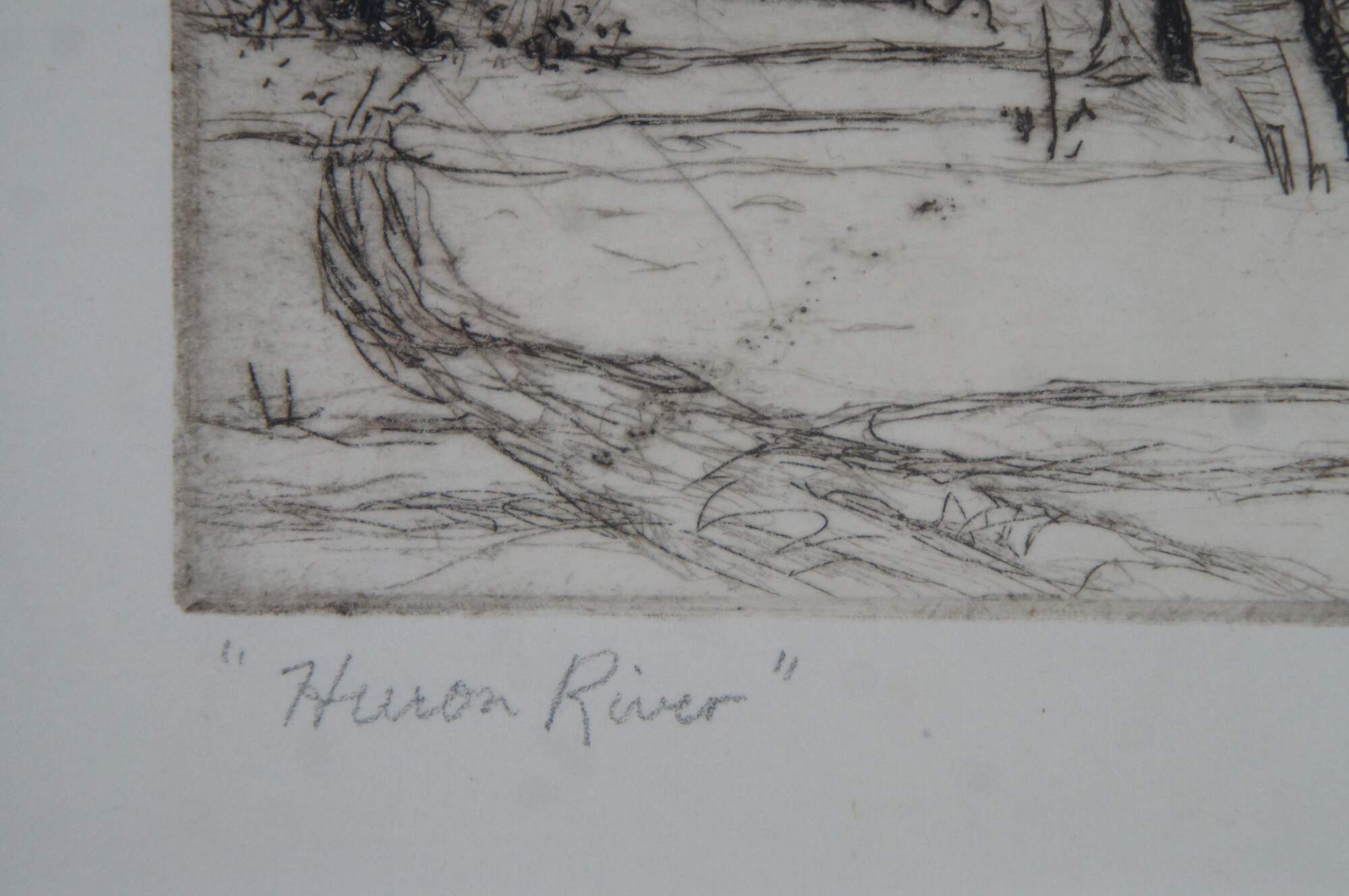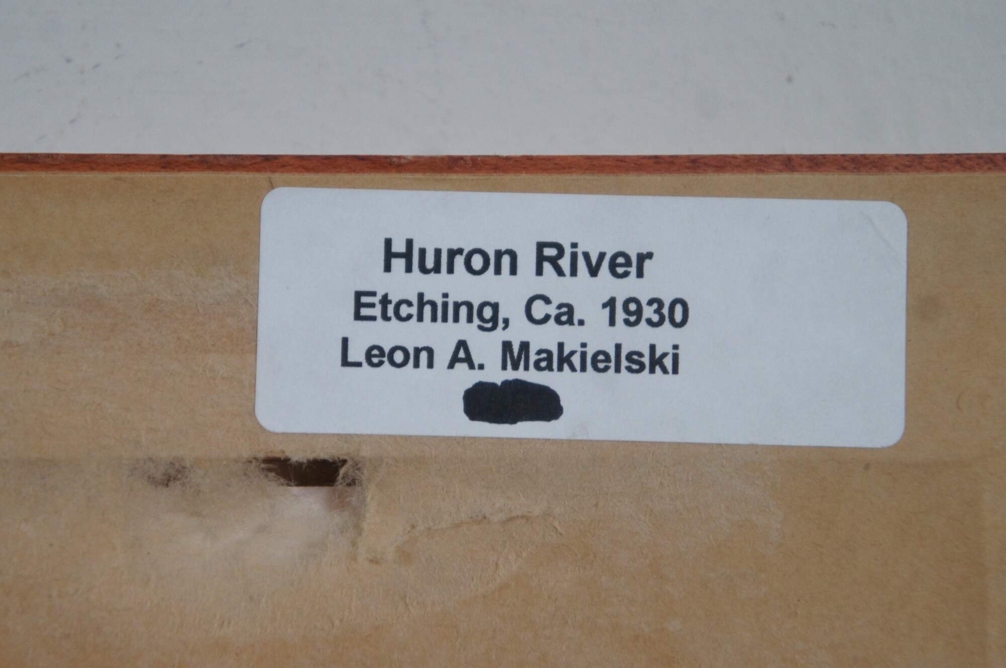 Antique circa 1930's pencil signed etching by Leon A. Makielski titled "Huron River," showing a landscape view of the Huron river lined with trees. Beveled wood frame, white mat.