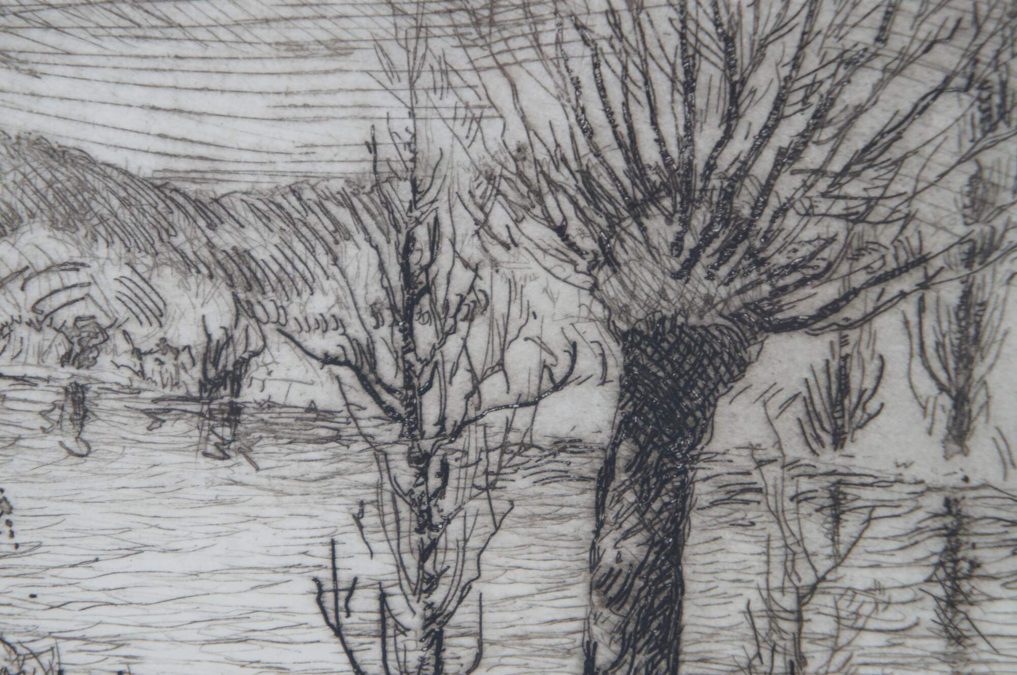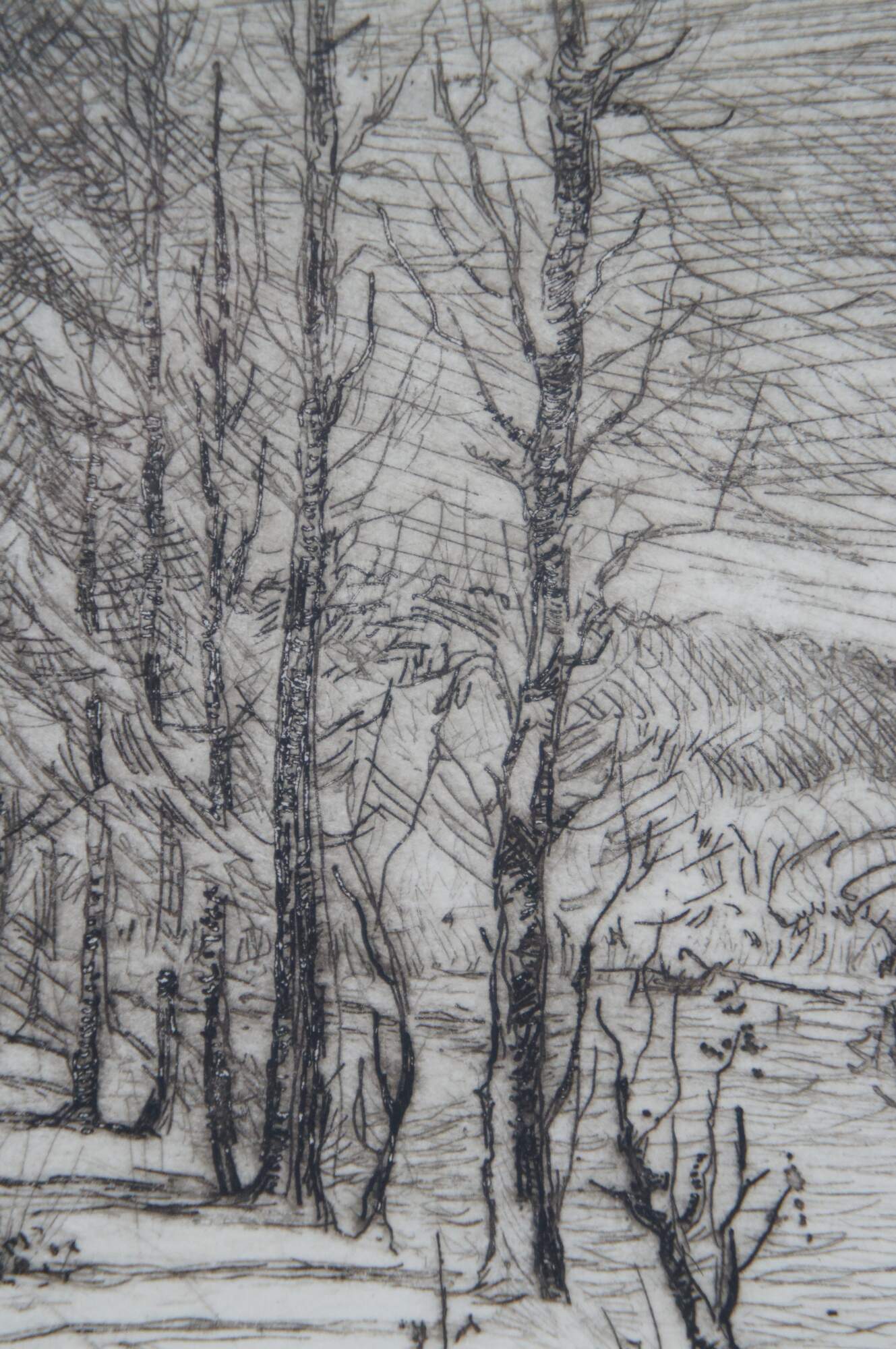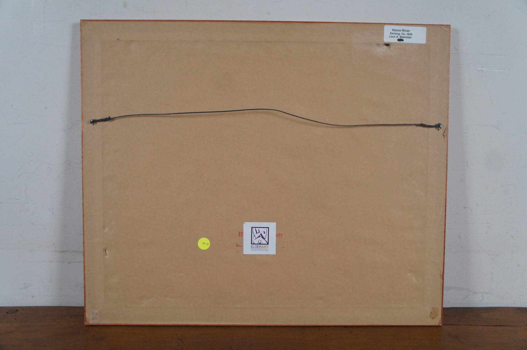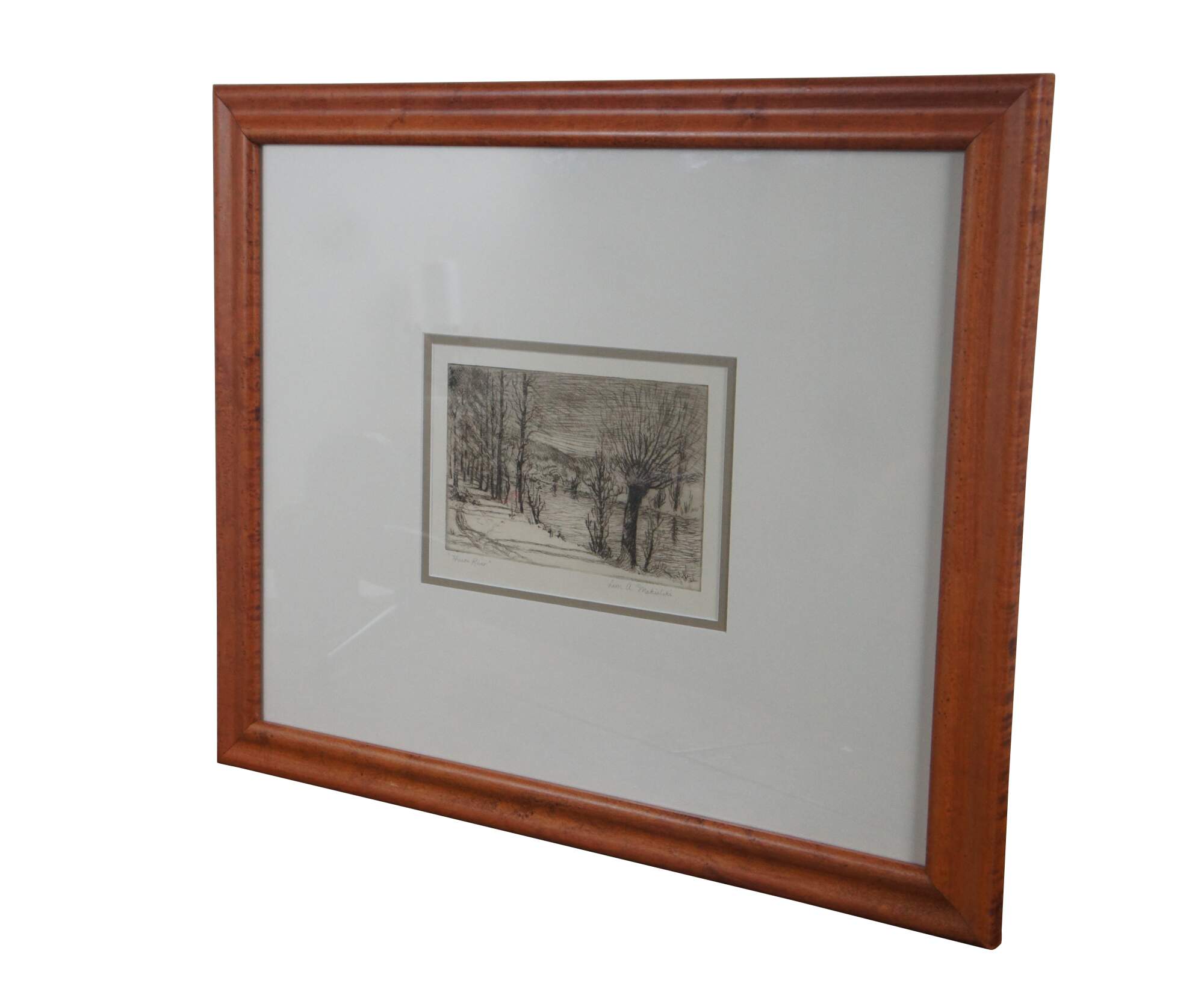 Antique circa 1930's pencil signed etching by Leon A. Makielski titled "Huron River," showing a landscape view of the Huron river lined with trees. Beveled wood frame, white mat.