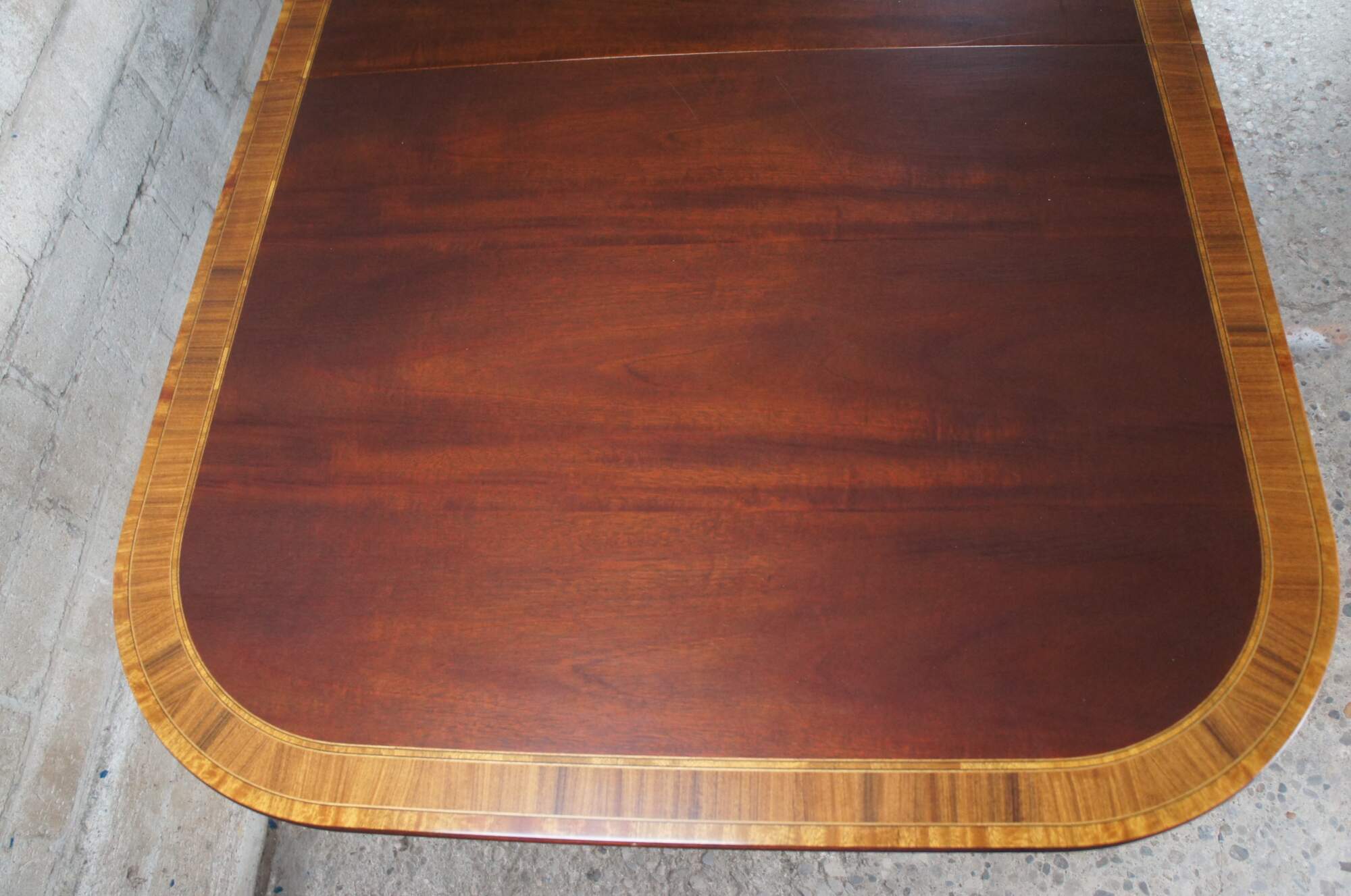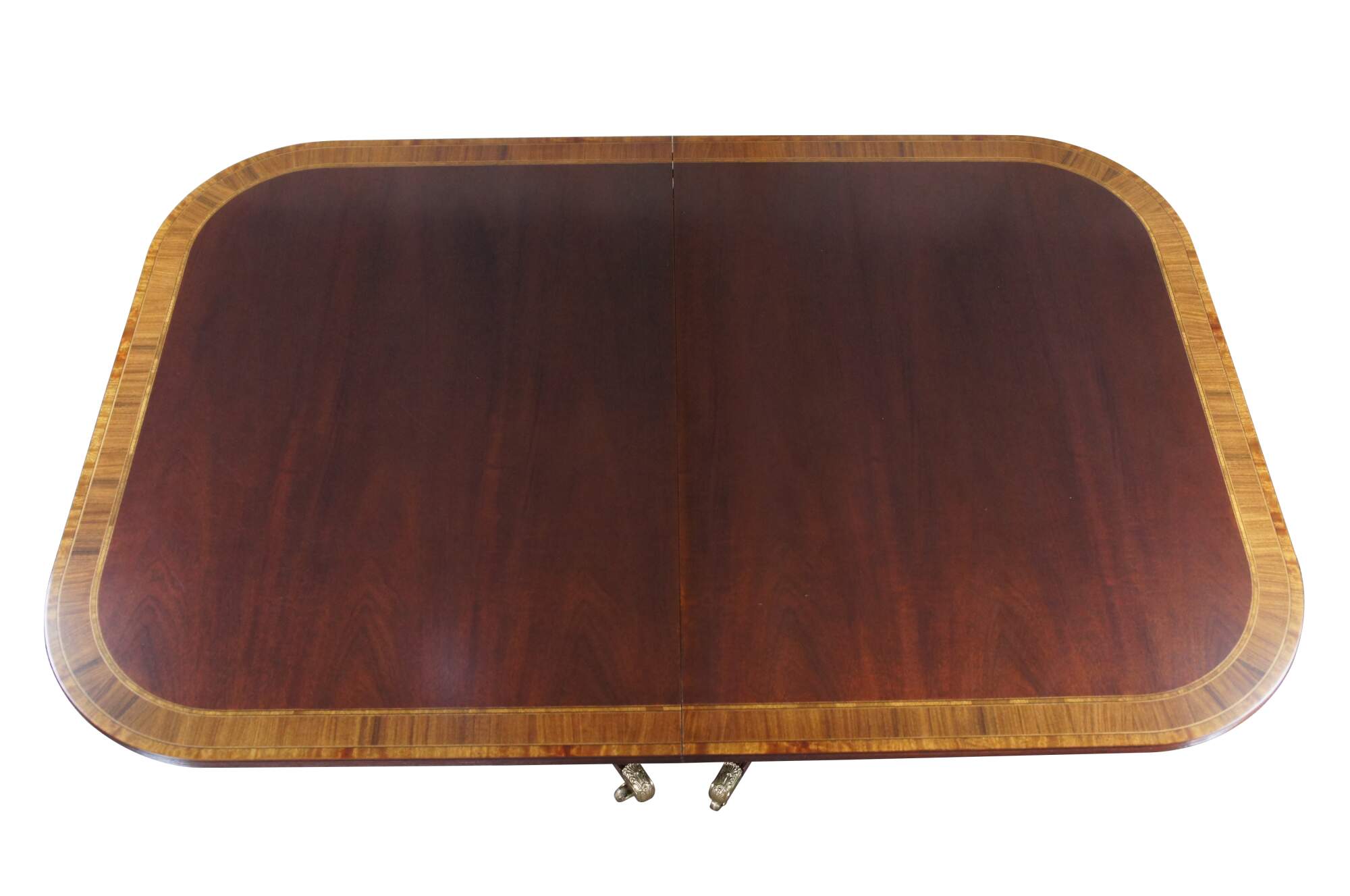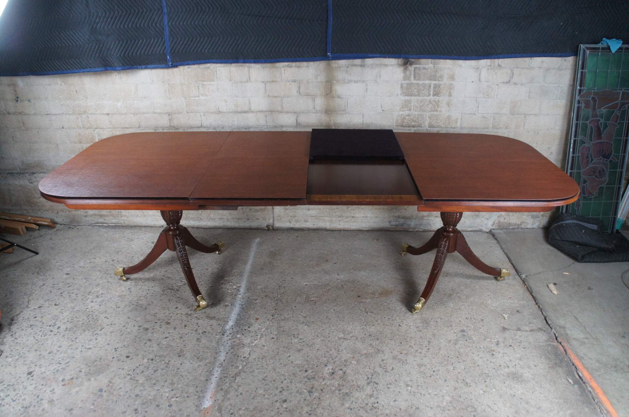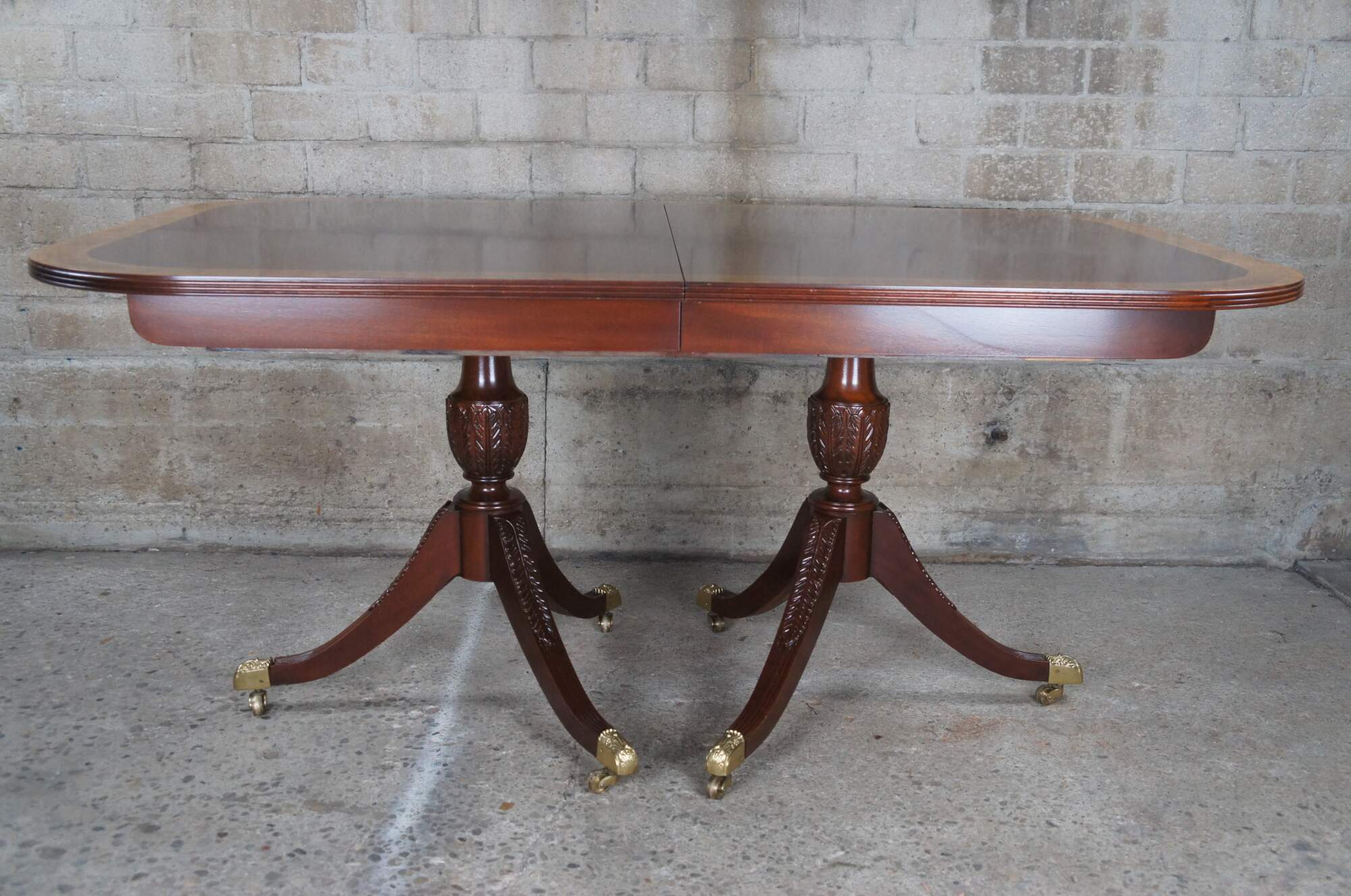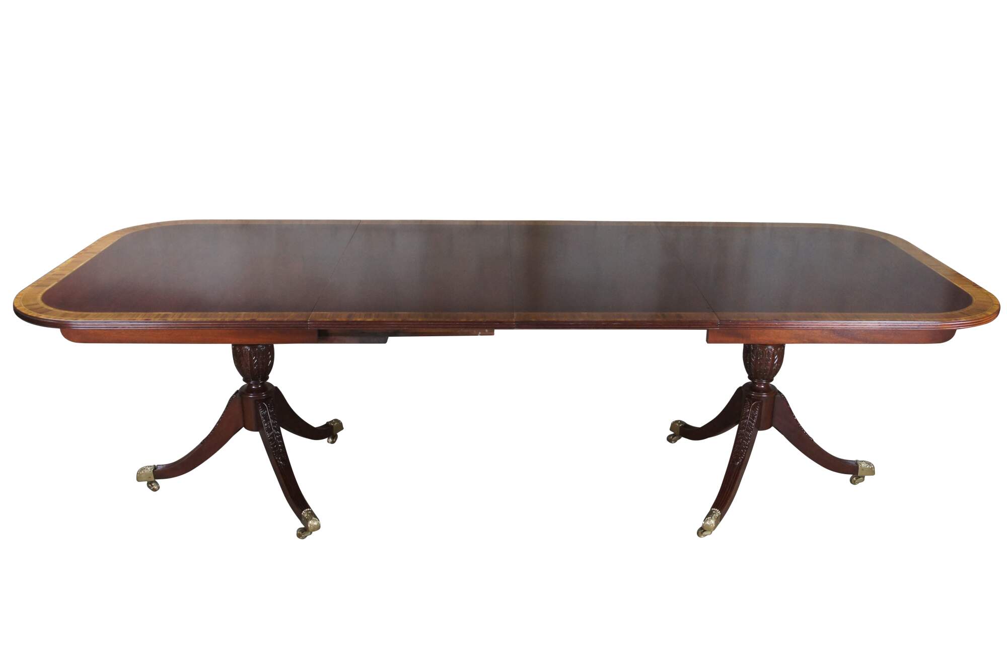 Baker Furniture English Regency style dining table. Features an impressive mahogany banded top with two leaves for extension and table pads. The table is supported by a double pedestal mahogany tripod base with shapely acanthus carved urns over three downswept legs with mirrored canthus carving and fluting. The legs are capped with scalloped brass casters. 122" fully extended