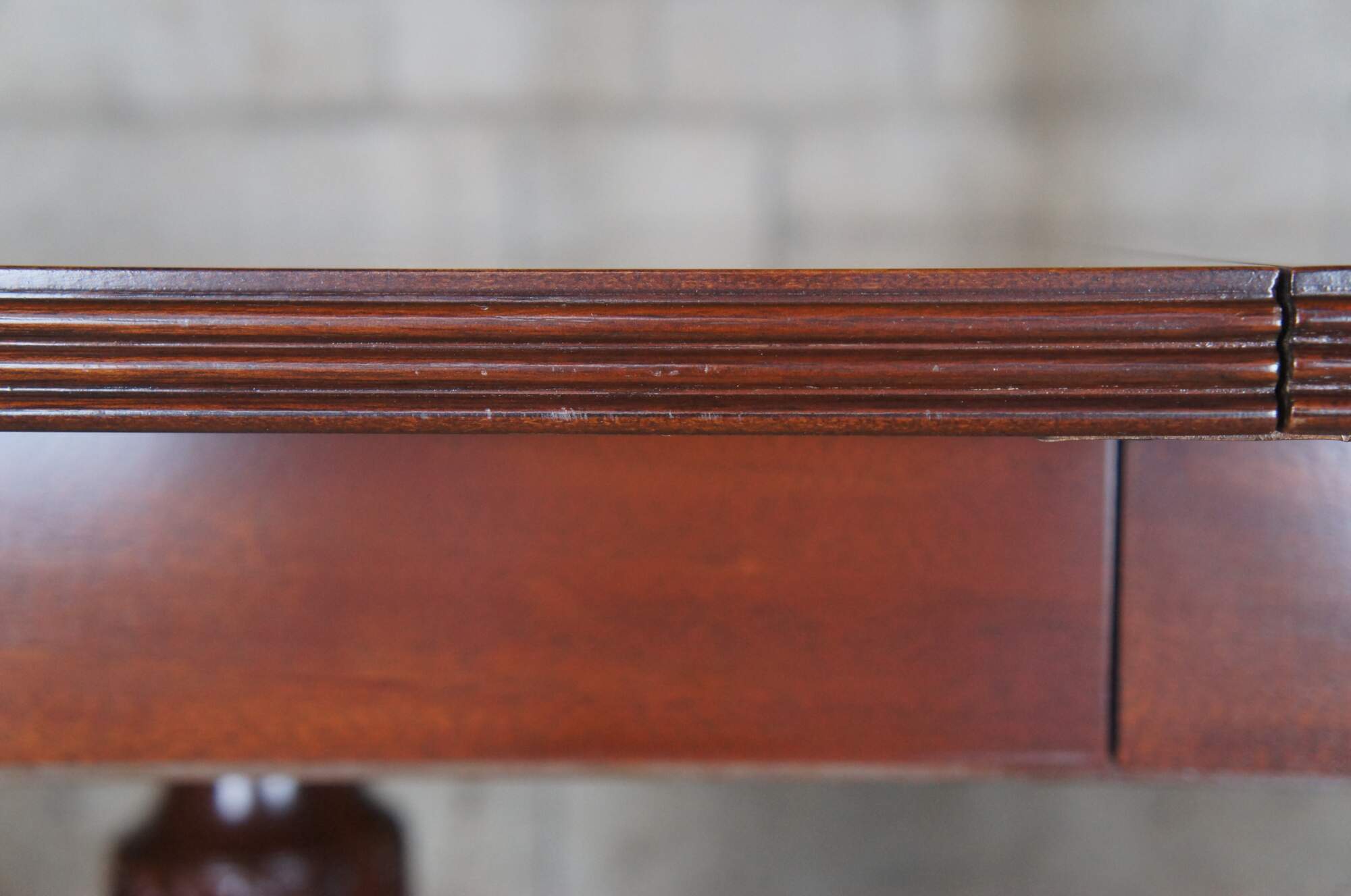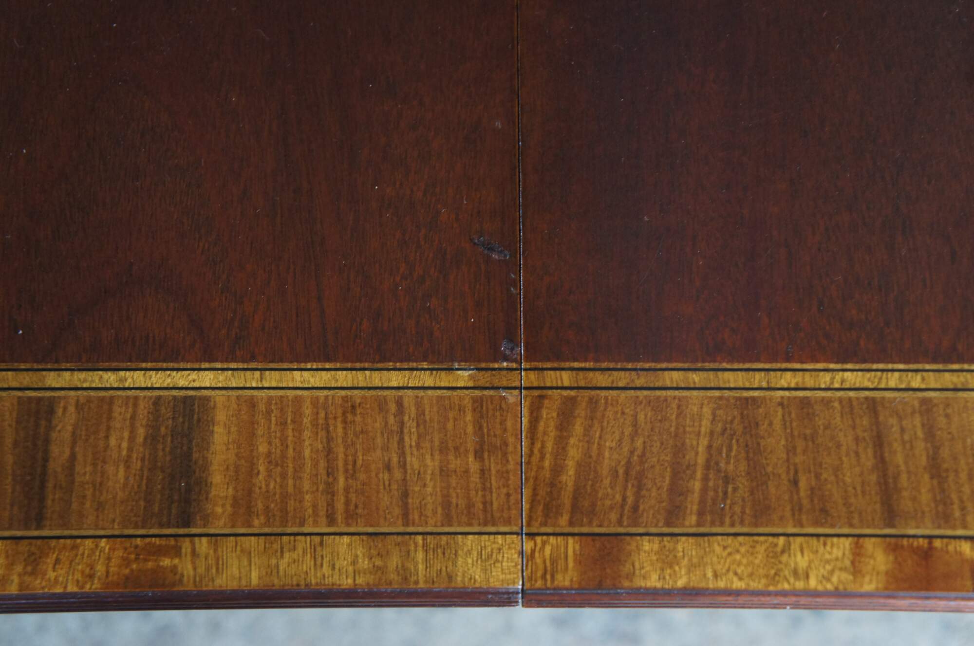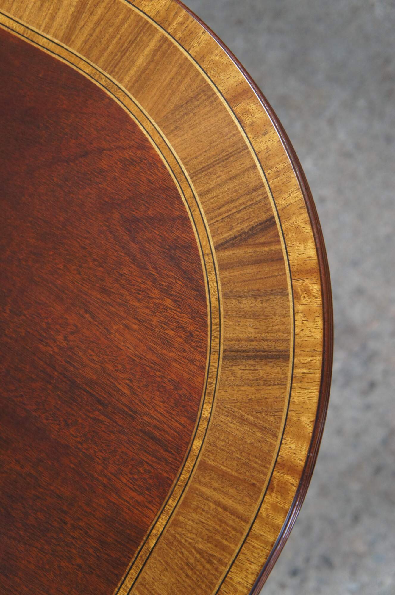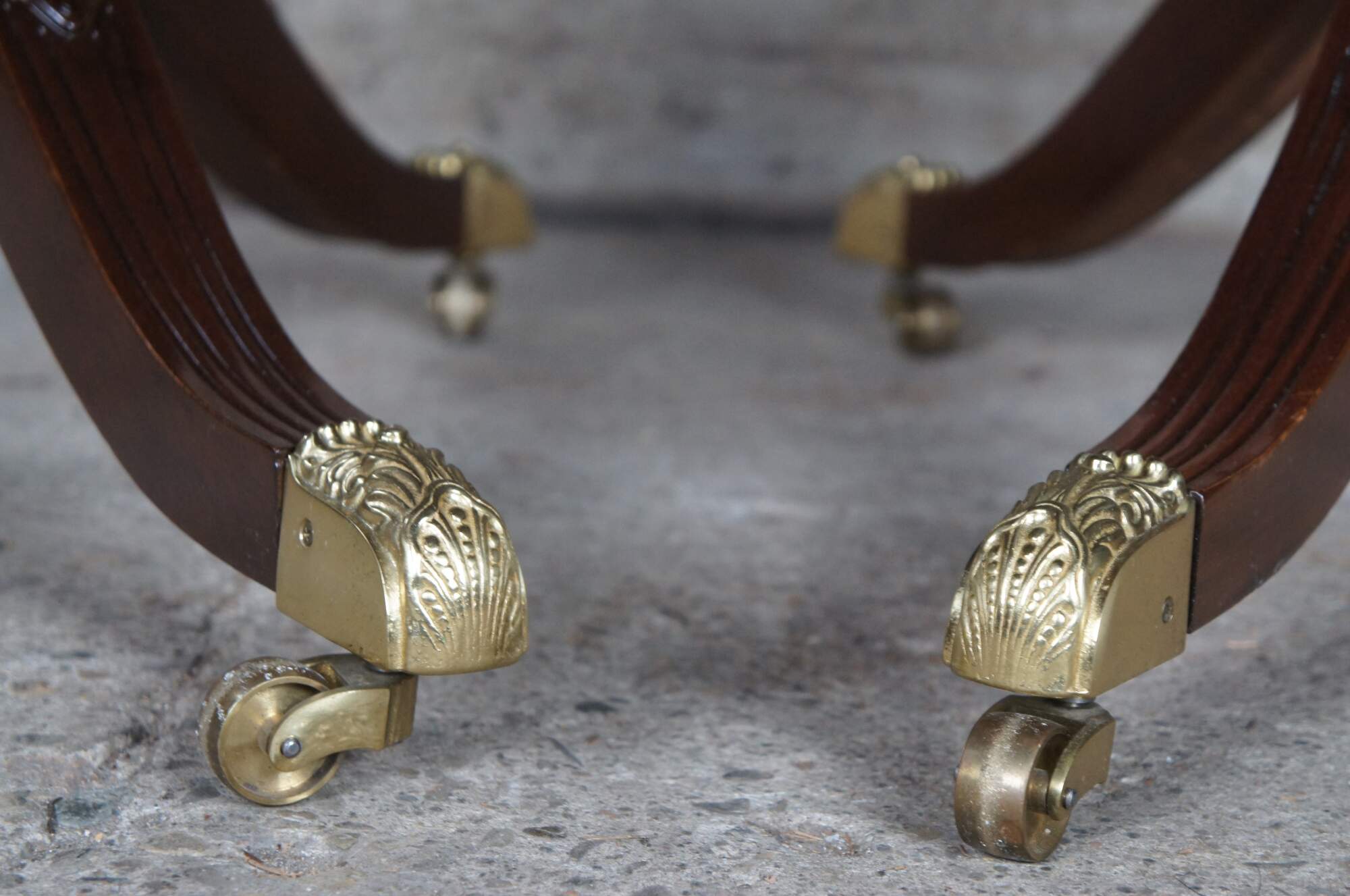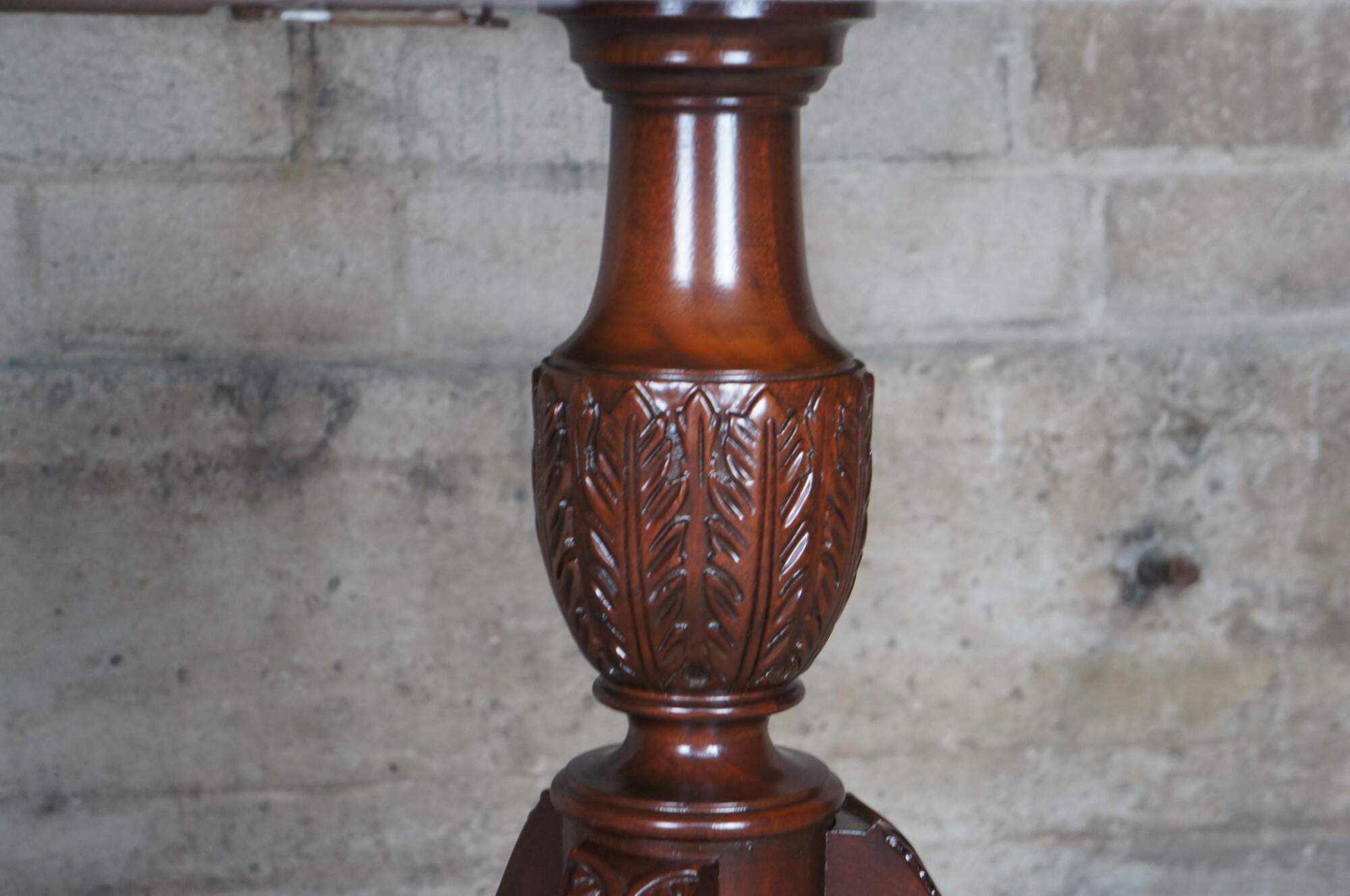 Baker Furniture English Regency style dining table. Features an impressive mahogany banded top with two leaves for extension and table pads. The table is supported by a double pedestal mahogany tripod base with shapely acanthus carved urns over three downswept legs with mirrored canthus carving and fluting. The legs are capped with scalloped brass casters. 122" fully extended
