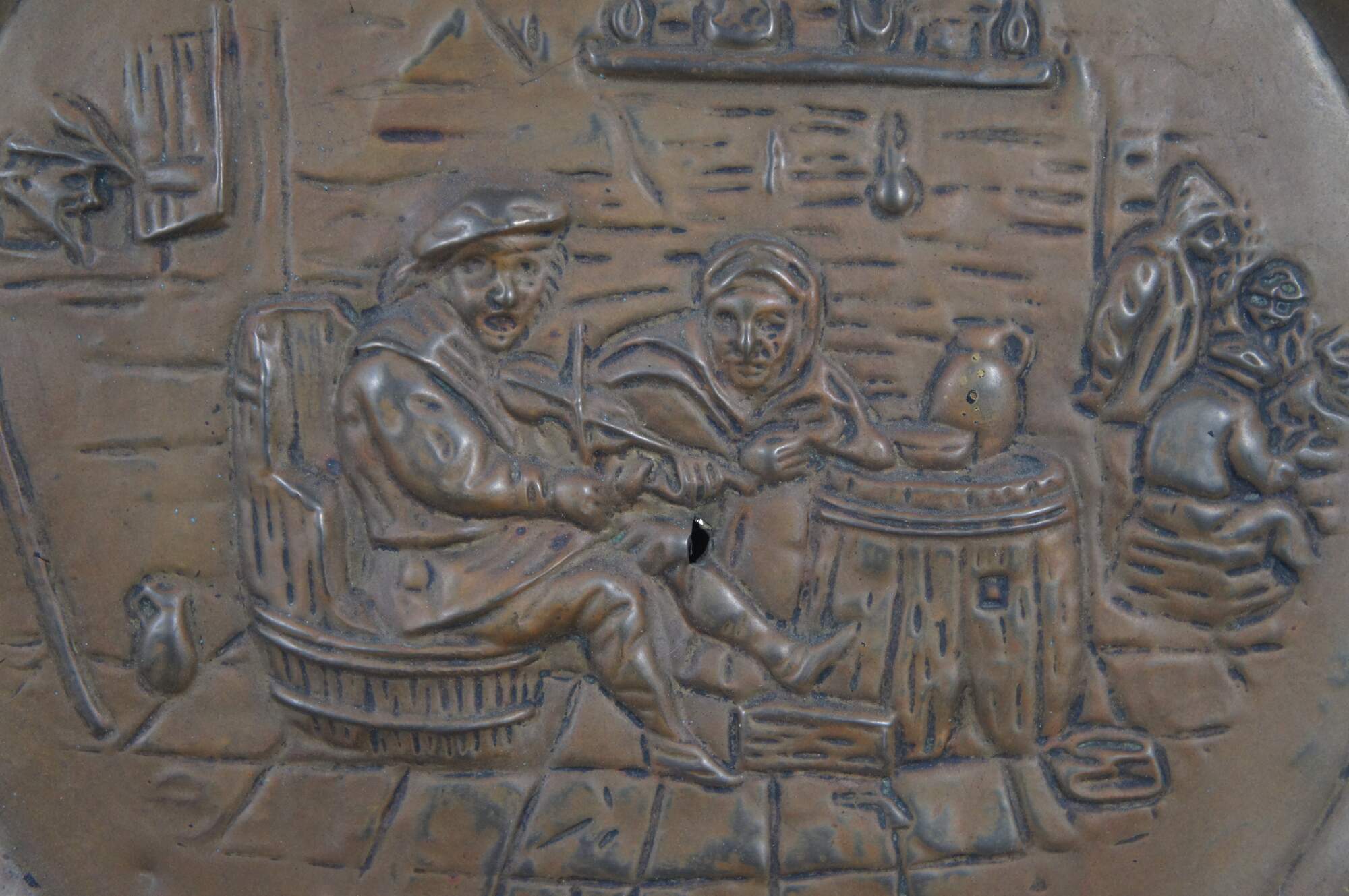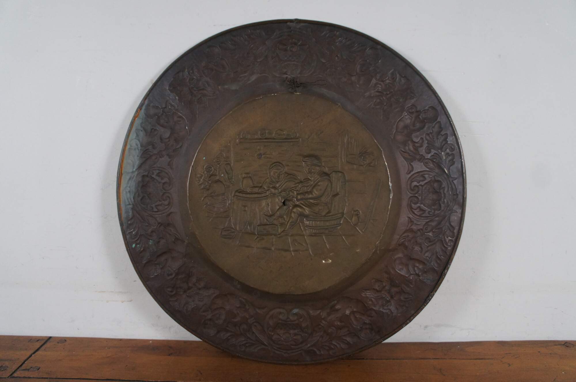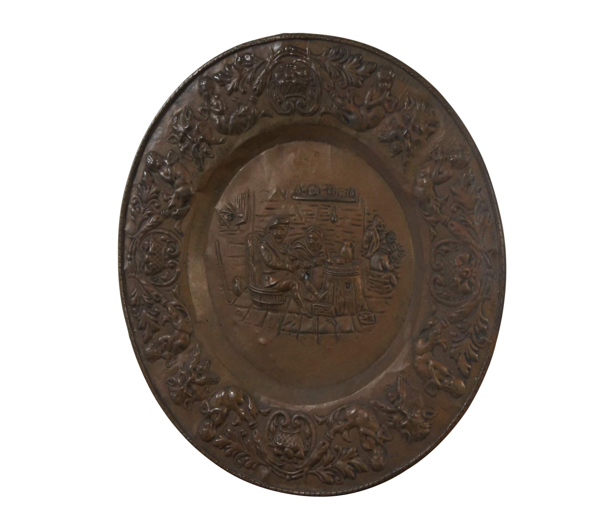 Antique embossed copper repousse wall hanging charger / platter featuring a tavern scene at the center and Neoclassical motif of cherubs / putties, baskets of fruit and Green Man faces around the edge.