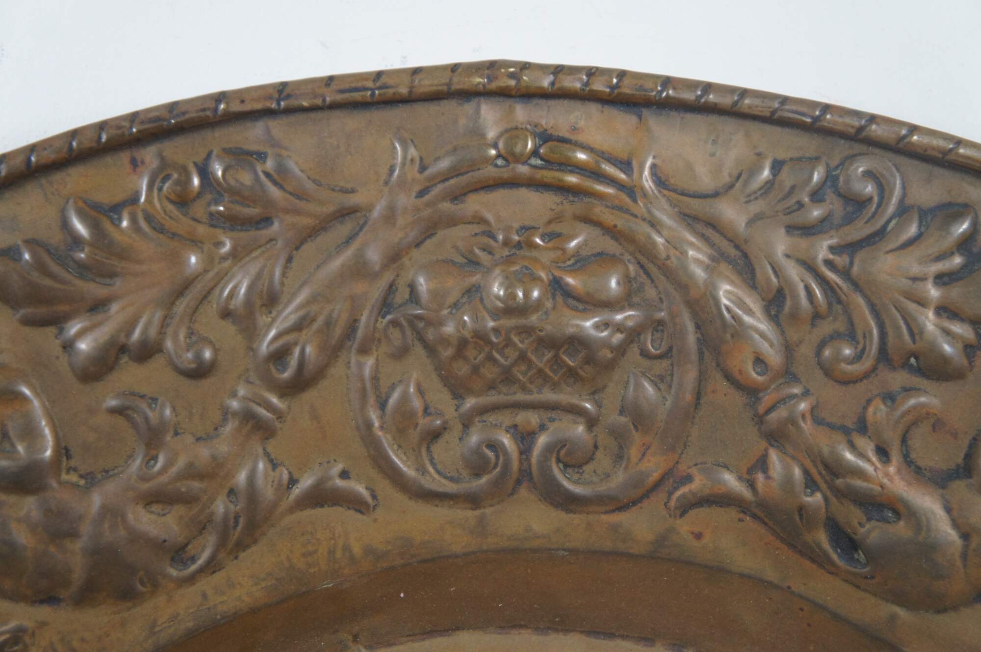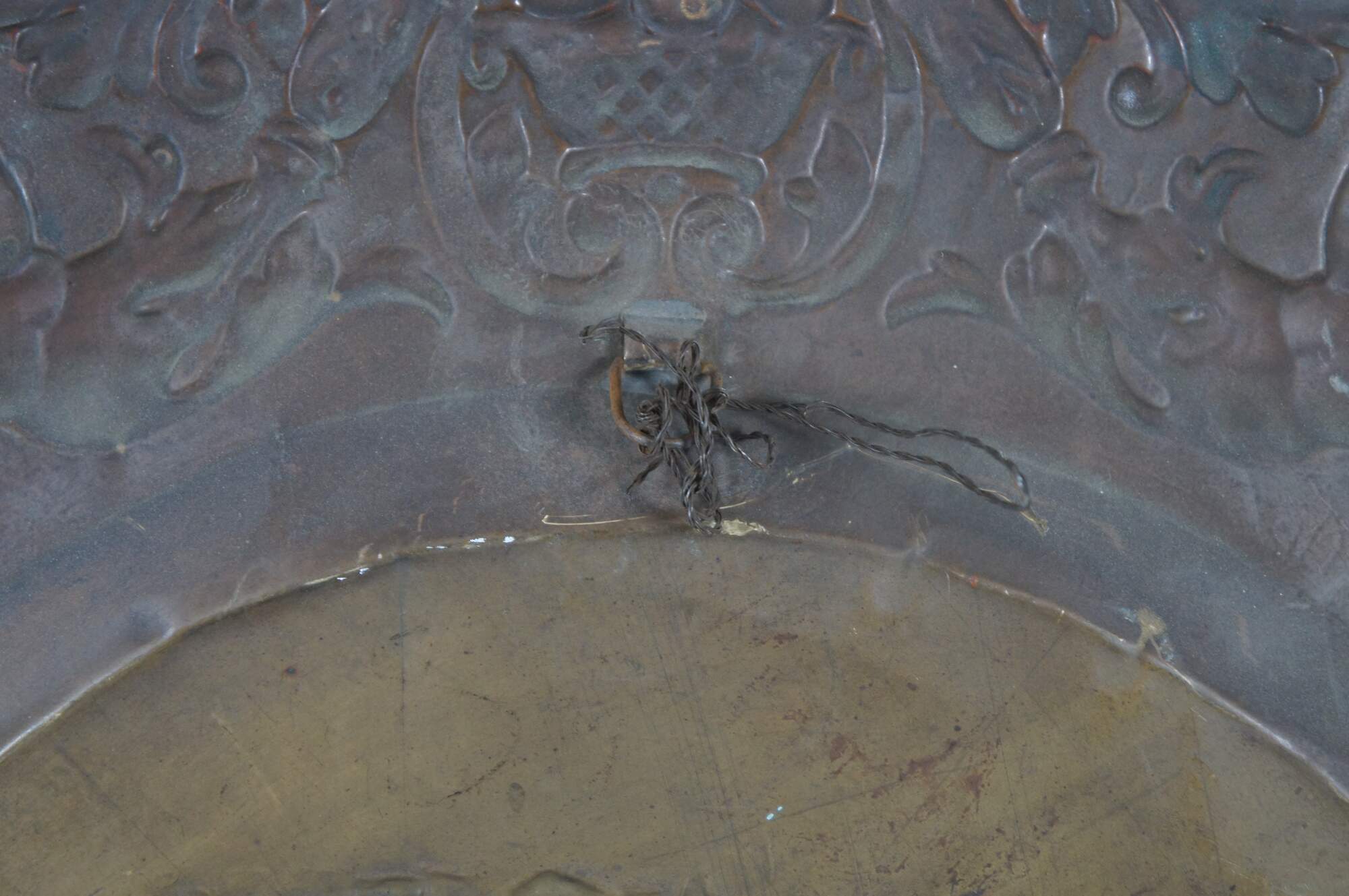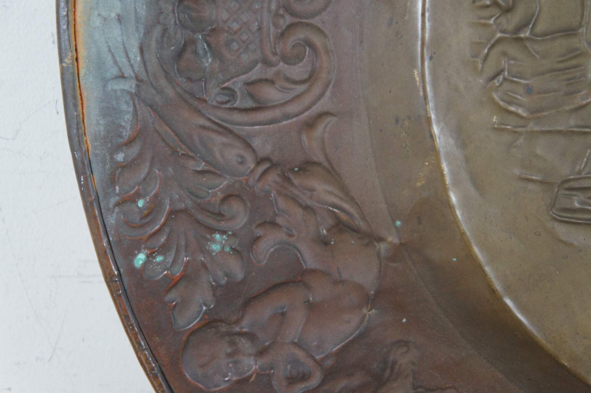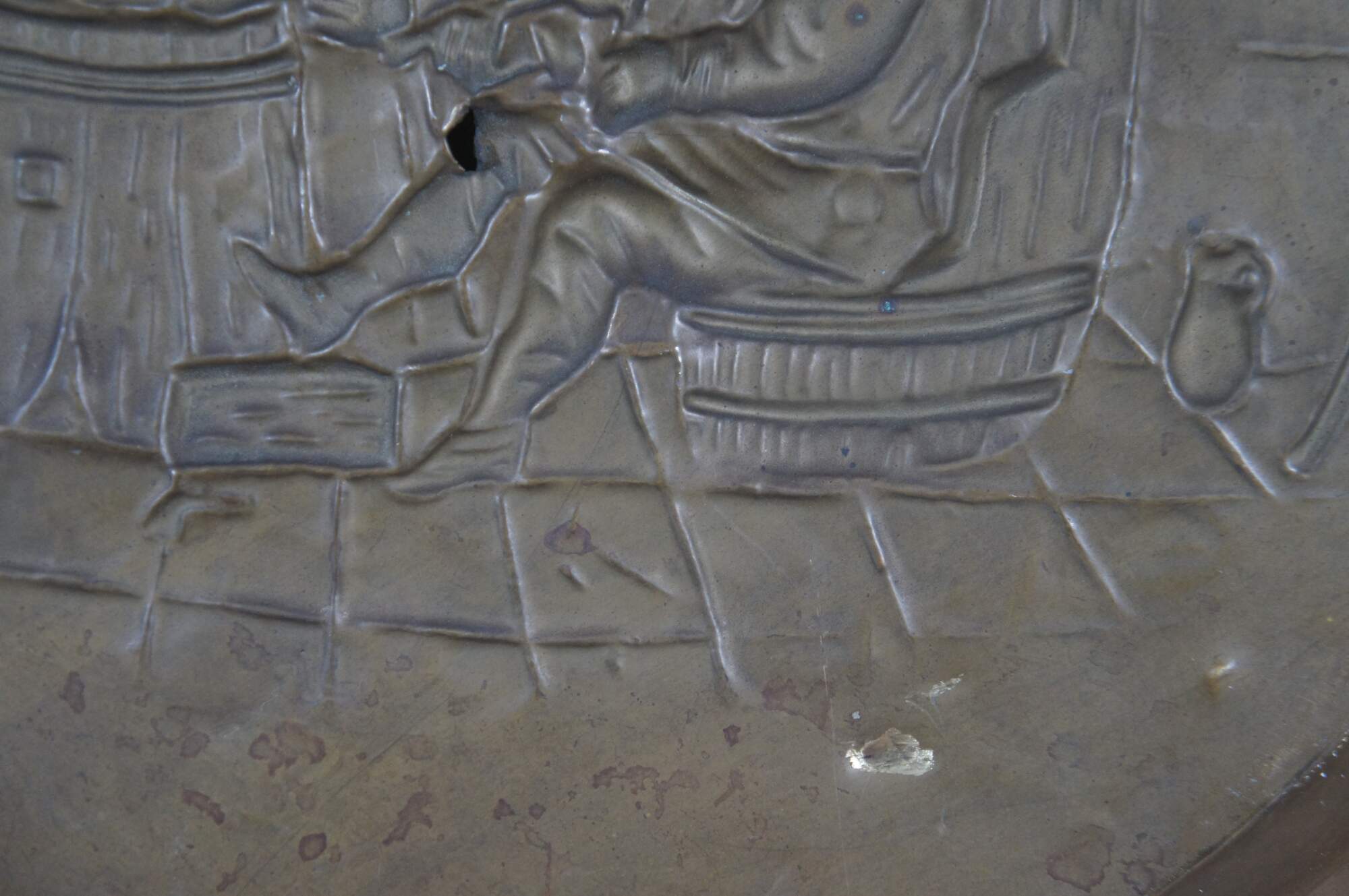Antique embossed copper repousse wall hanging charger / platter featuring a tavern scene at the center and Neoclassical motif of cherubs / putties, baskets of fruit and Green Man faces around the edge.