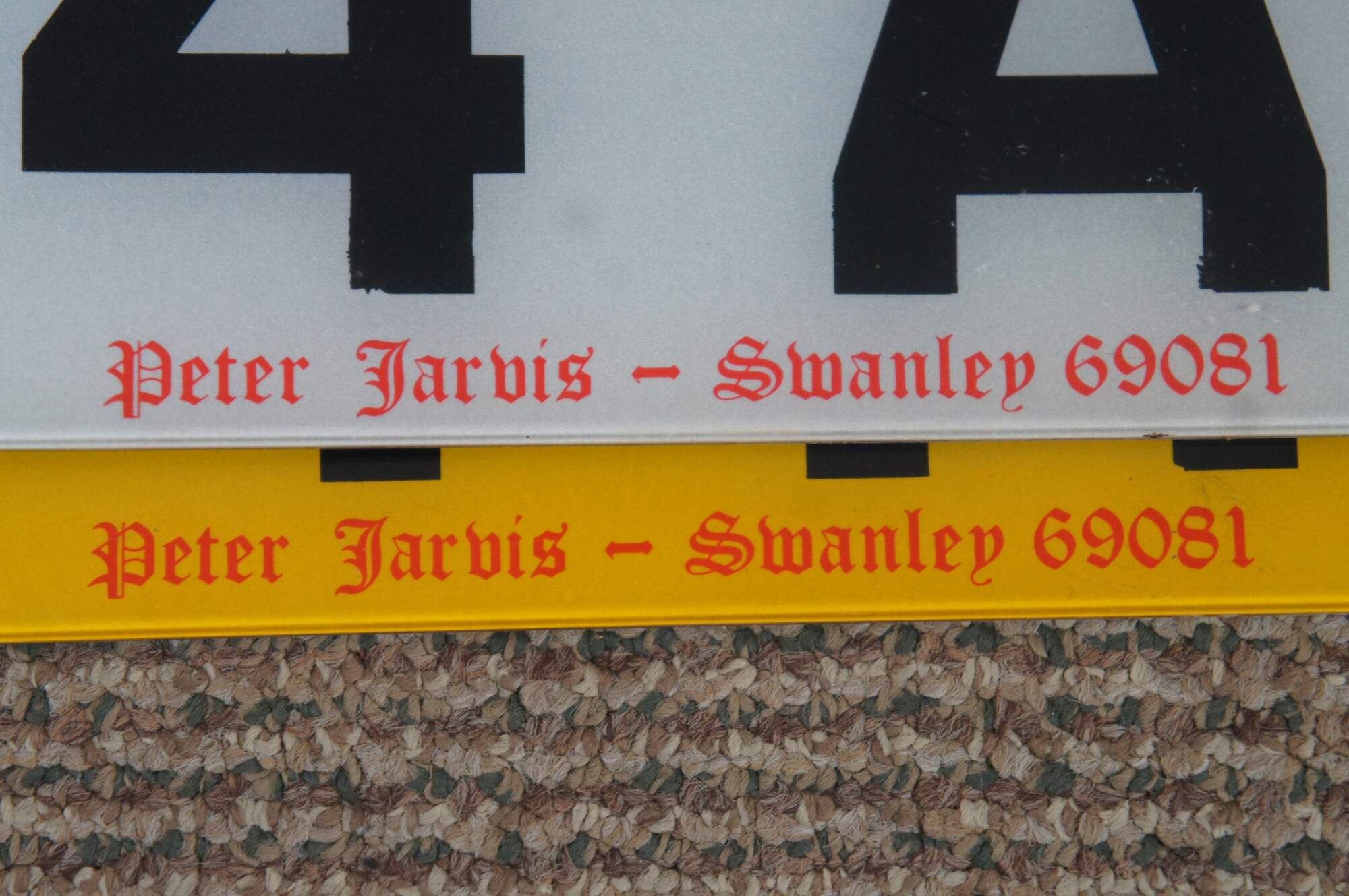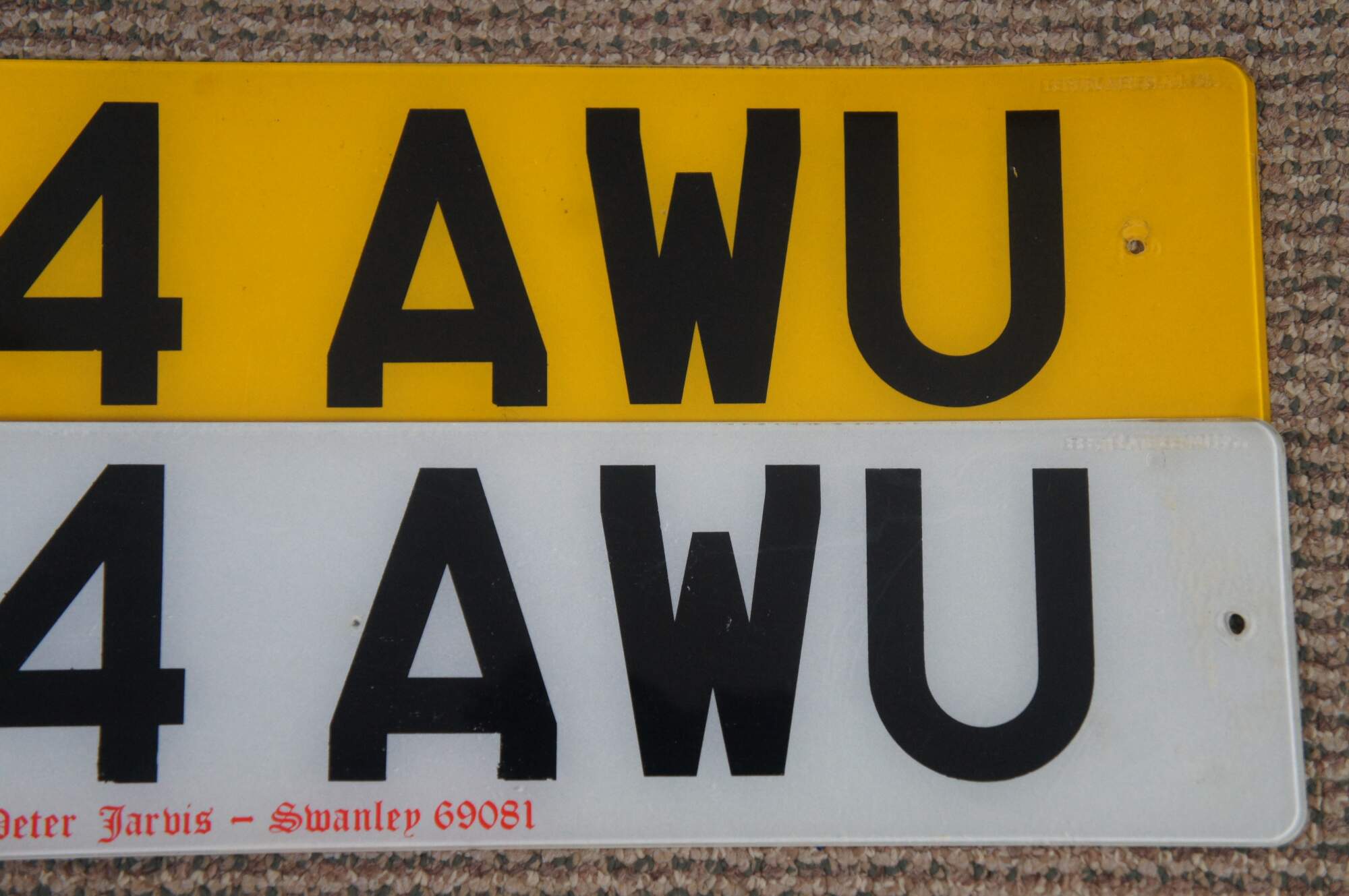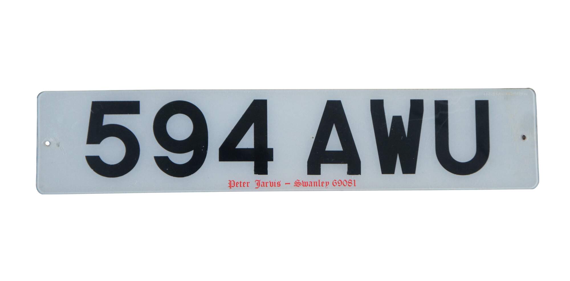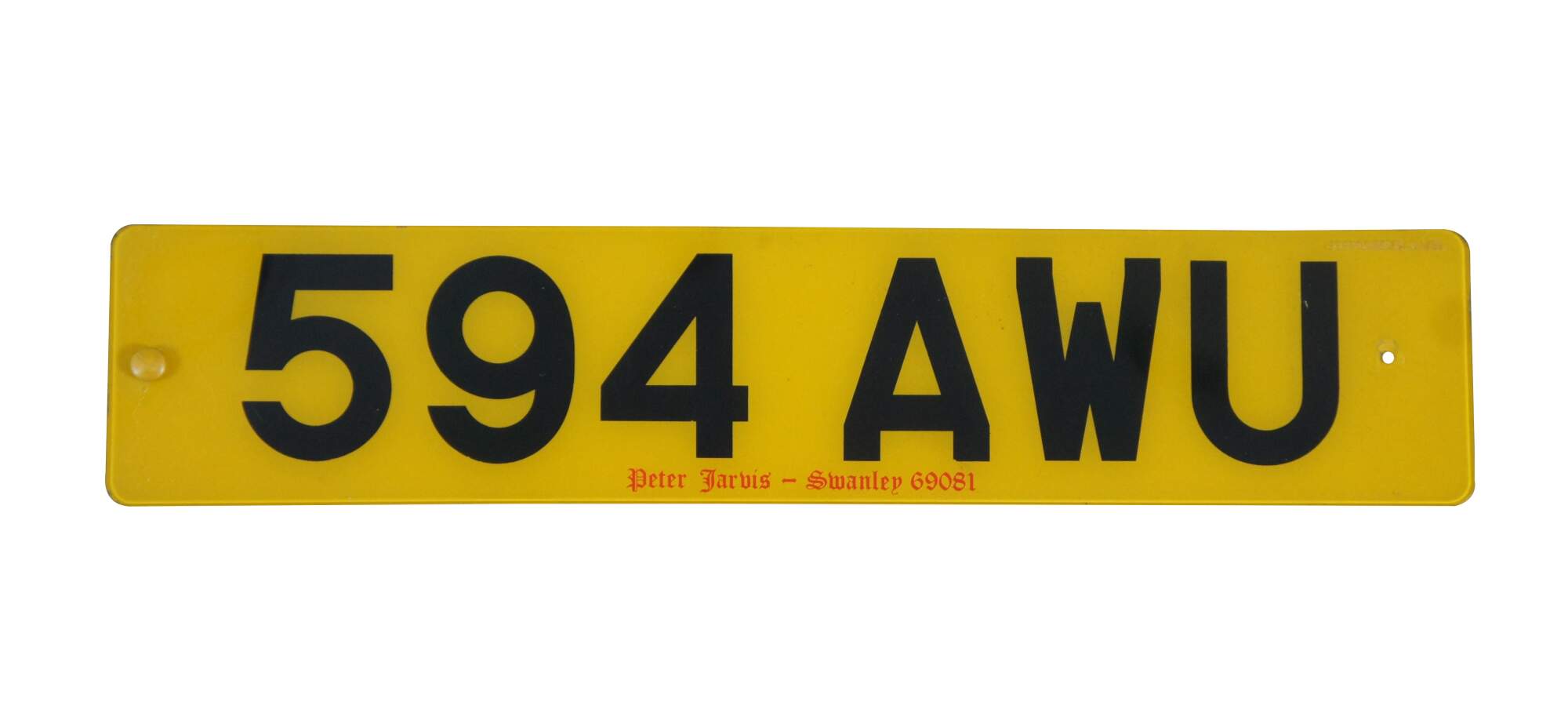 Pair of vintage plastic vehicle registration / license plates from Great Britain, one white and one yellow. Numer 594 AWU. Peter Jarvis - Swanley 69081.