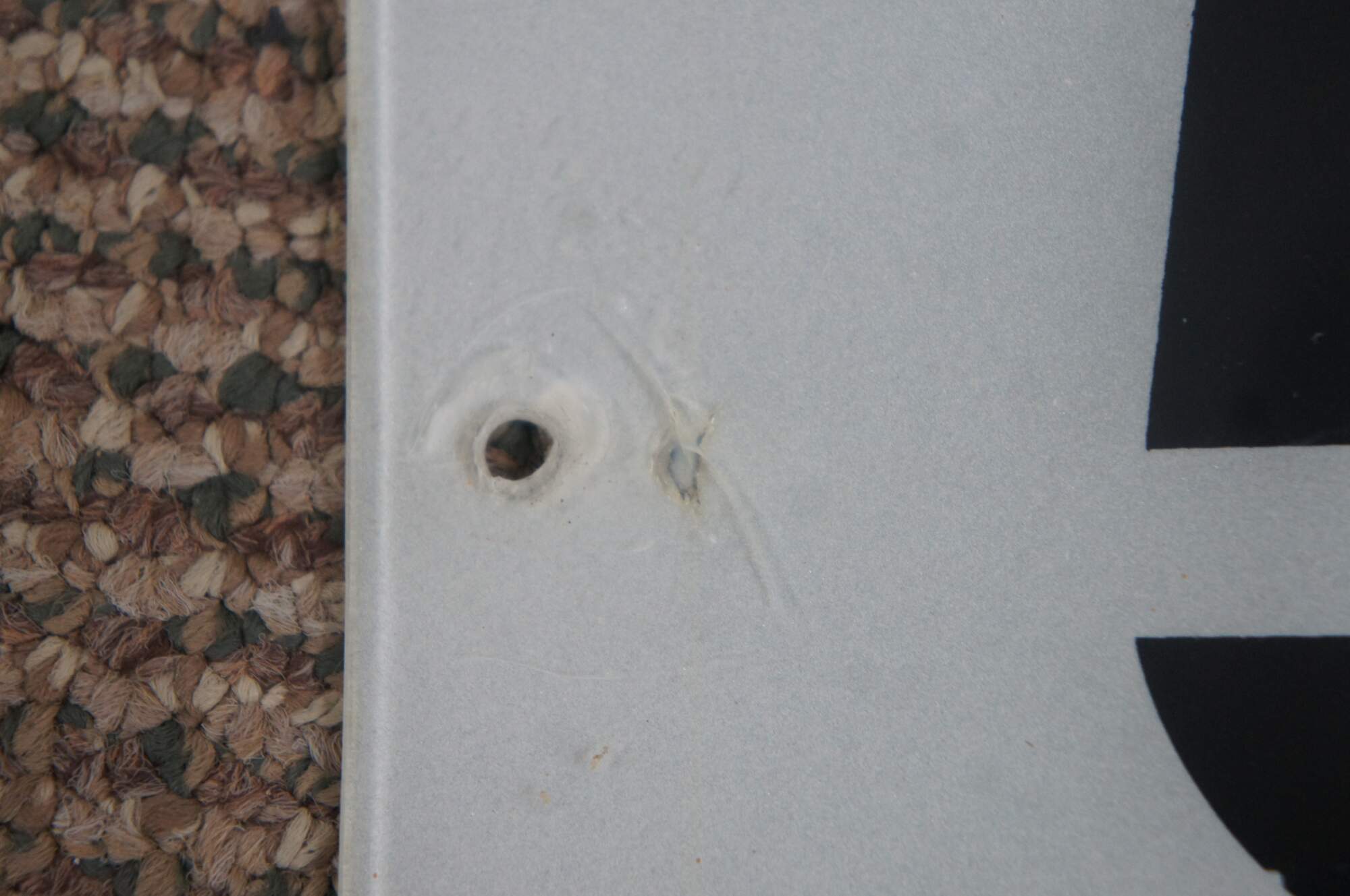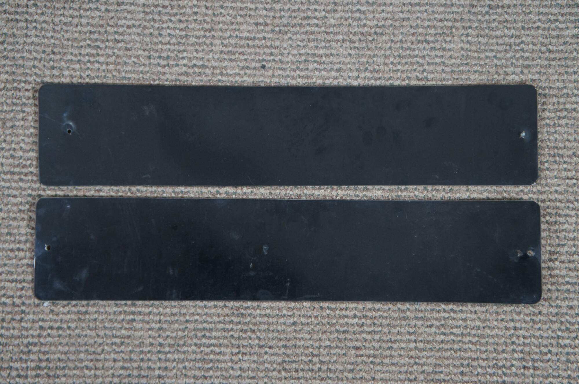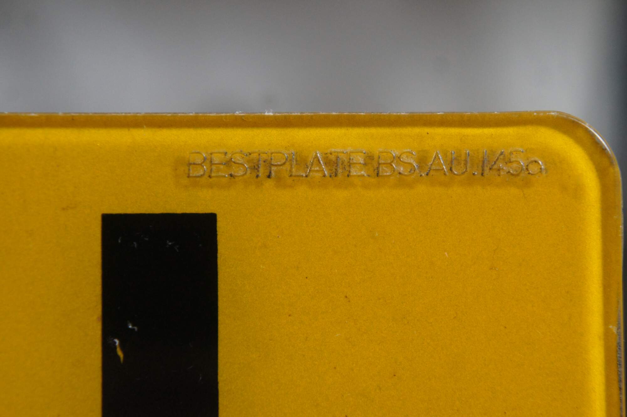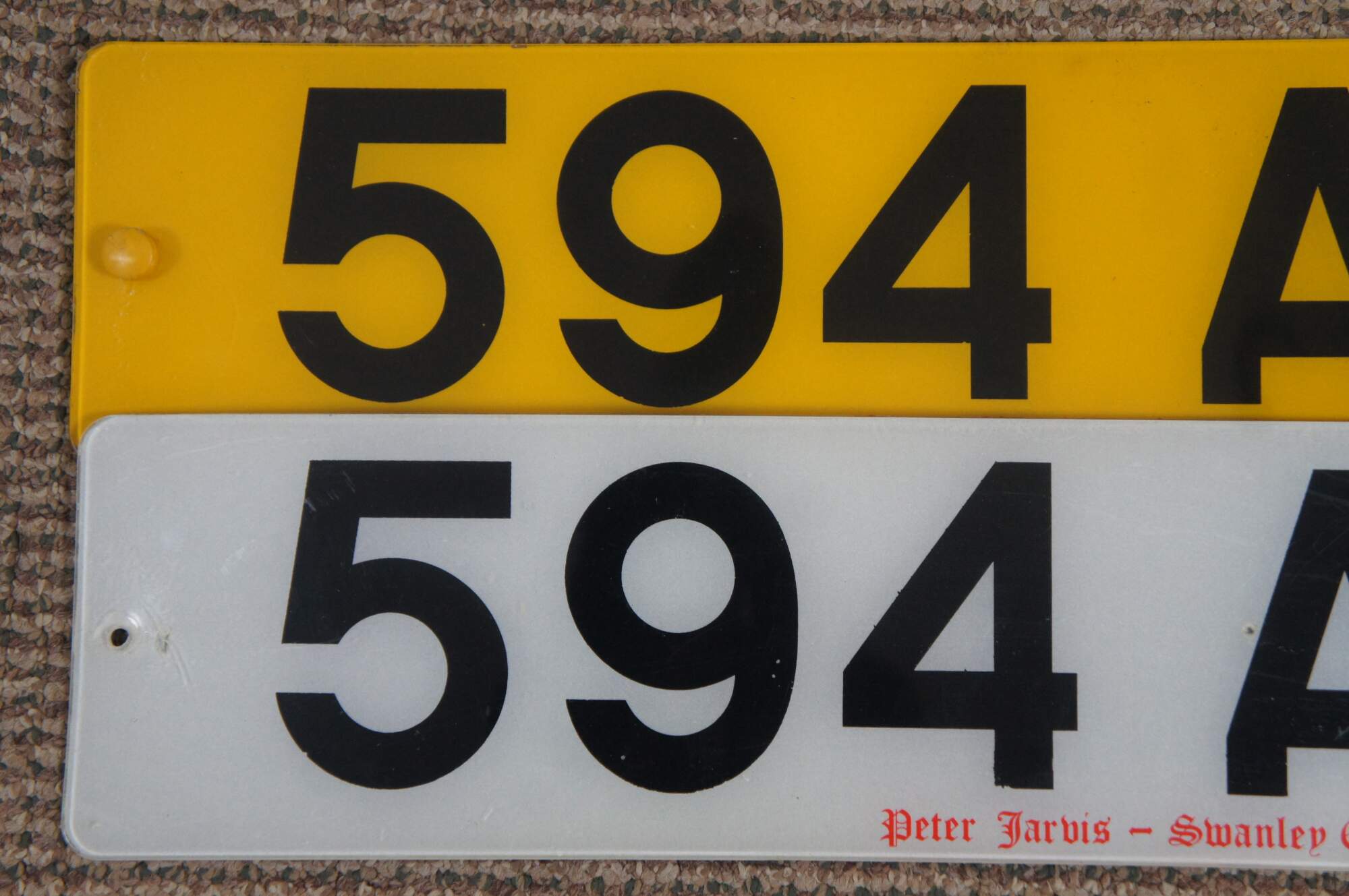 Pair of vintage plastic vehicle registration / license plates from Great Britain, one white and one yellow. Numer 594 AWU. Peter Jarvis - Swanley 69081.