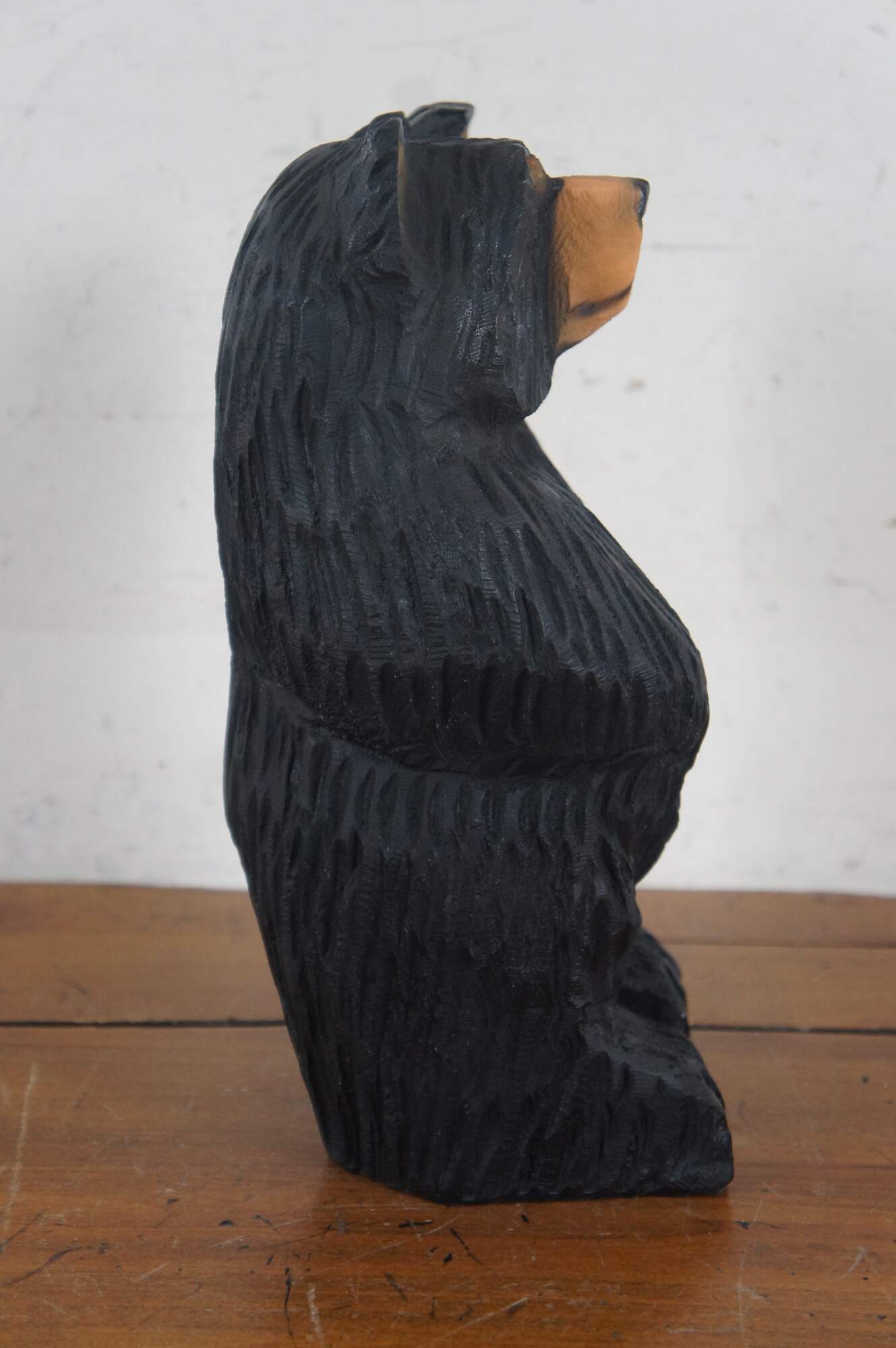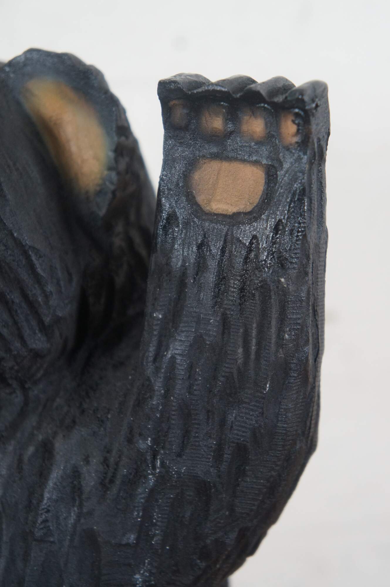 Vintage chainsaw carved wooden figurine / sculpture in the shape of a semi-cartoonish black bear standing on its hind legs with one paw raised in a wave. Rustic hunting lodge decor.