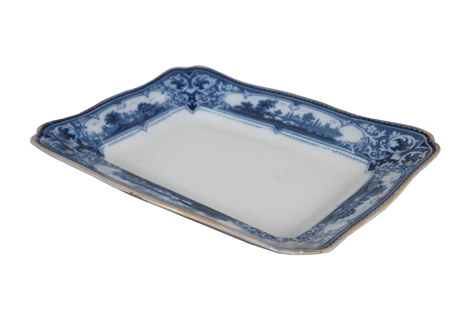 Large antique circa 1908-1913 Ford and Sons Ltd of Burslem, England Verona pattern ceramic serving platter featuring a slightly scalloped rectangular shape, gilded edges, and a blue transferware including floral and foliate designs framing pastoral landscapes with cows and sheep.