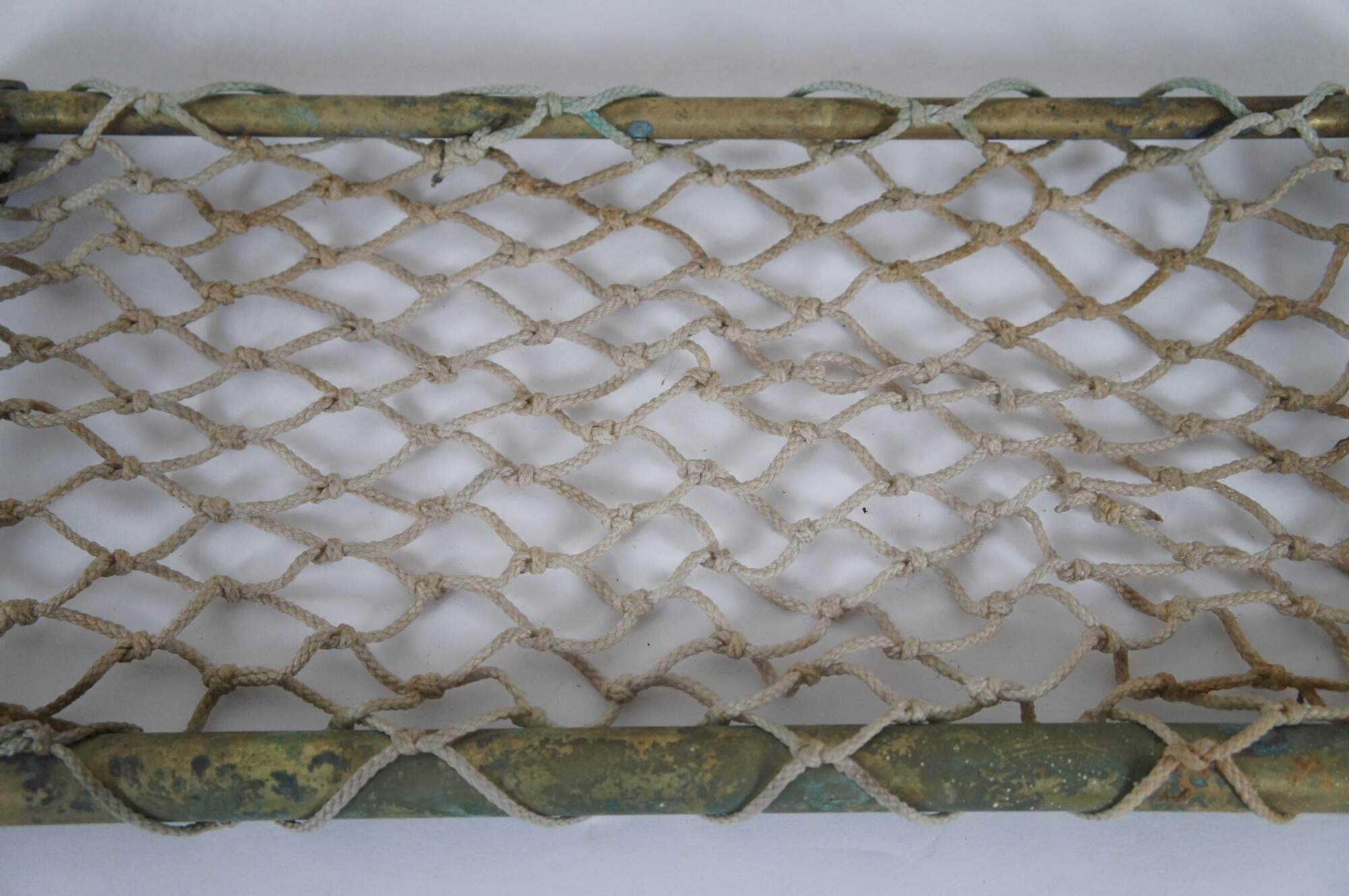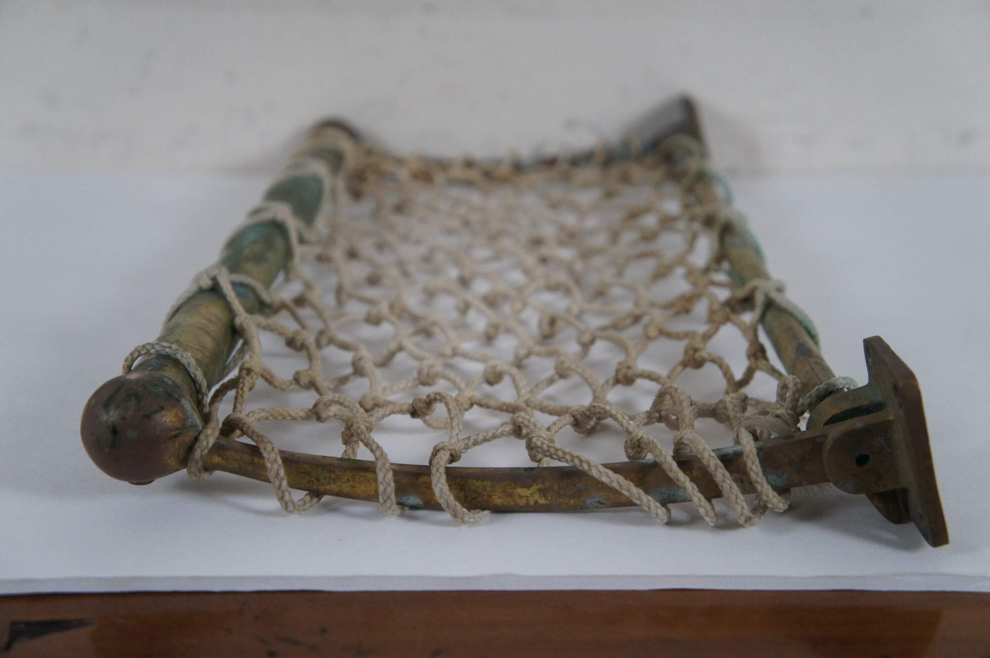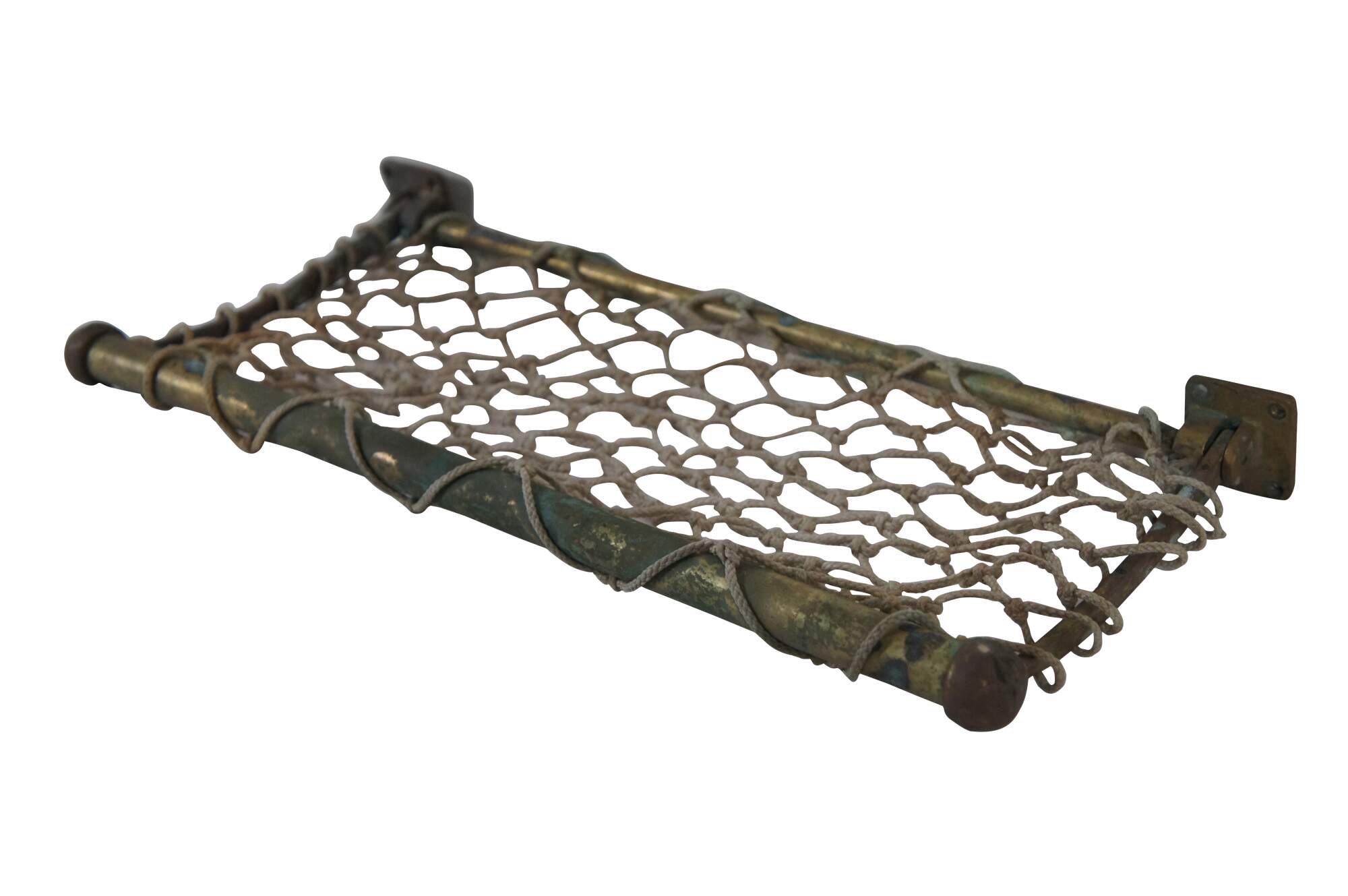 Antique railway / train car / trolley / steamship hat / storage rack, featuring a brass frame, macramé net shelf and hinged wall brackets enabling it to be folded up out of the way when not in use.