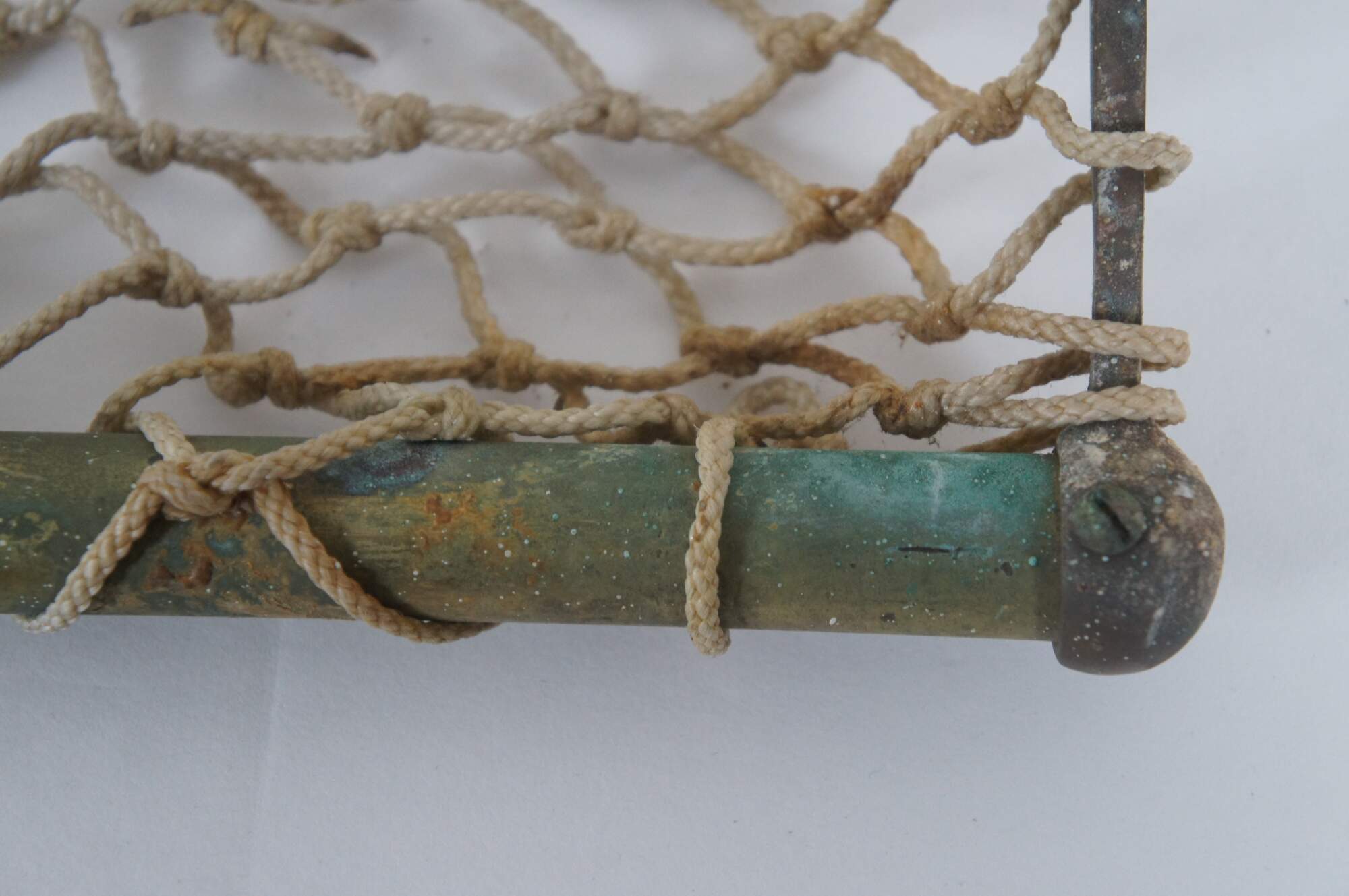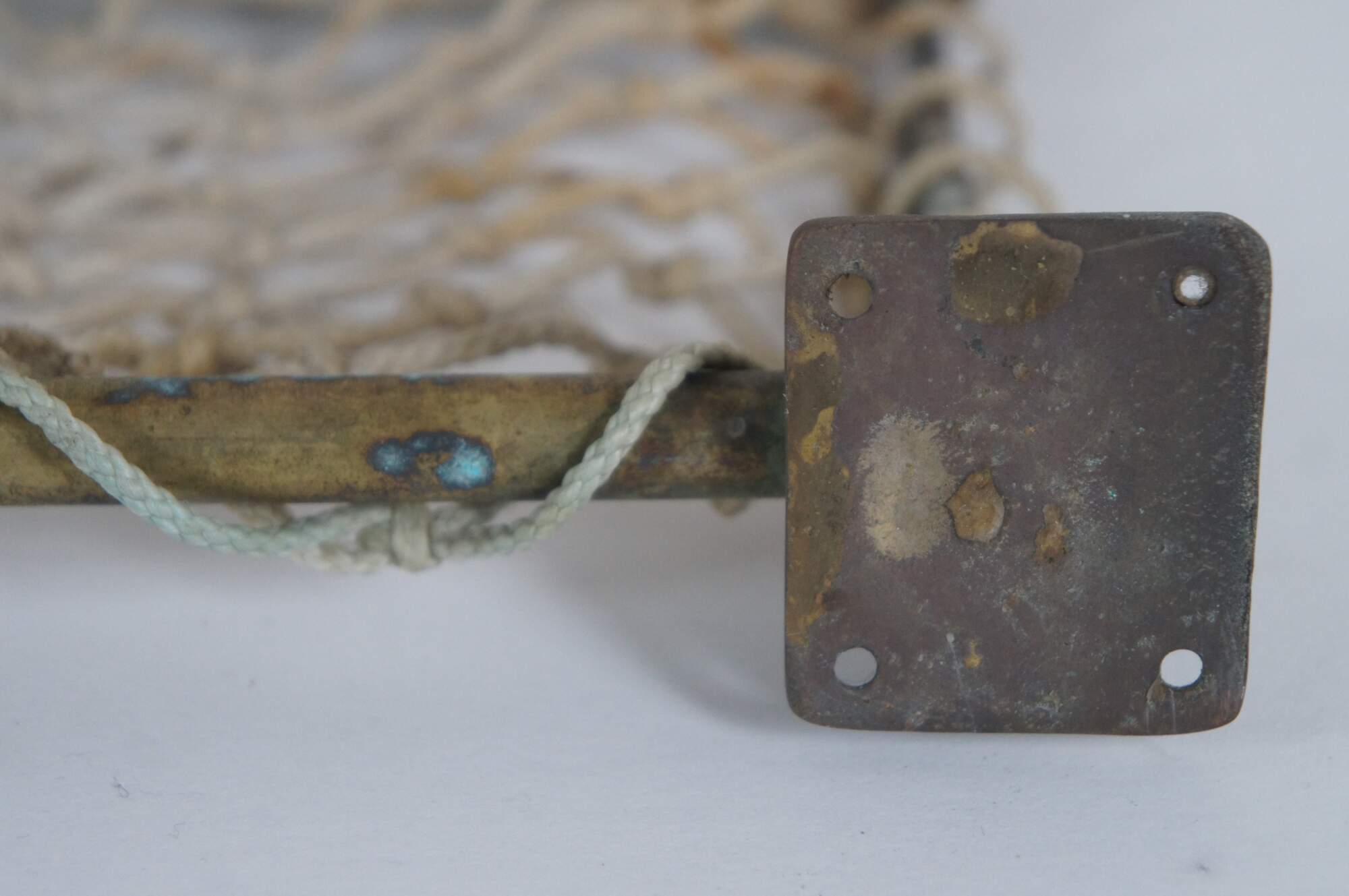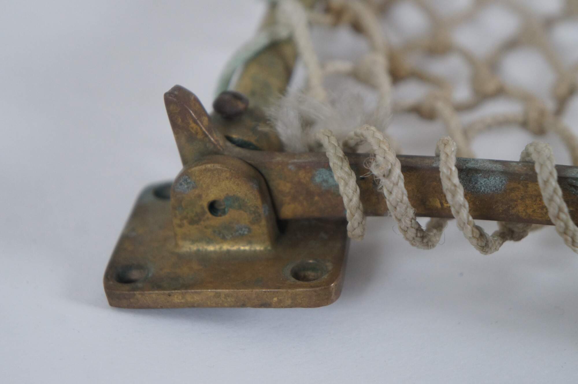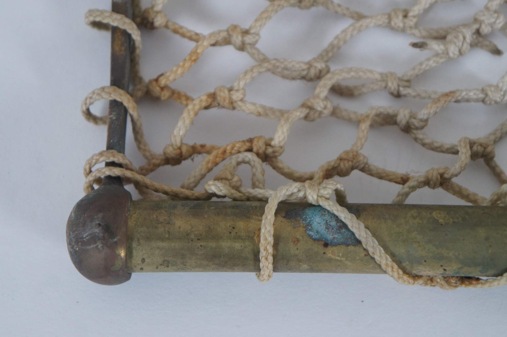 Antique railway / train car / trolley / steamship hat / storage rack, featuring a brass frame, macramé net shelf and hinged wall brackets enabling it to be folded up out of the way when not in use.