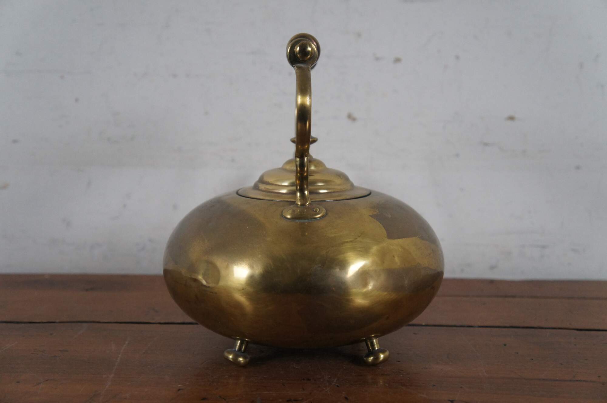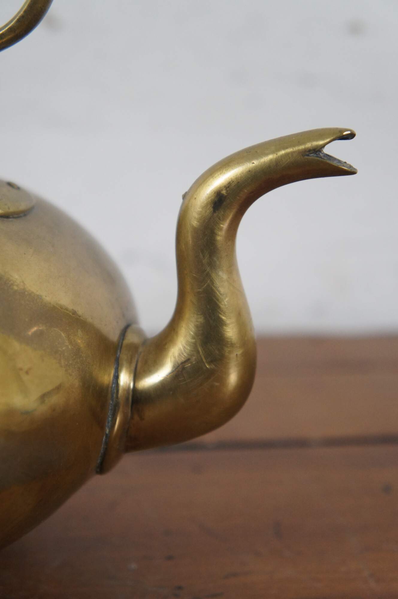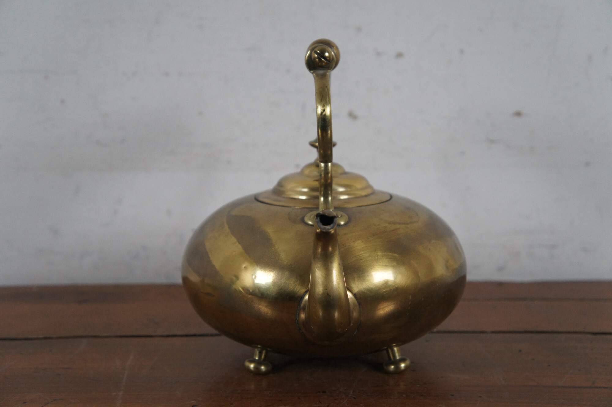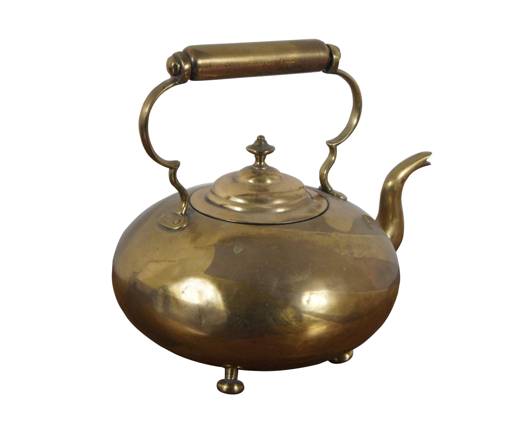 Antique Scottish brass Hot Toddy / tea / Coffee kettle with low round body, small goose neck terminating in a bird spout, four round mushroom shaped feet, top shaped finial lid, and fixed handle.