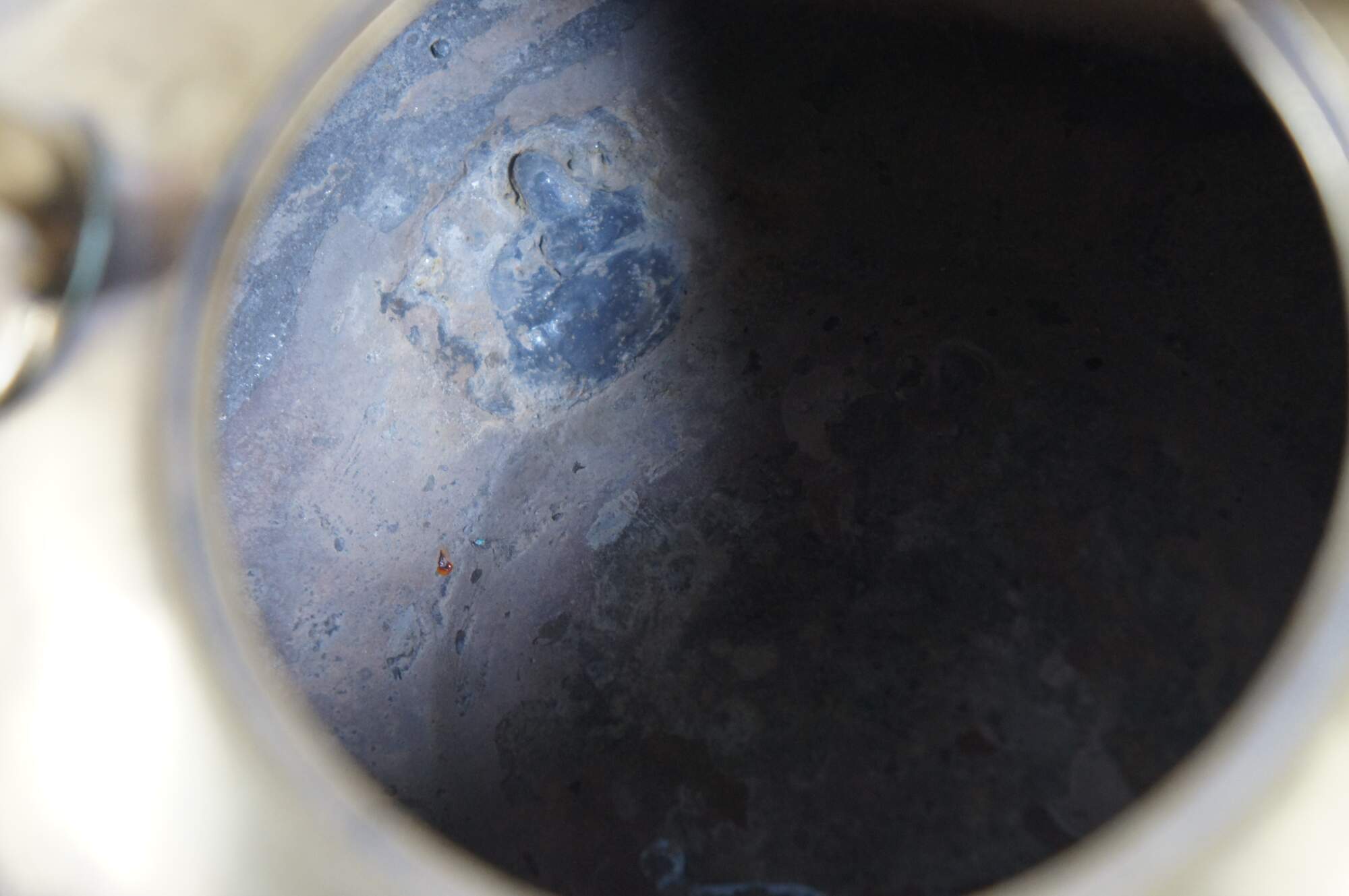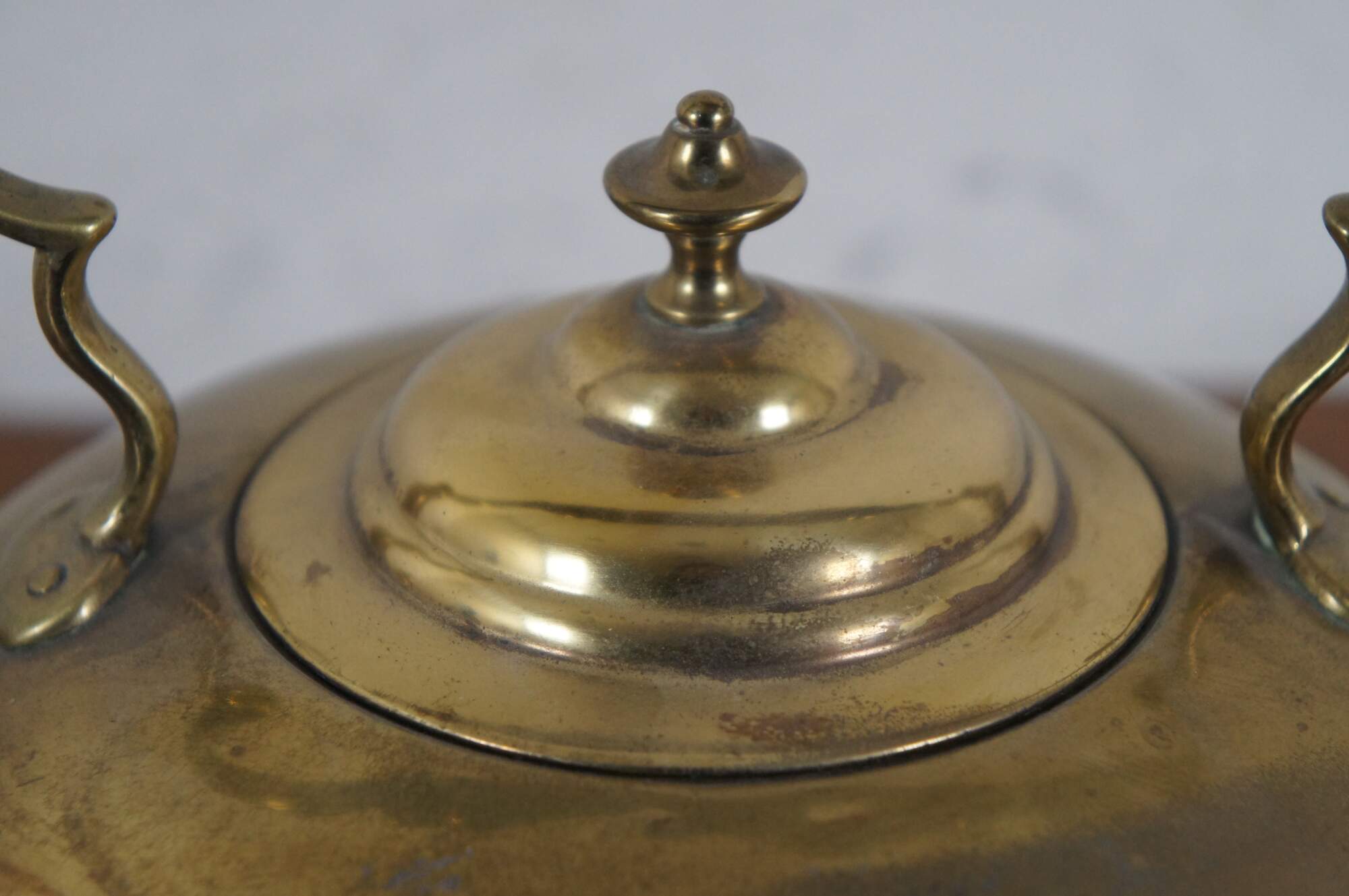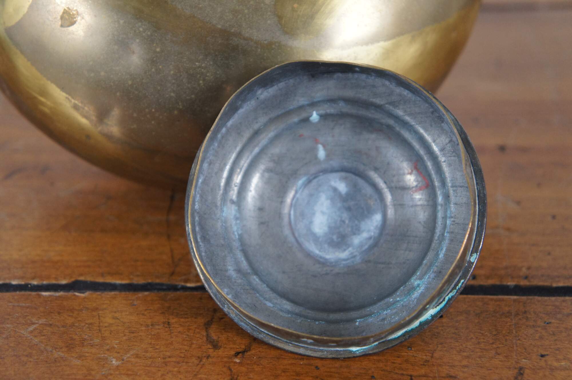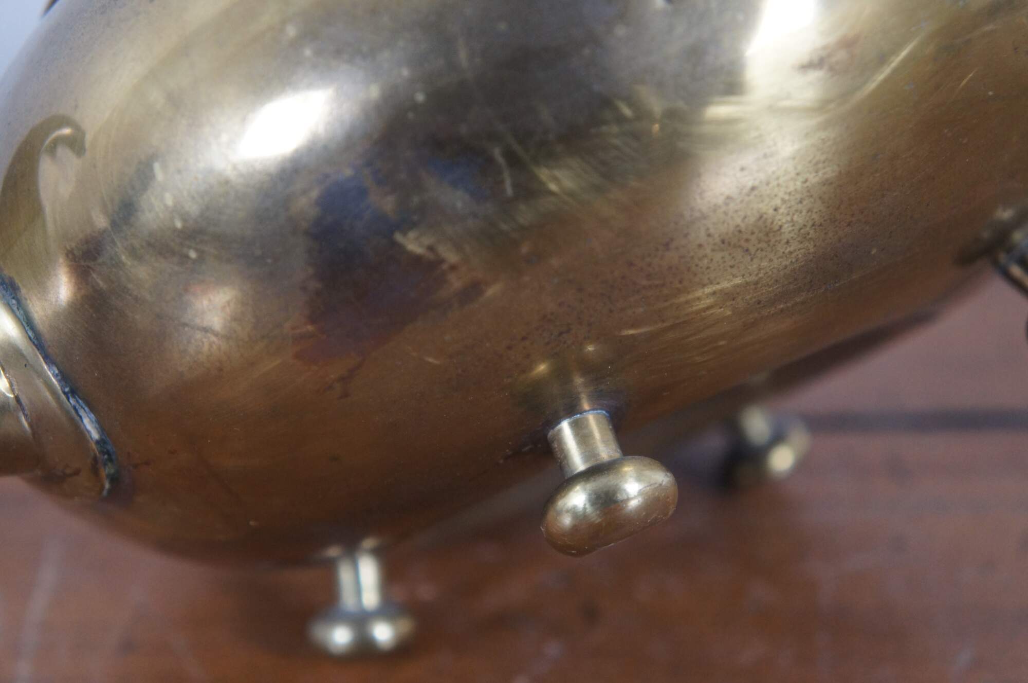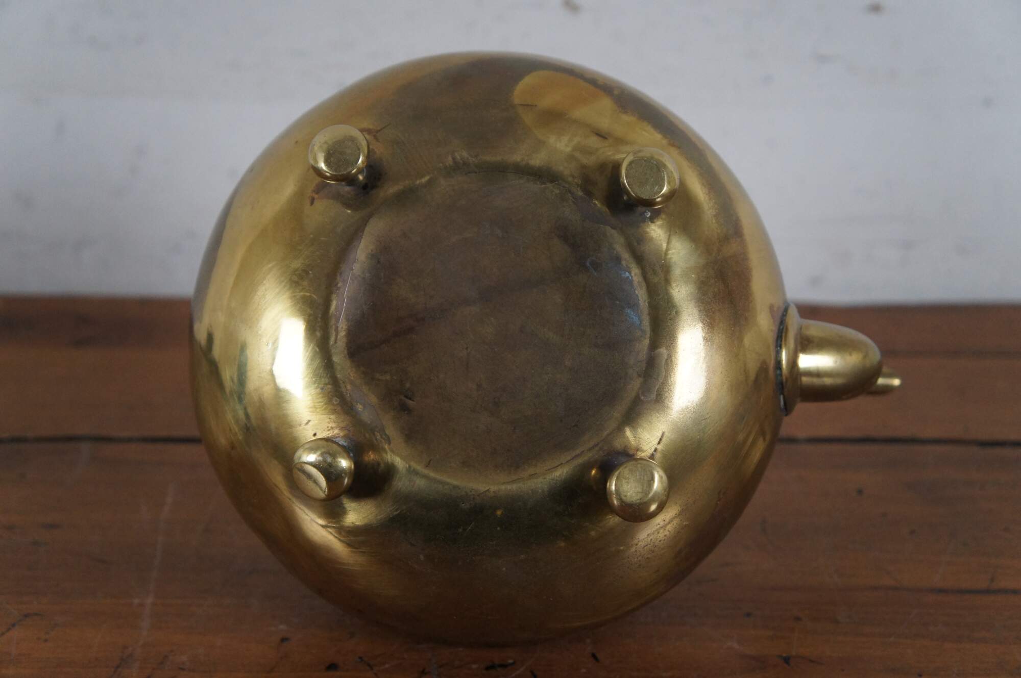 Antique Scottish brass Hot Toddy / tea / Coffee kettle with low round body, small goose neck terminating in a bird spout, four round mushroom shaped feet, top shaped finial lid, and fixed handle.