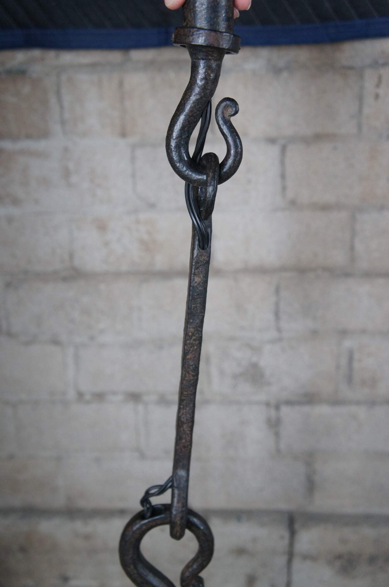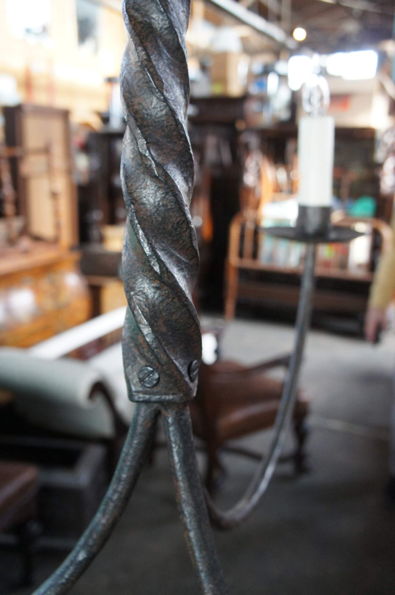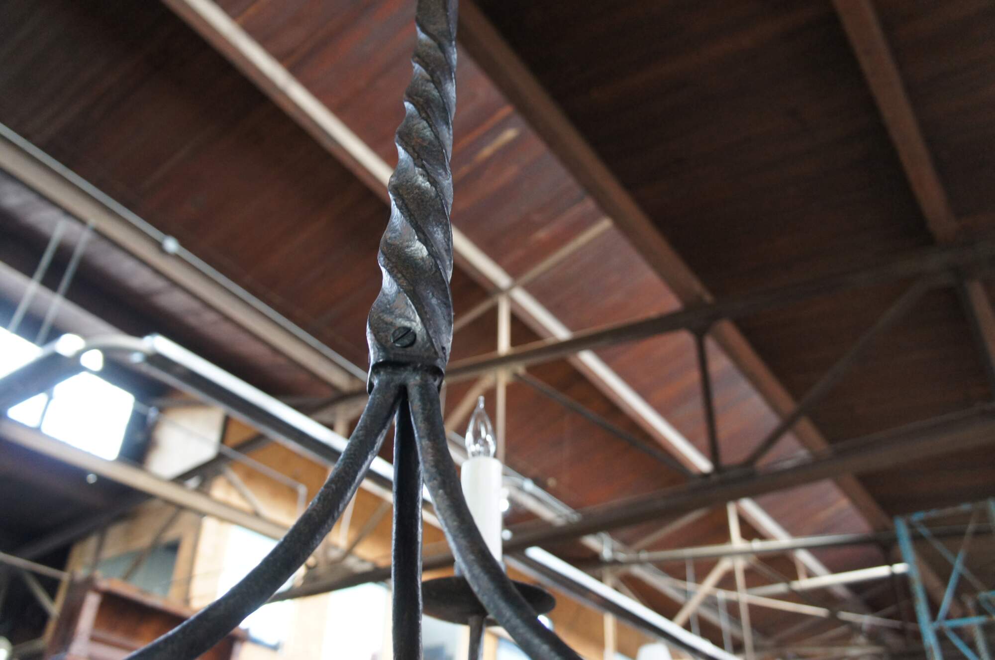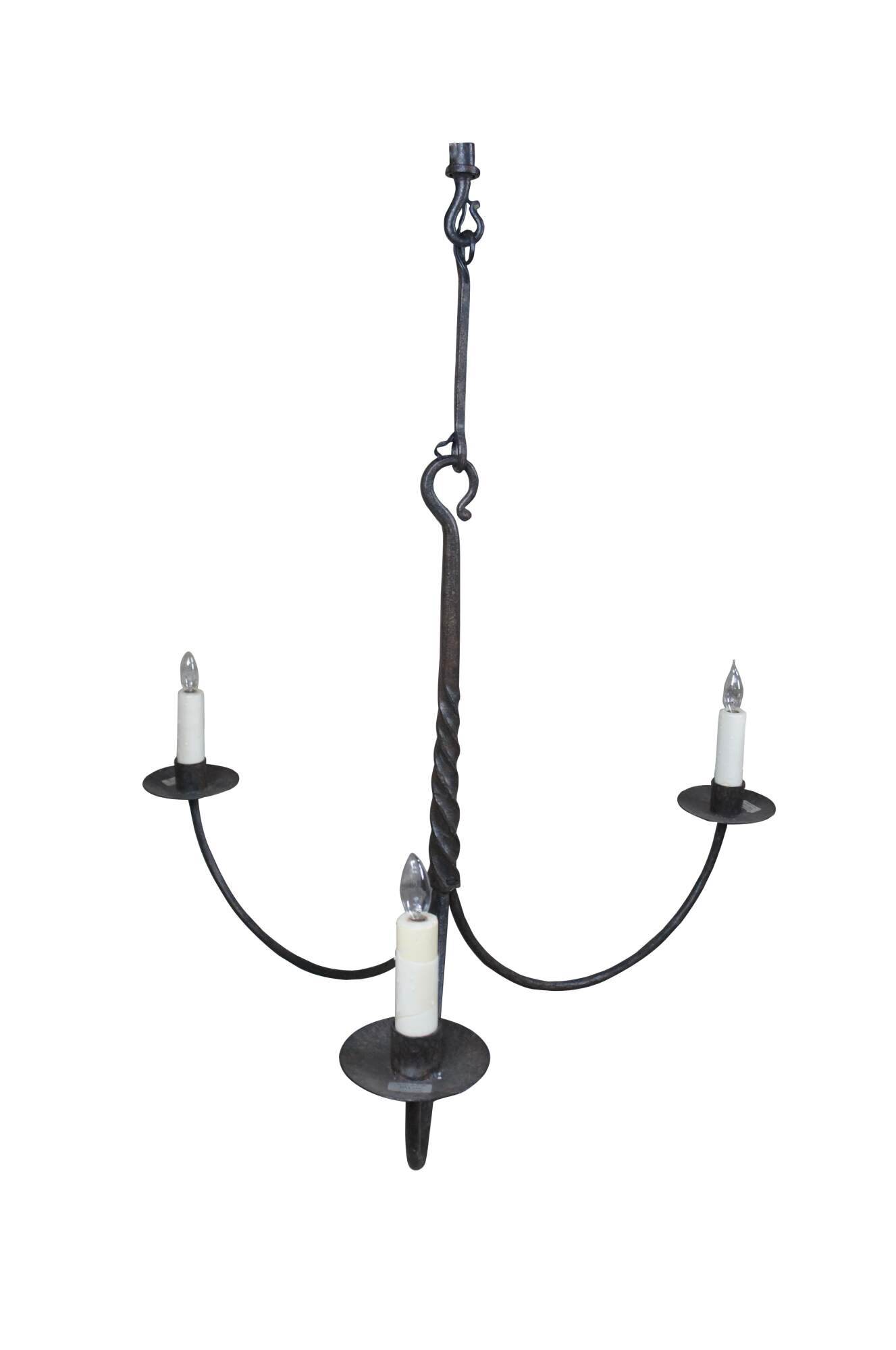 Paul Ferrante old iron forged wrought iron chandelier. Features primitive old world stying with twisted center and downswept arms leading to three lights with wax drip pans and candle covers.