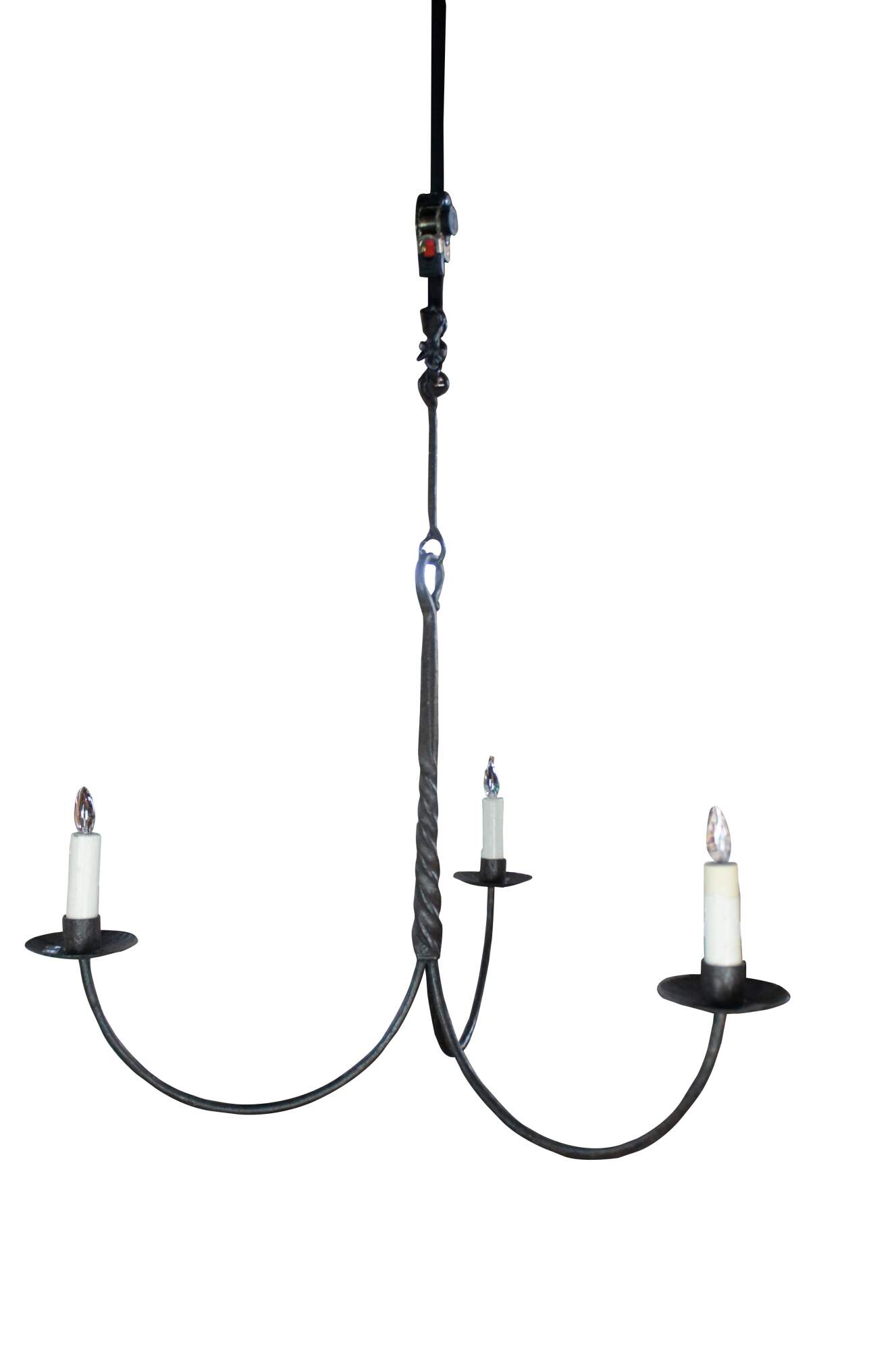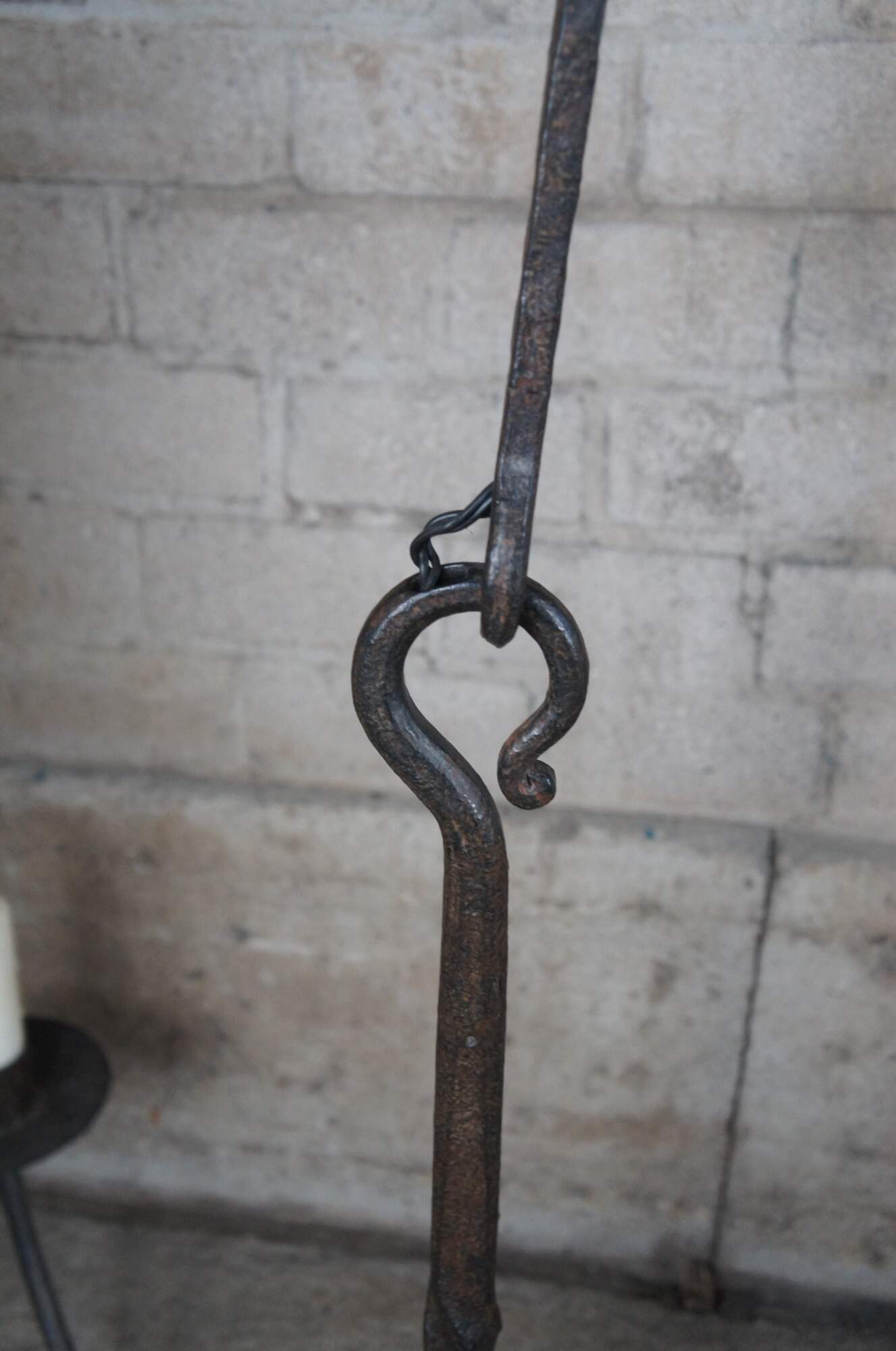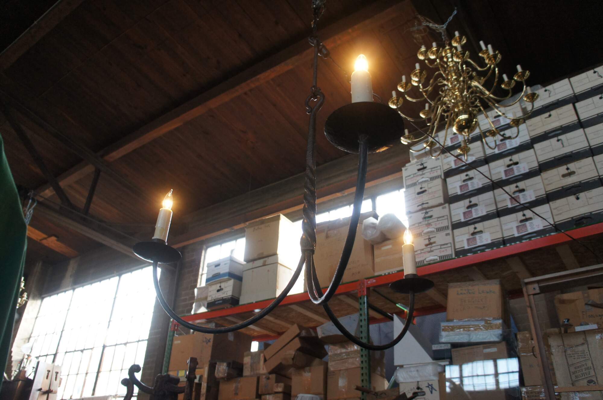 Paul Ferrante old iron forged wrought iron chandelier. Features primitive old world stying with twisted center and downswept arms leading to three lights with wax drip pans and candle covers.