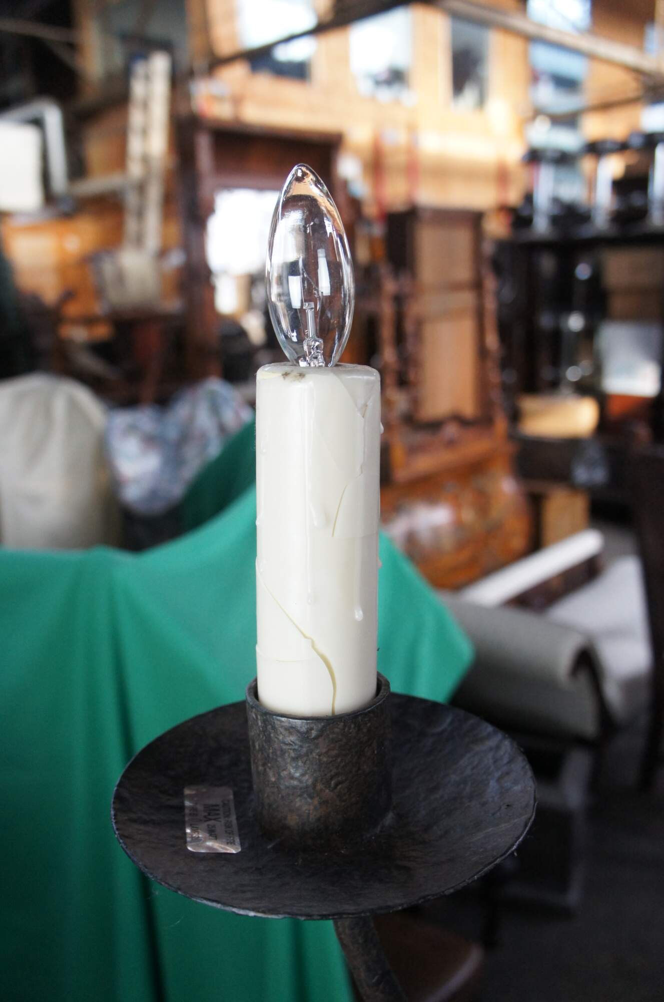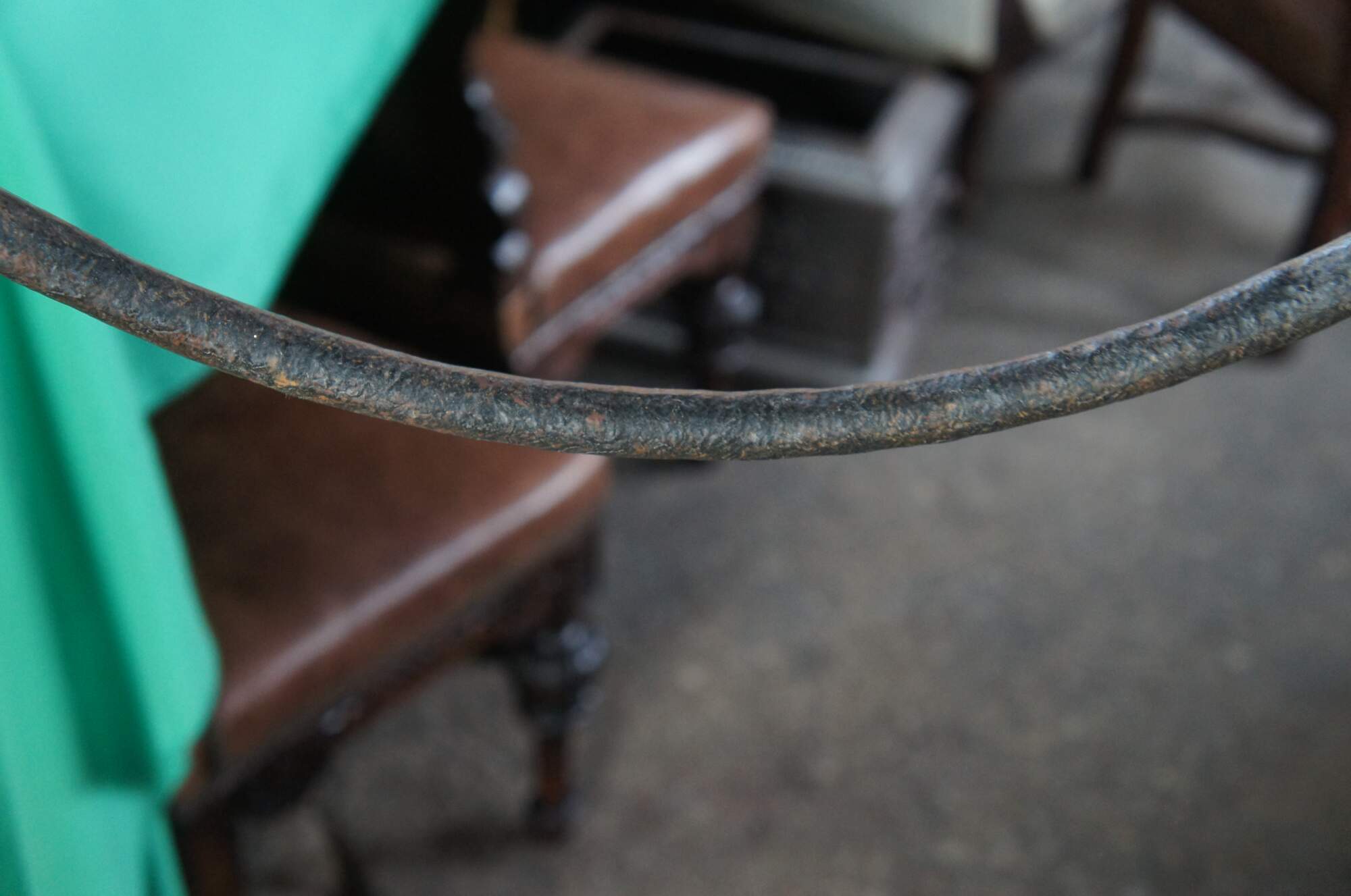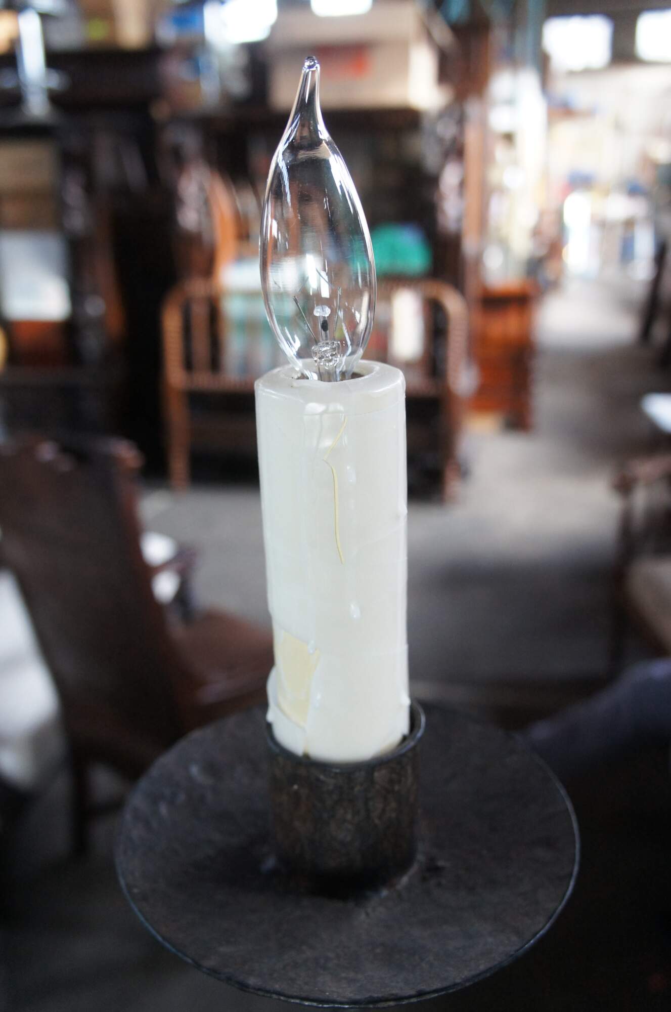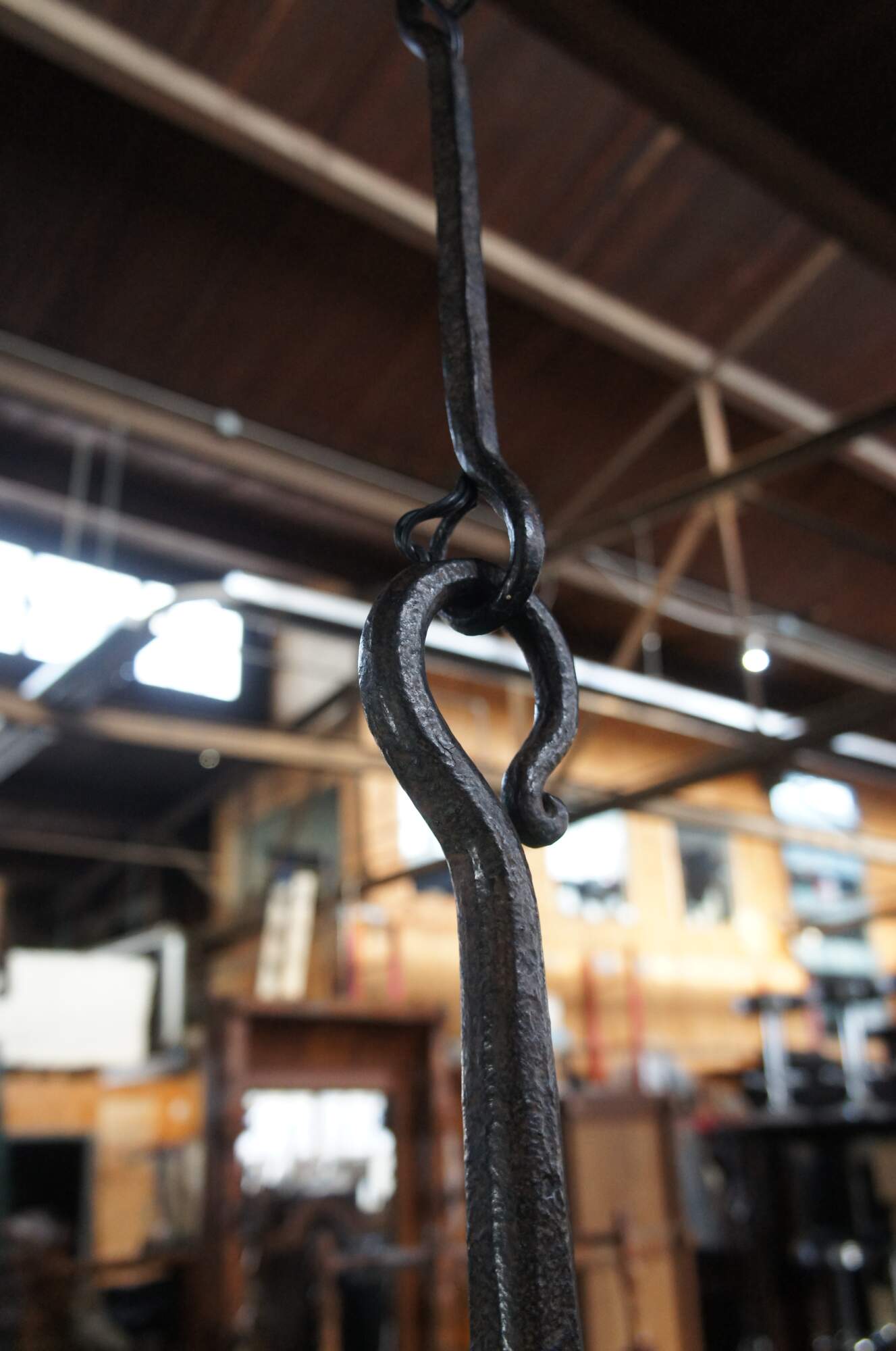 Paul Ferrante old iron forged wrought iron chandelier. Features primitive old world stying with twisted center and downswept arms leading to three lights with wax drip pans and candle covers.