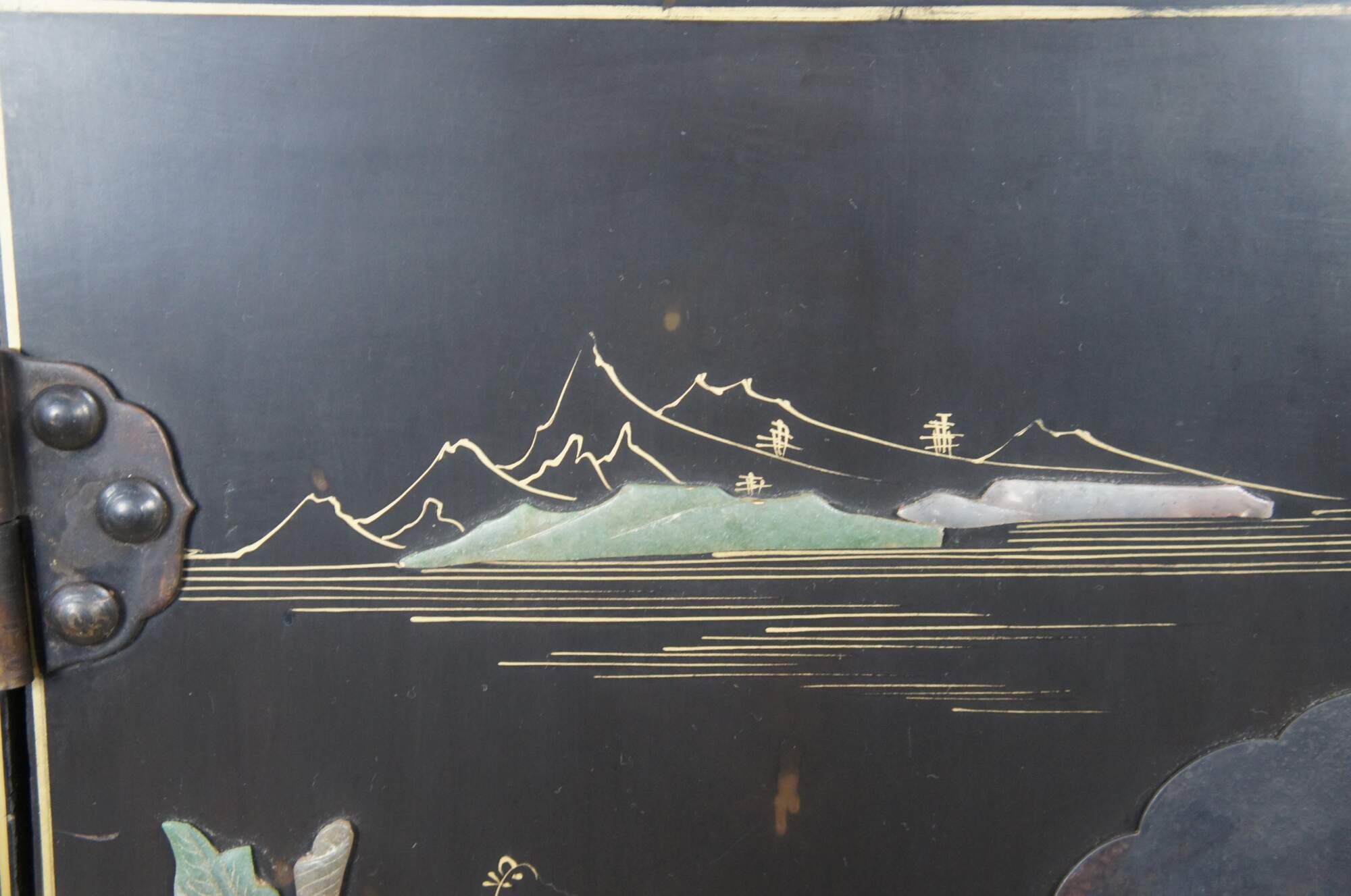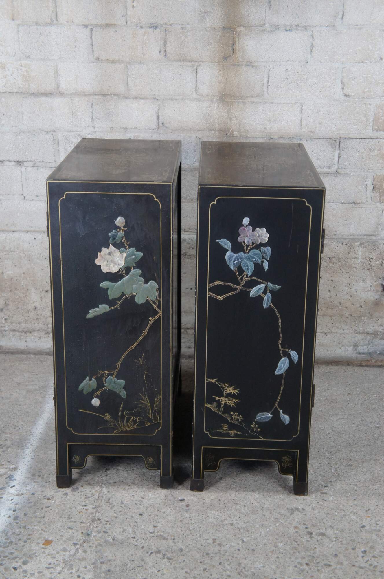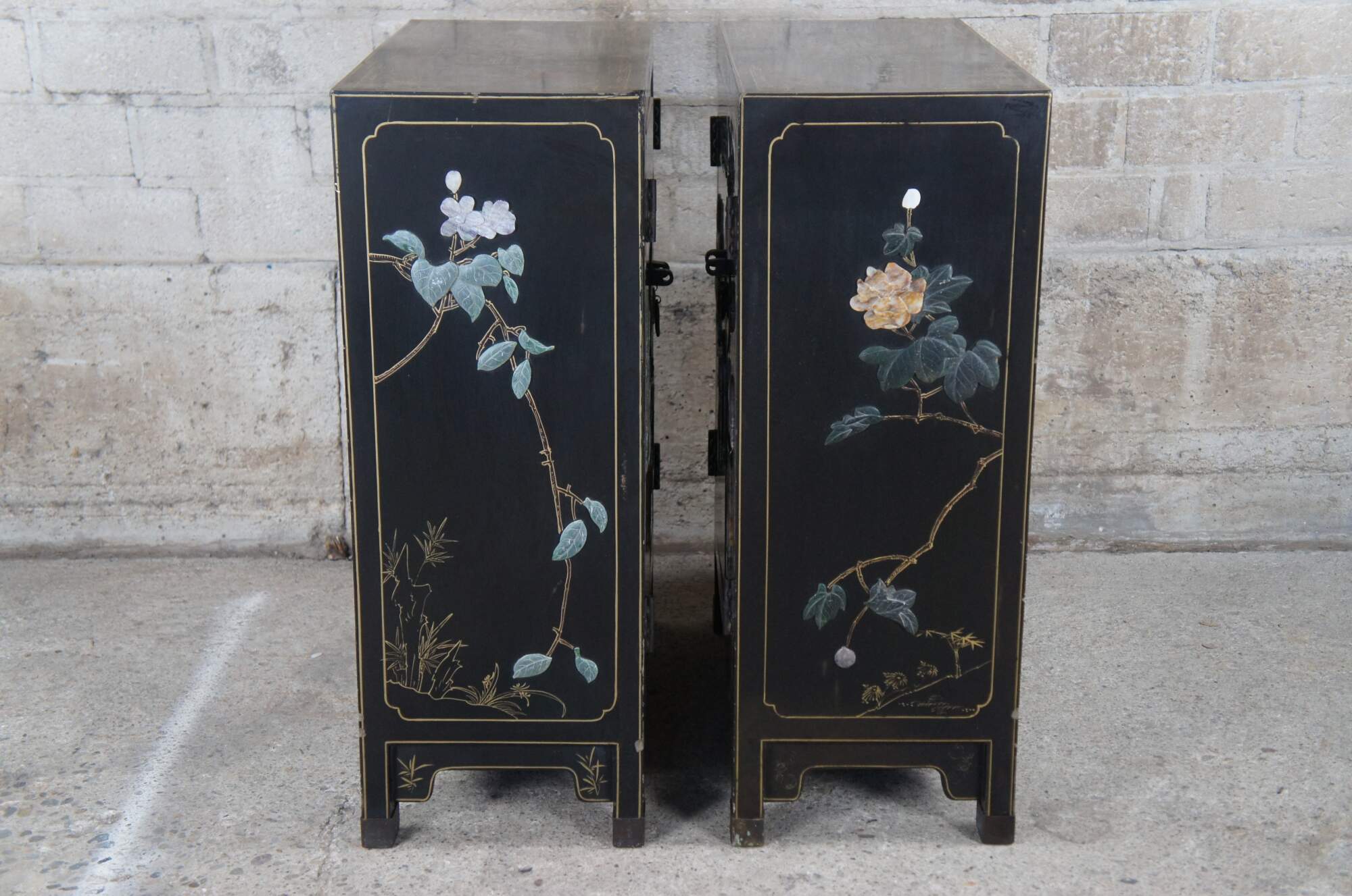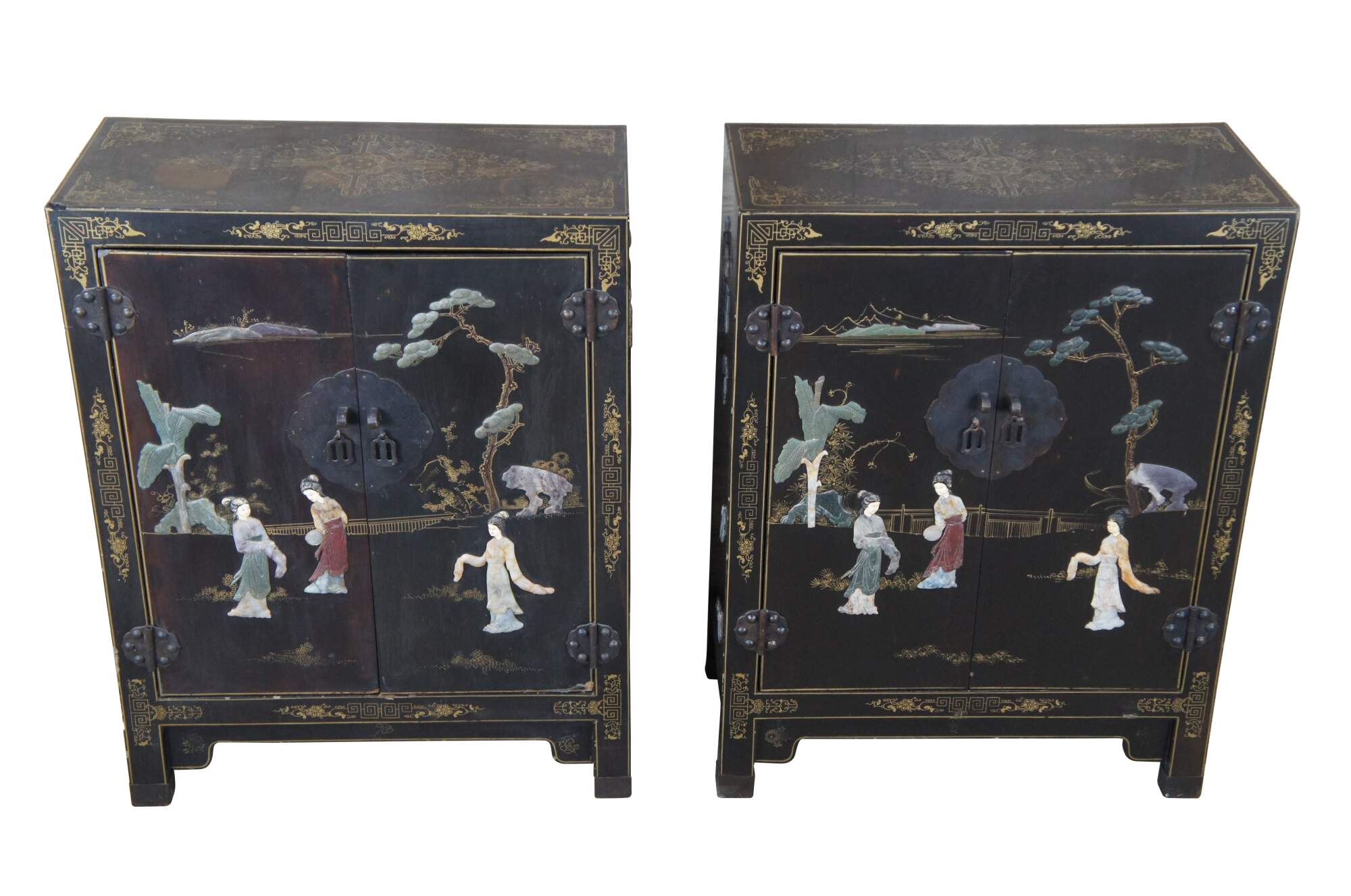Magnificent pair of Chinese Lacquered Low Scholars Cabinets, circa second half 20th century. Double Doors Open to Single Shelf over shaped apron. Each features Carved Hardstone and intricate gold filigree / latticework designs with social scenes. Geishas are elegantly placed at the foreground of each landscape. The sides are accented by branches, flowers and bamboo. The chests are matching in size and include patinated metal lockplates Great for use as consoles or altar cabinets in any entryway or room.