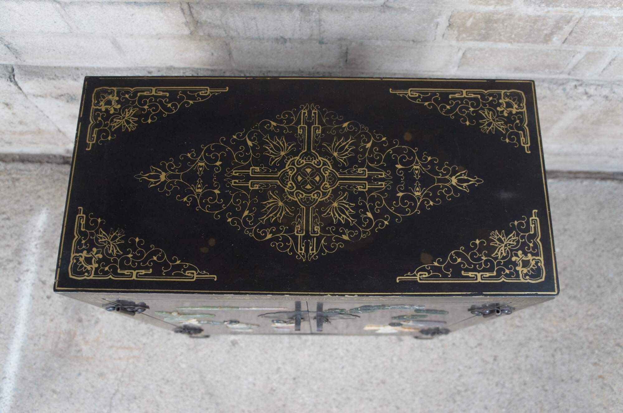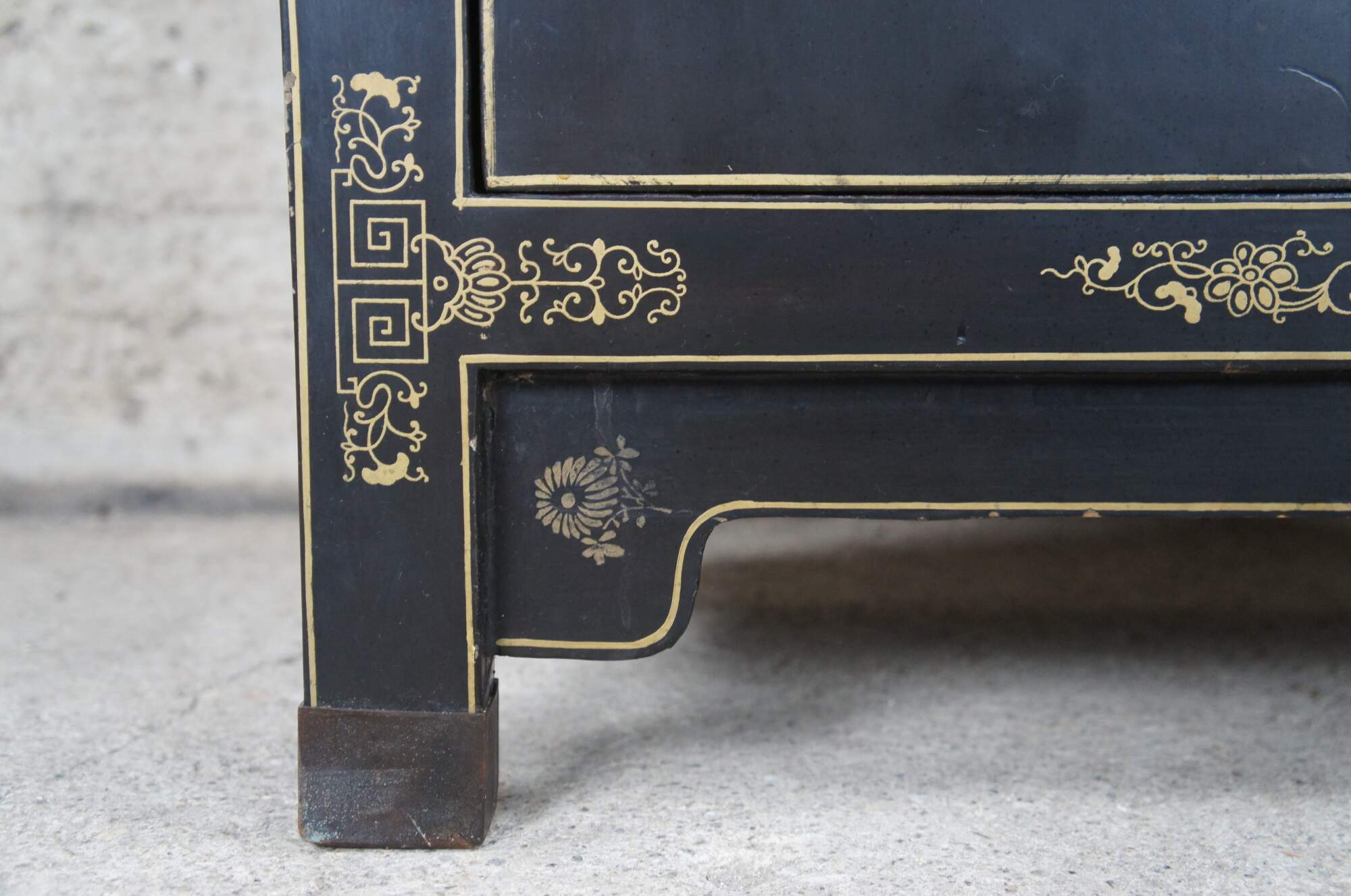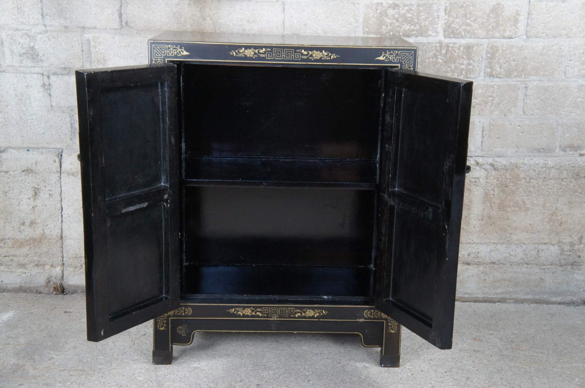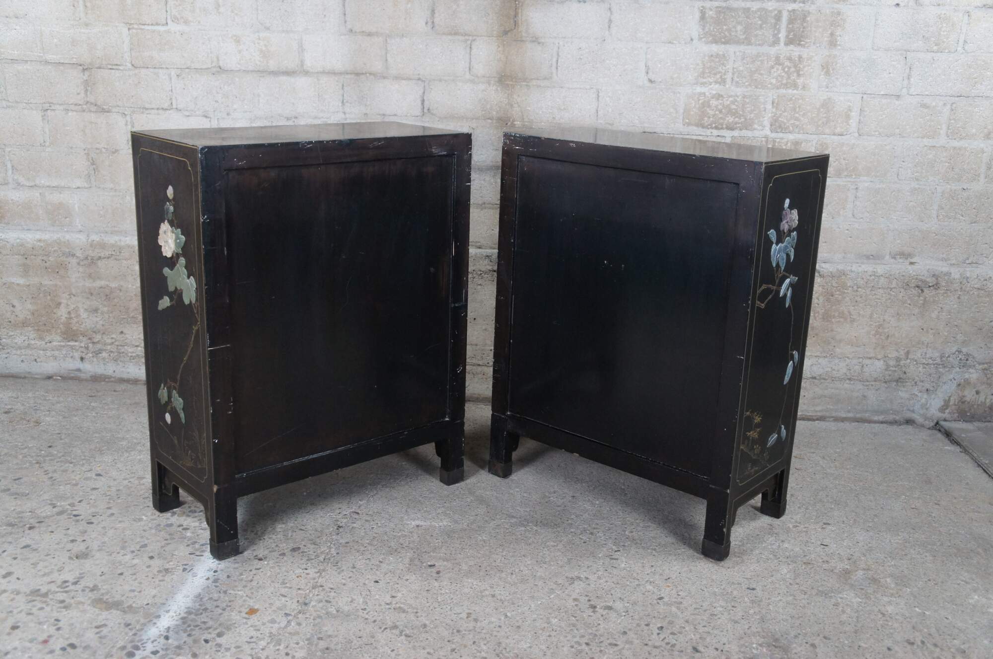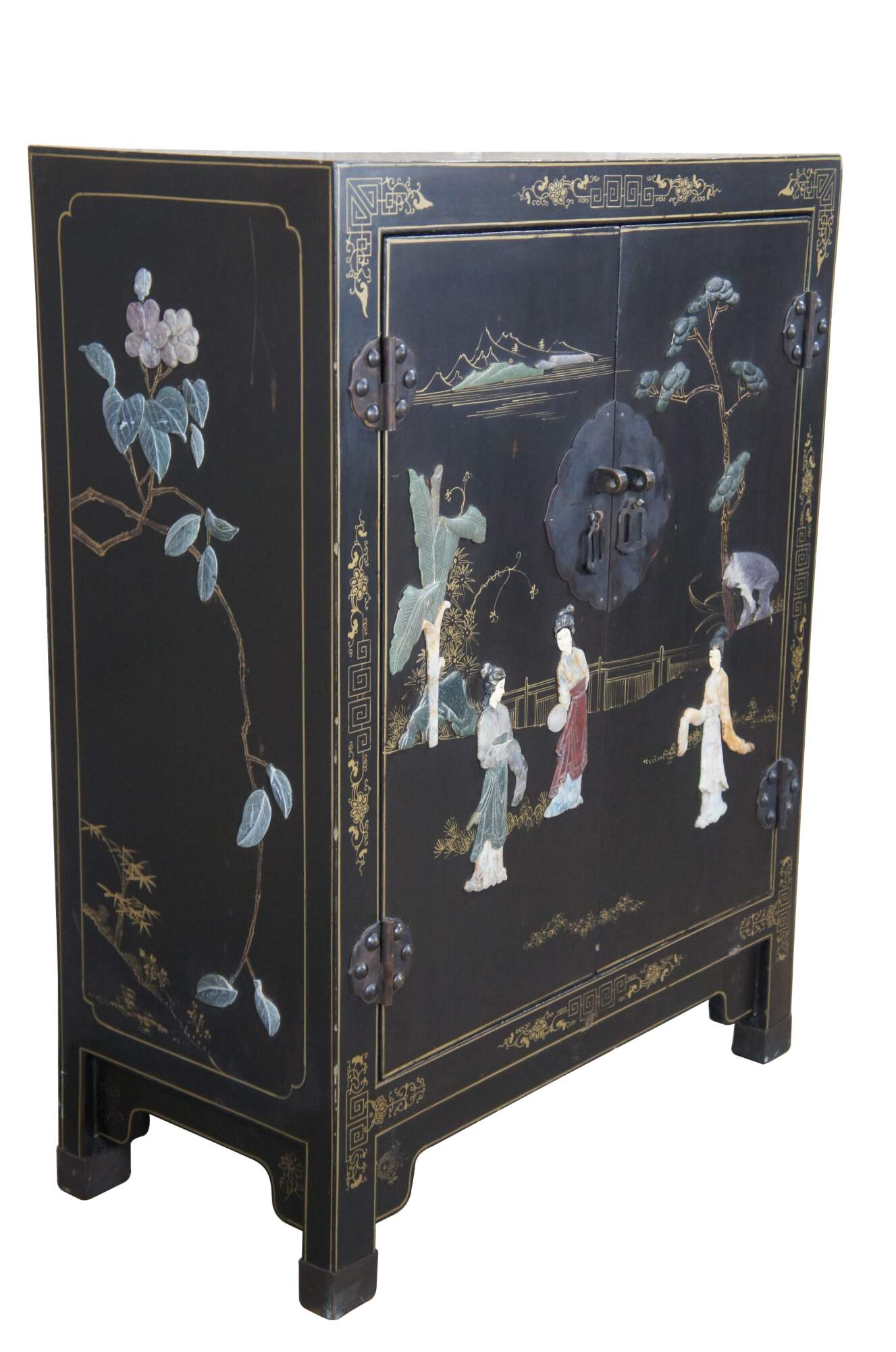 Magnificent pair of Chinese Lacquered Low Scholars Cabinets, circa second half 20th century. Double Doors Open to Single Shelf over shaped apron. Each features Carved Hardstone and intricate gold filigree / latticework designs with social scenes. Geishas are elegantly placed at the foreground of each landscape. The sides are accented by branches, flowers and bamboo. The chests are matching in size and include patinated metal lockplates Great for use as consoles or altar cabinets in any entryway or room.