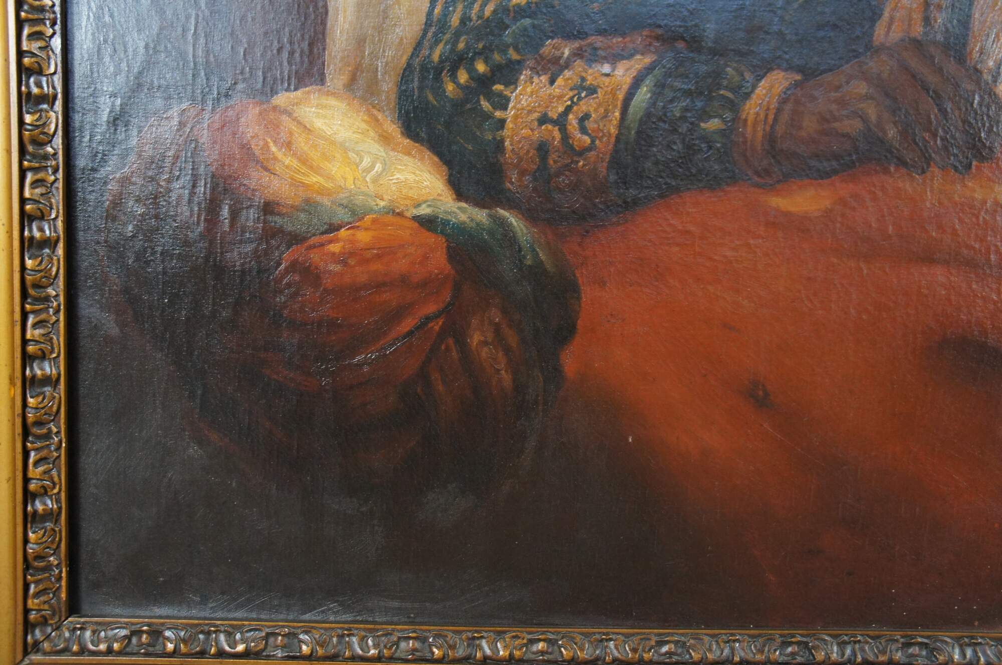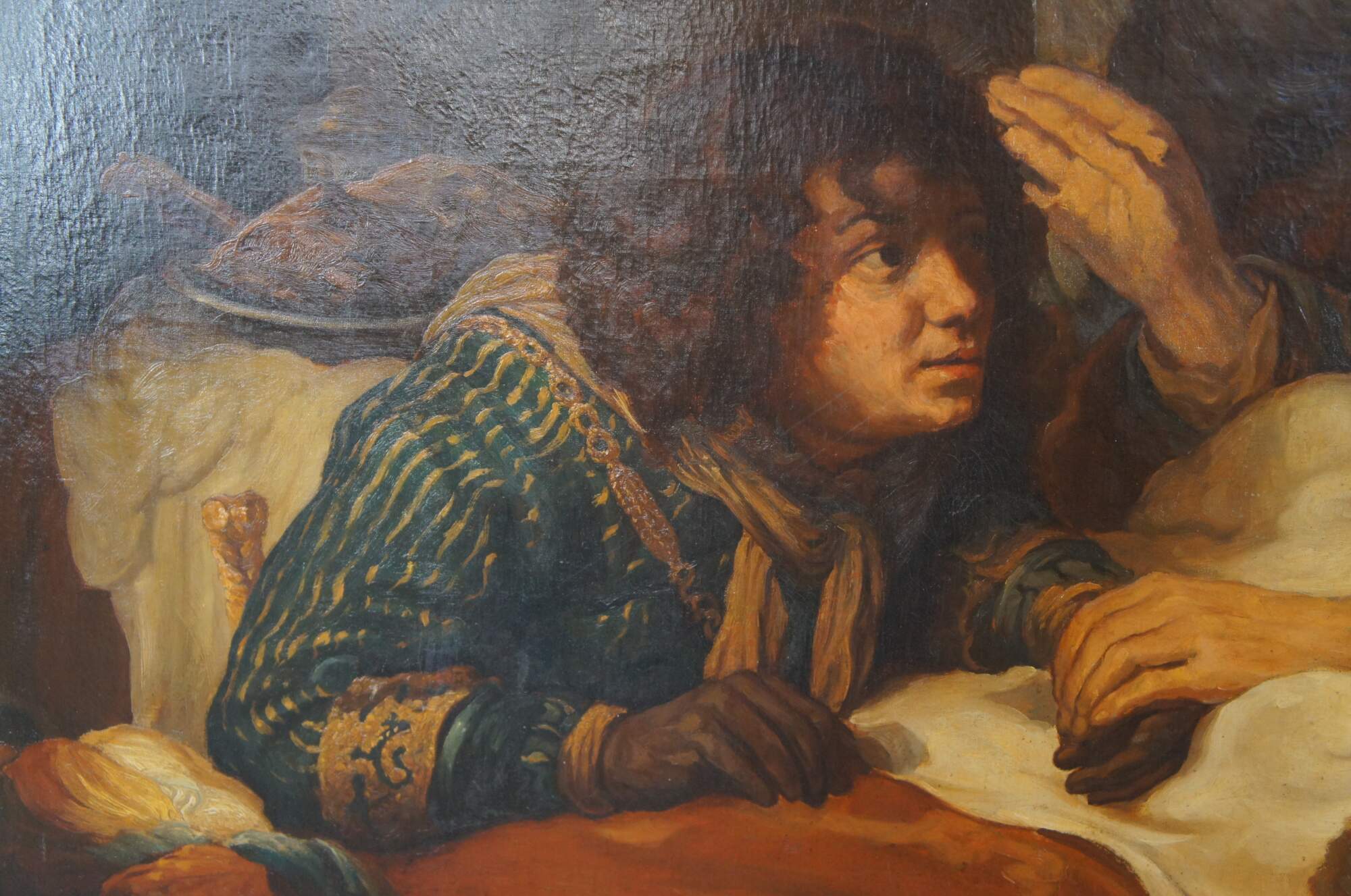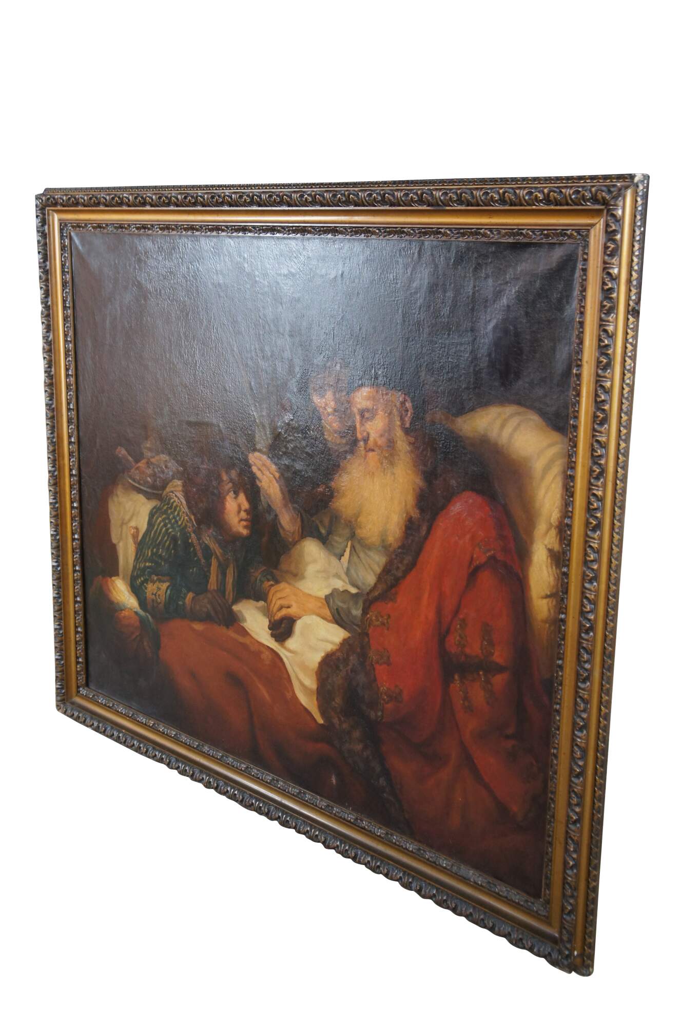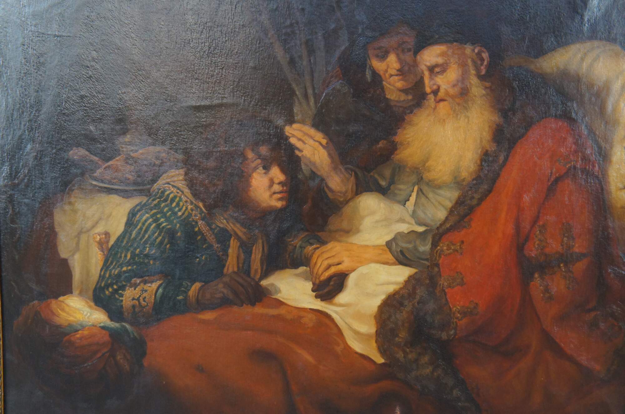 An exceptional original Old Master reproduction of Isaac 'Blessing Jaacob' after Govert Flinck, a student of Rembrandt. The original 17th century (1638) oil on canvas is now in the Rijksmuseum in Amsterdam. The painting recounts a scene from the bible when Jacob pretended to be his brother Esau and tricks his blind father Isaac to bless him with the birthright. The art style is reminiscent of Rembrandt, whom Flinck was trained by.