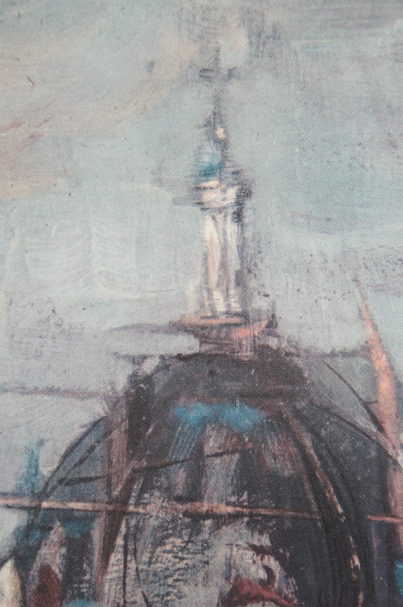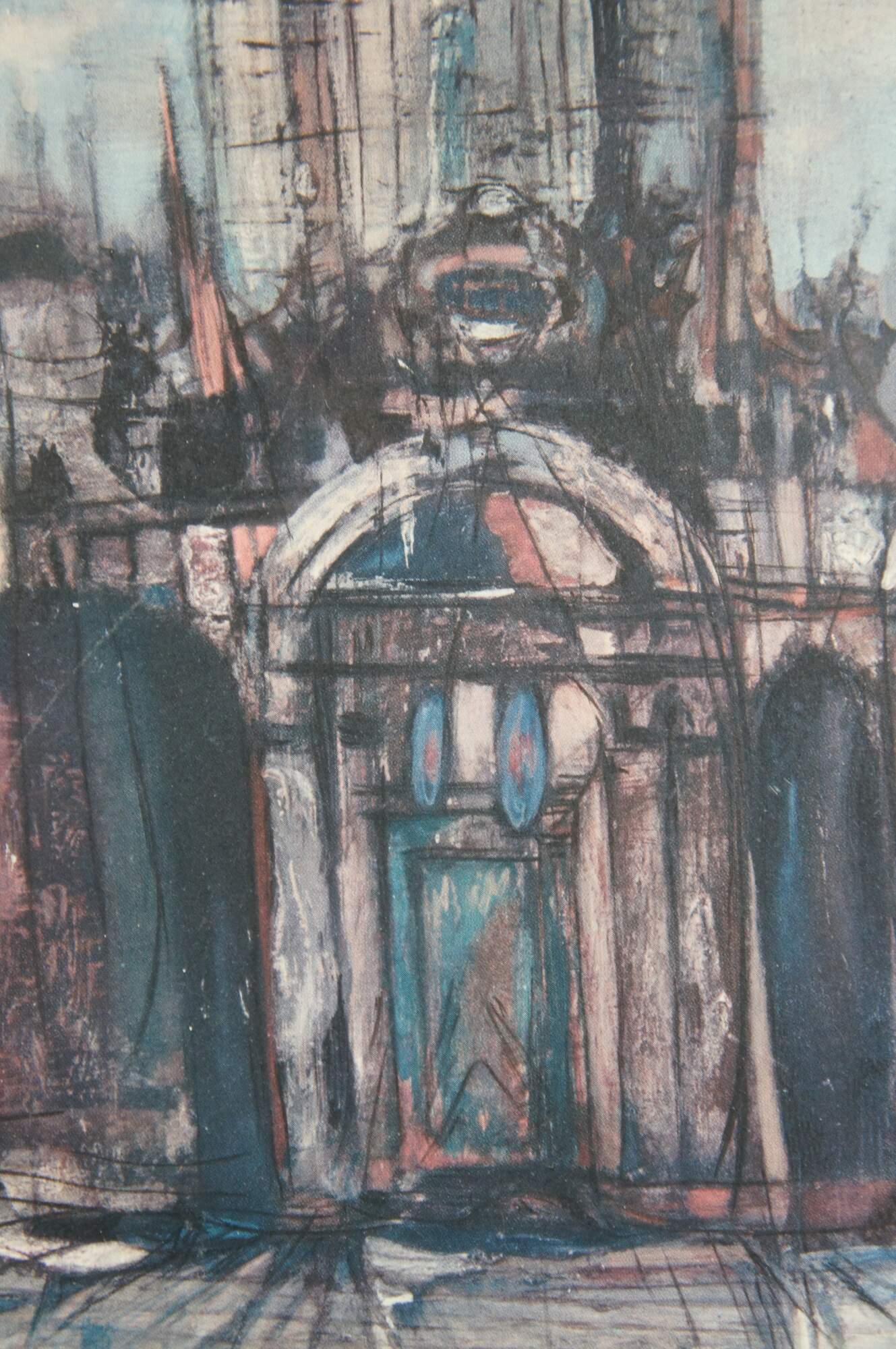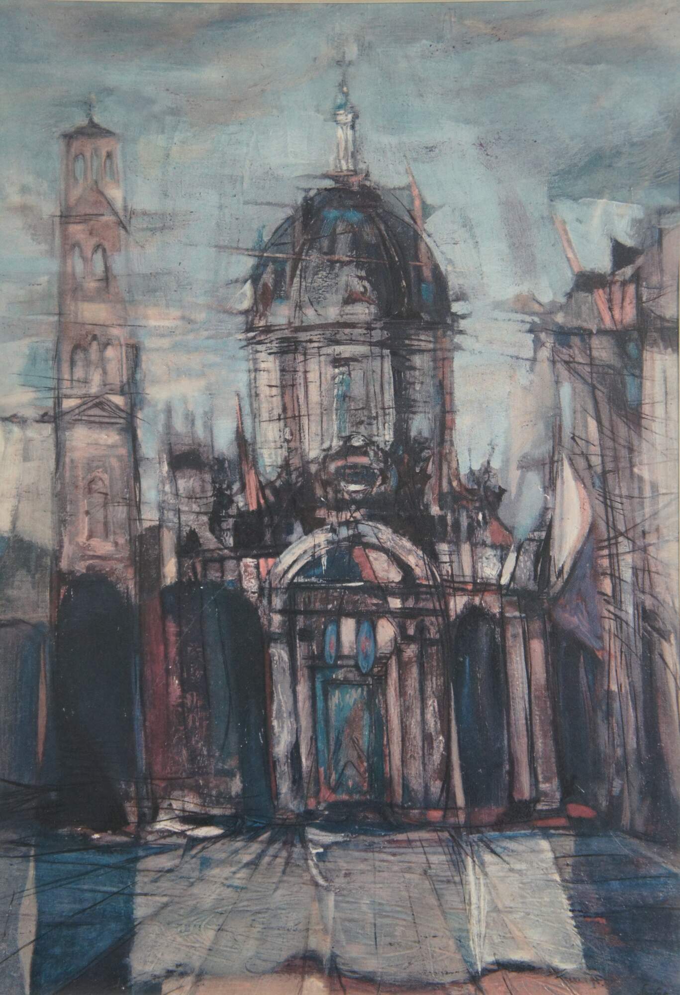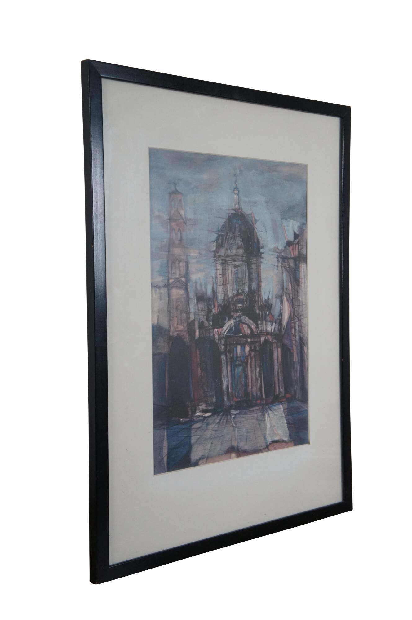 Vintage impressionist / expressionist style digital print depicting the entrance of a domed church building with a bell tower at the left. Pencil signed in lower right corner. Black painted wood frame; white mat.