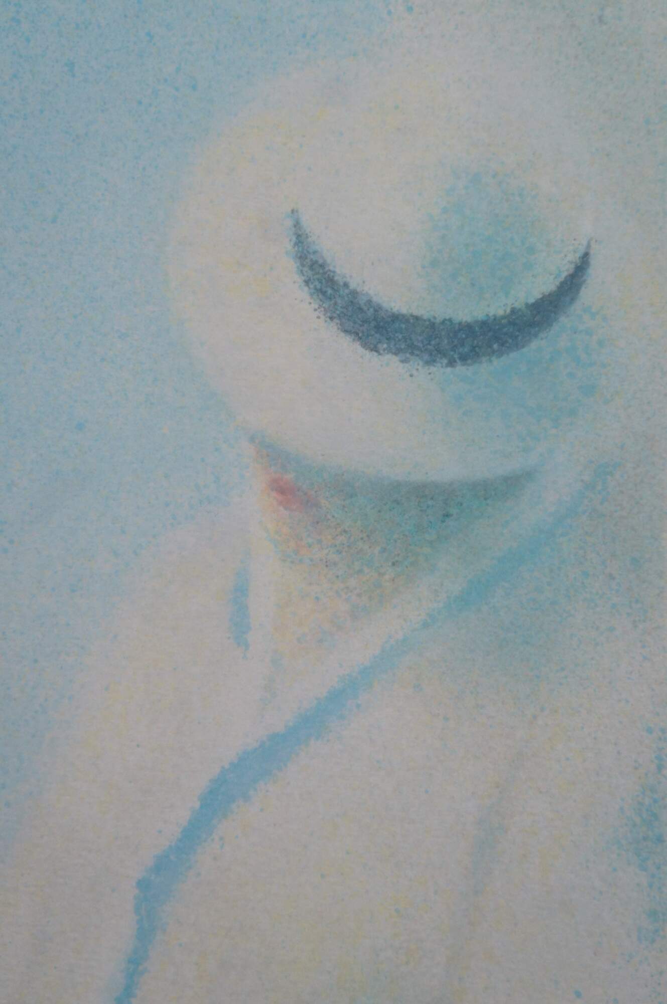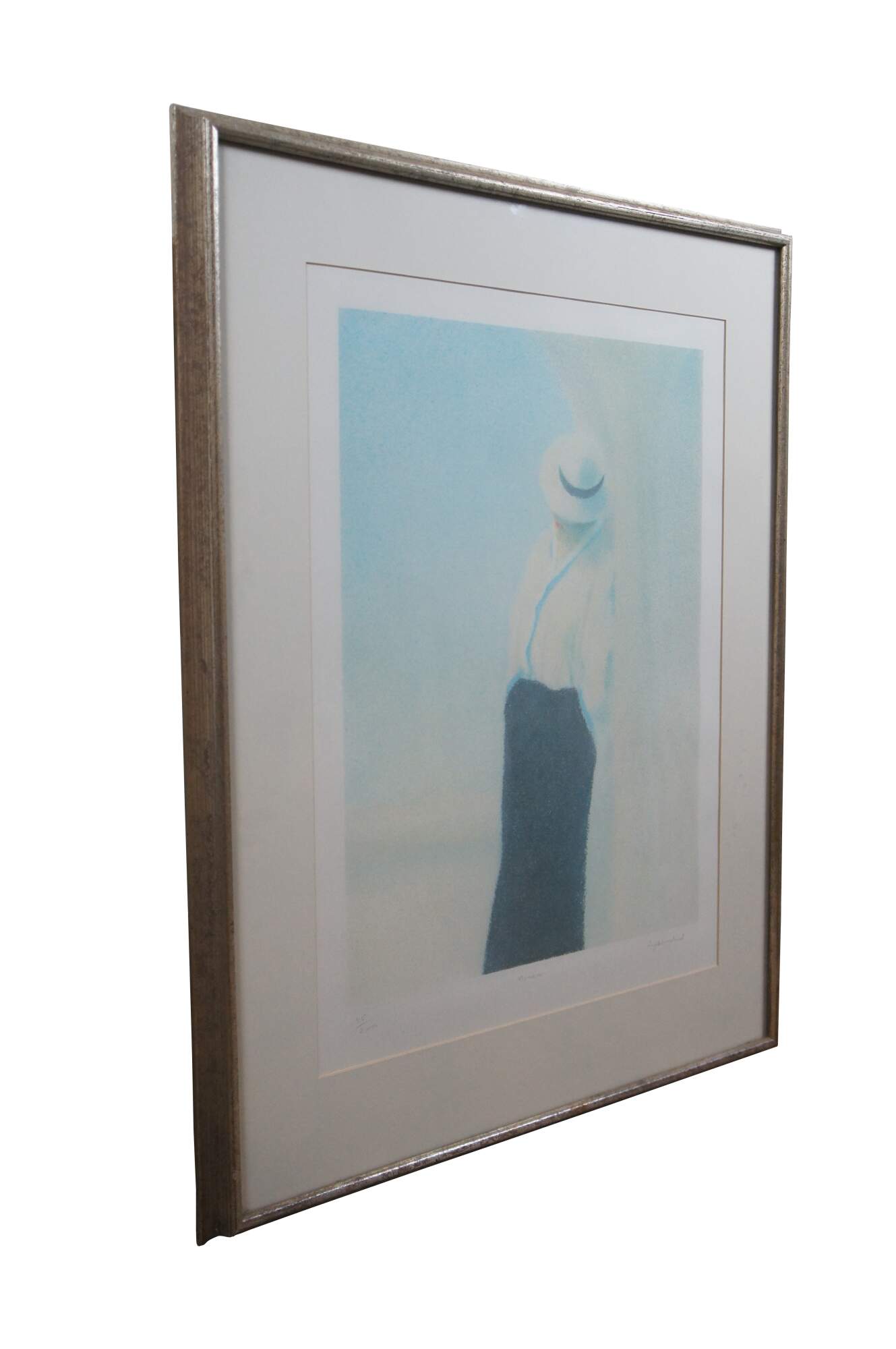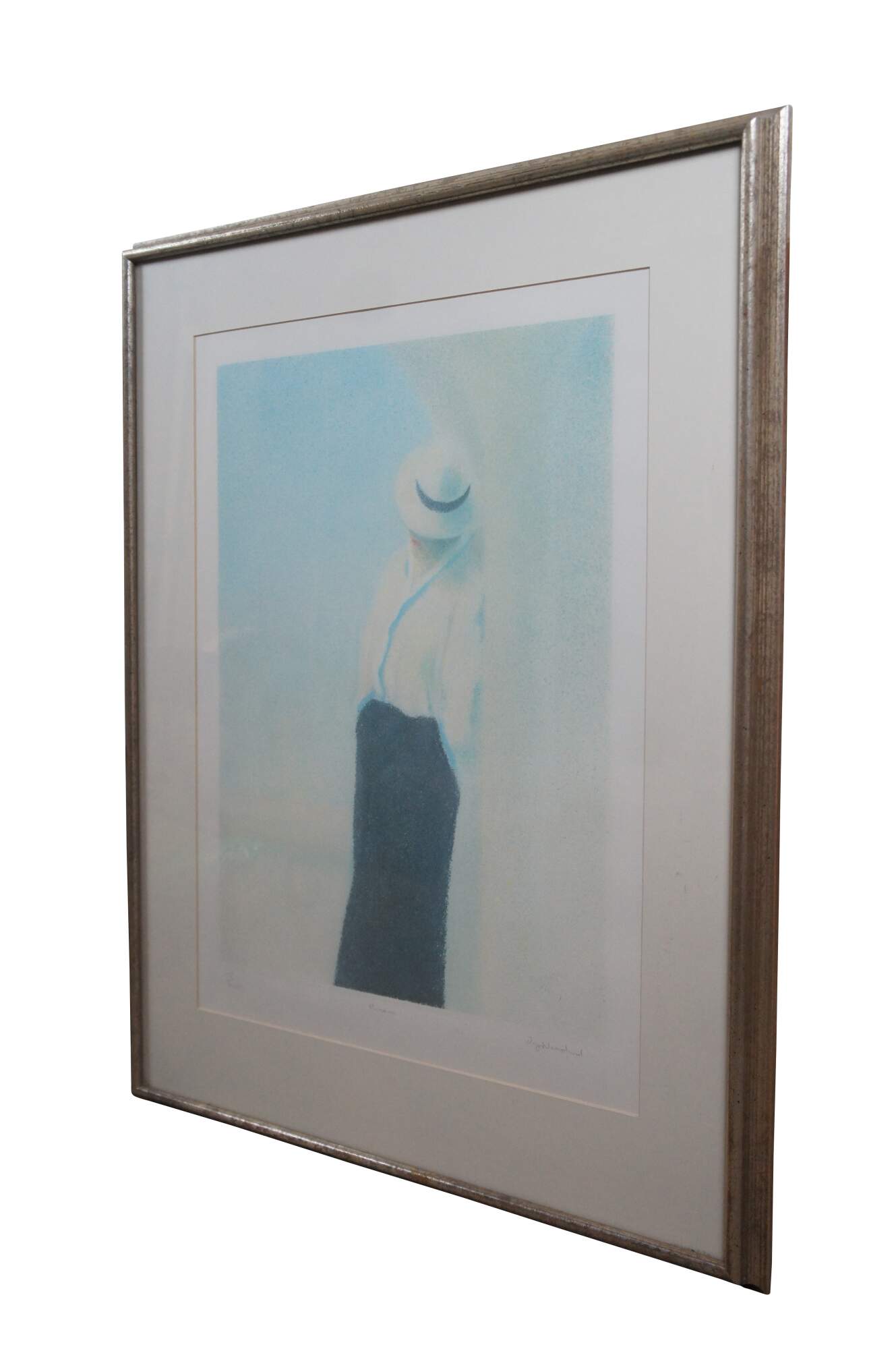 Vintage pencil signed, limited edition lithograph print titled "Monaco" by Roy Fairchild Woodard, showing a figure in dark pants, white shirt and white hat, leaning against a white tree. Pencil signed, titled, and numbered 115/250 along bottom edge. Factory distressed champagne gilt frame with raised bevel; white mat.