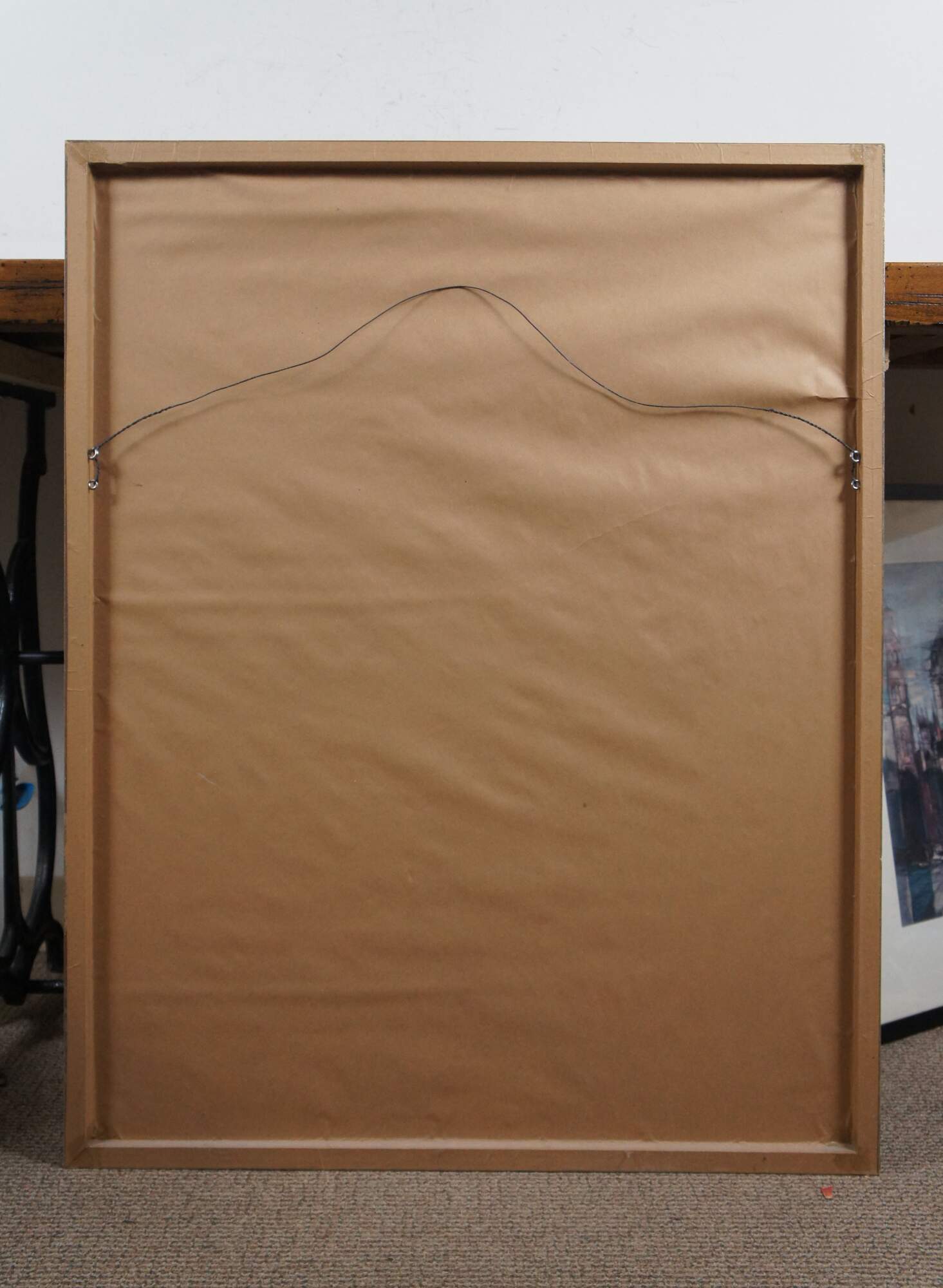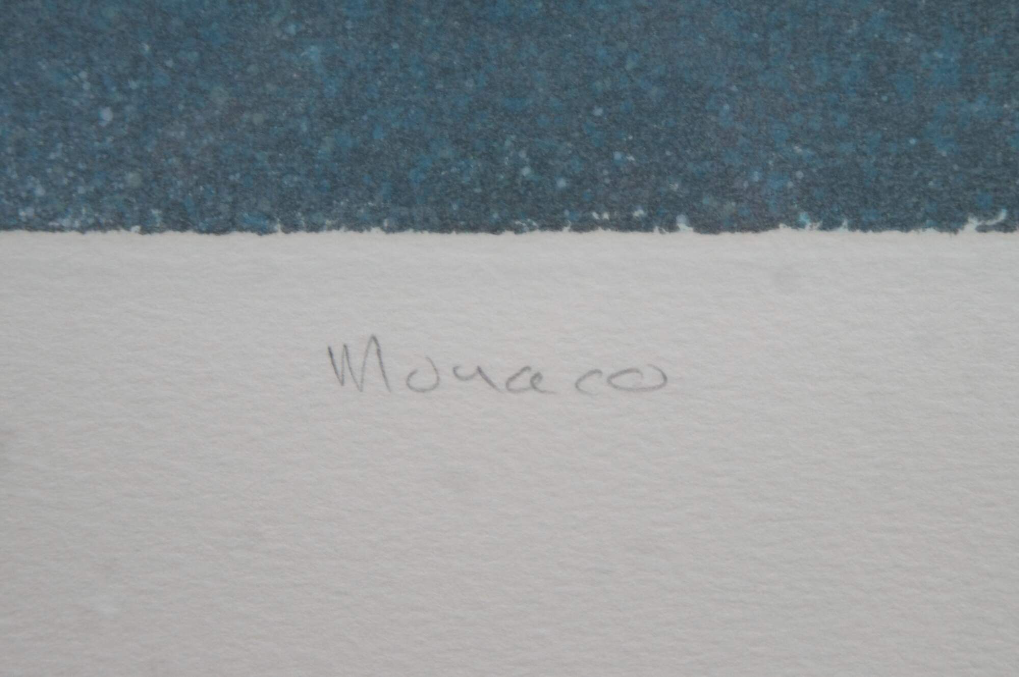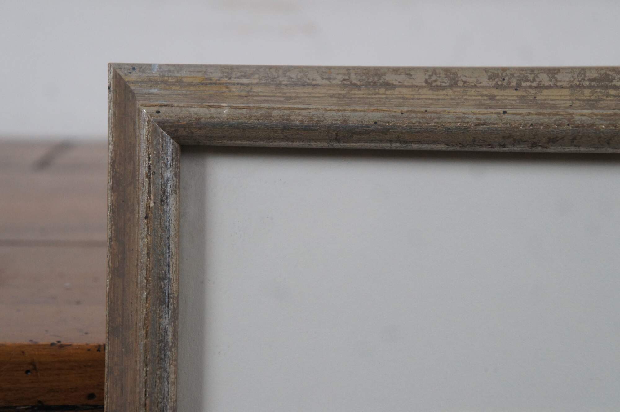 Vintage pencil signed, limited edition lithograph print titled "Monaco" by Roy Fairchild Woodard, showing a figure in dark pants, white shirt and white hat, leaning against a white tree. Pencil signed, titled, and numbered 115/250 along bottom edge. Factory distressed champagne gilt frame with raised bevel; white mat.