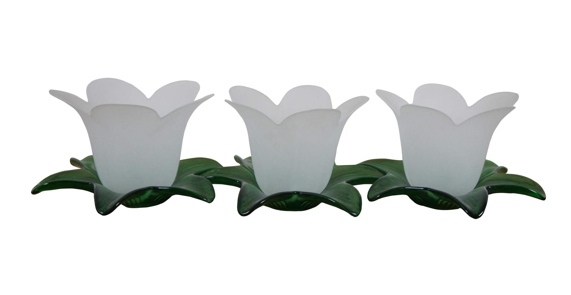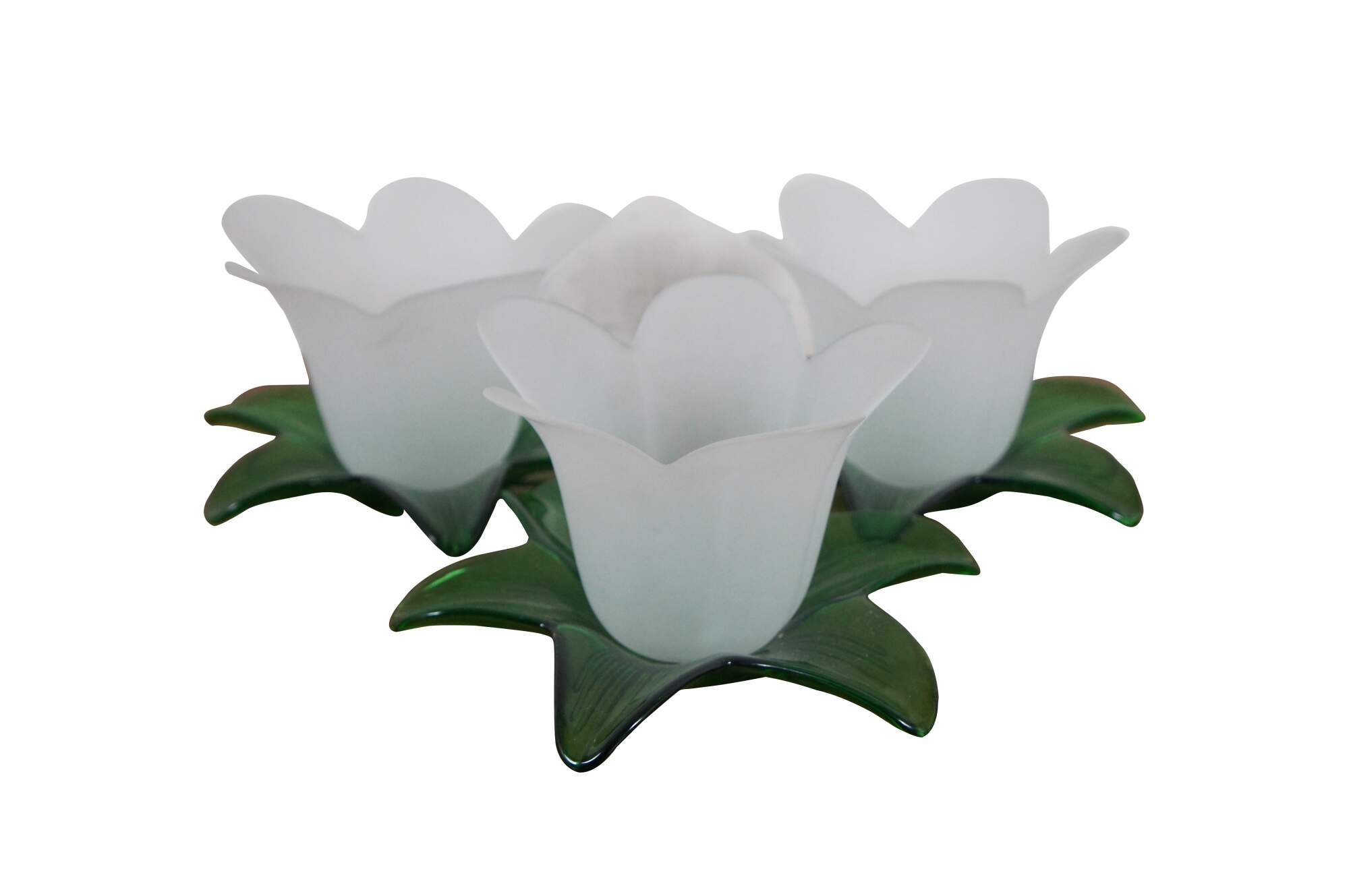 Set of three late 20th century Studio Nova votive / tea light tulip or daffodil shaped floral candle holders. Green leaf shaped bases with white frosted glass petal tops.