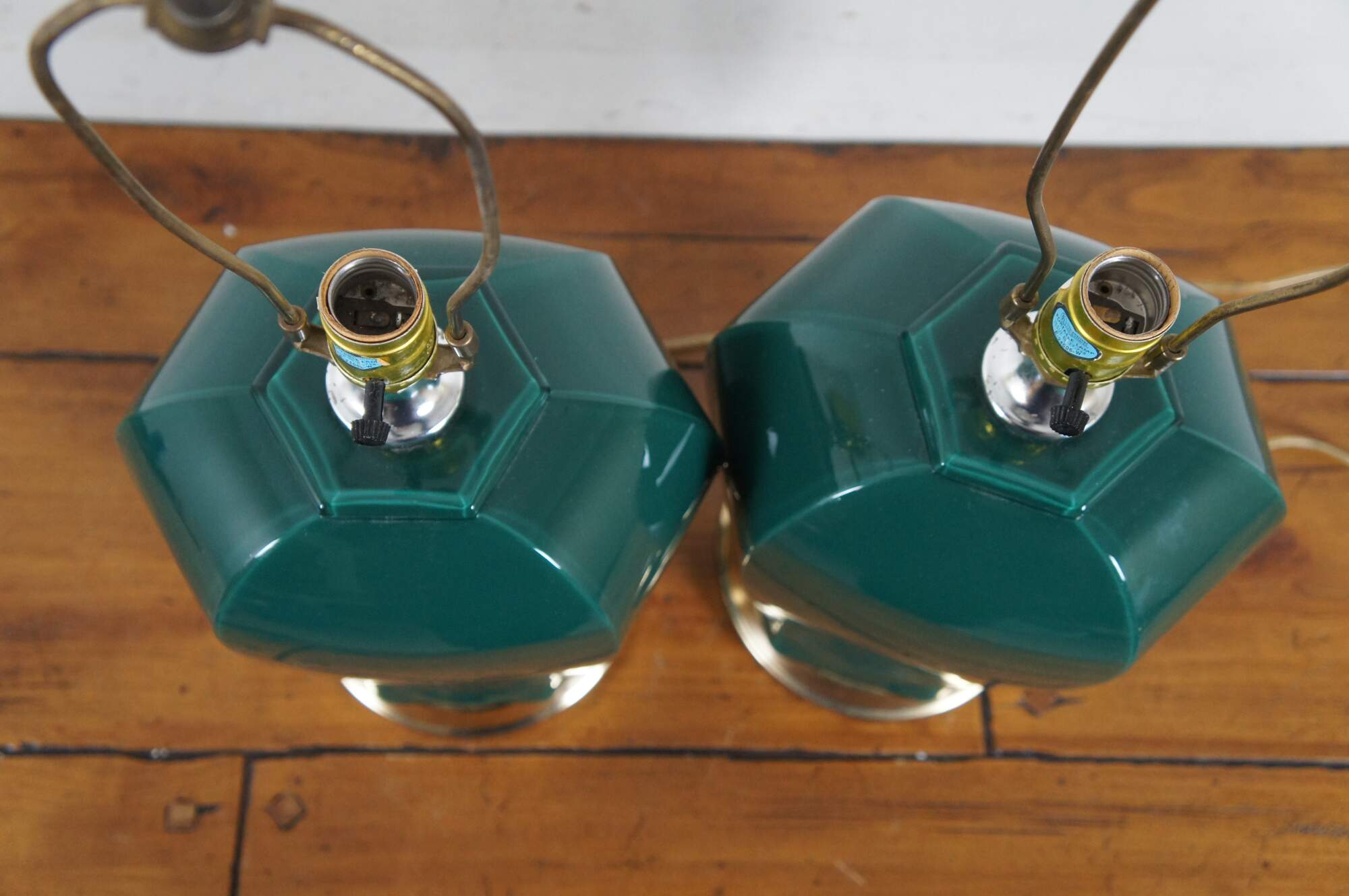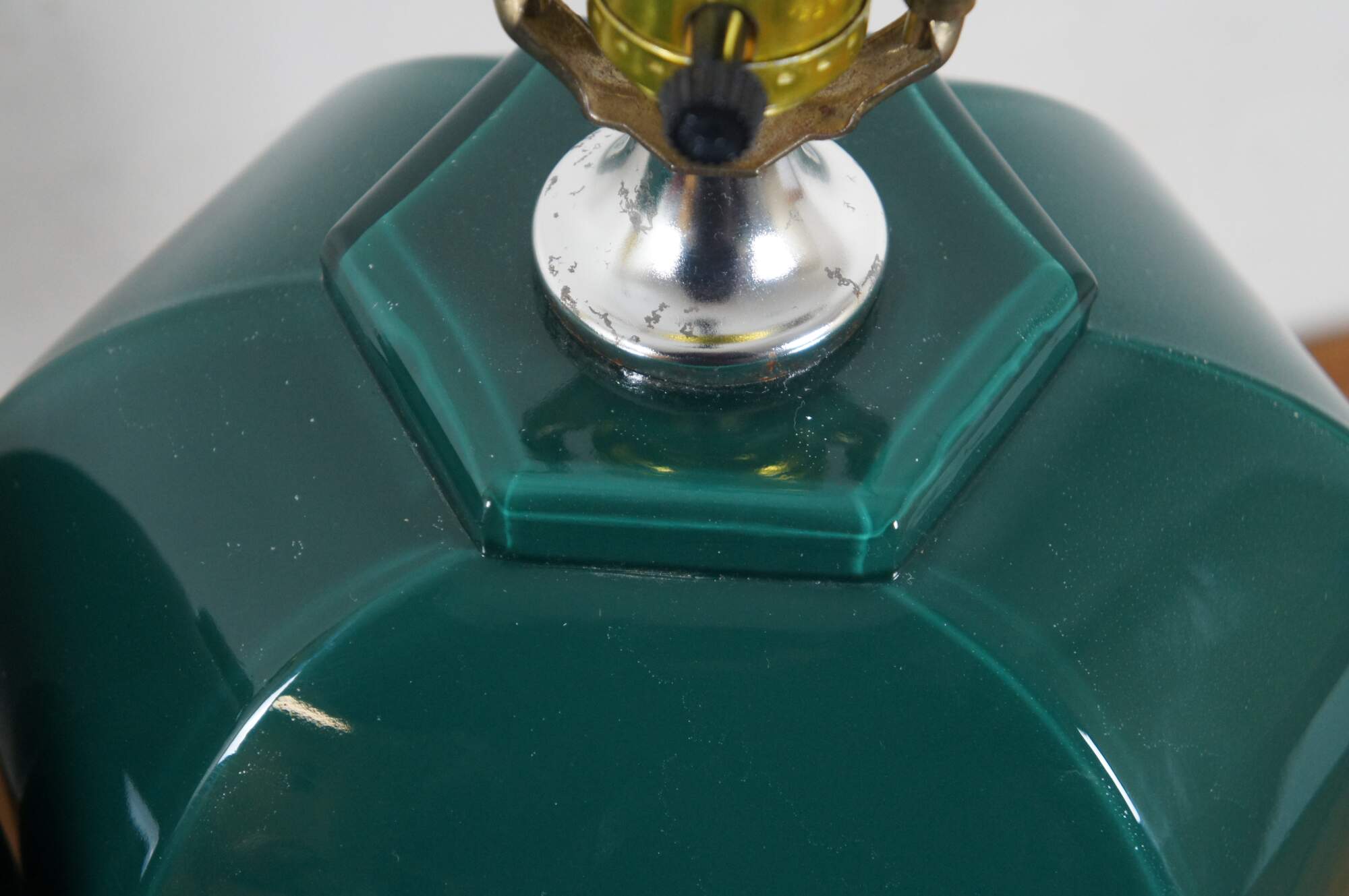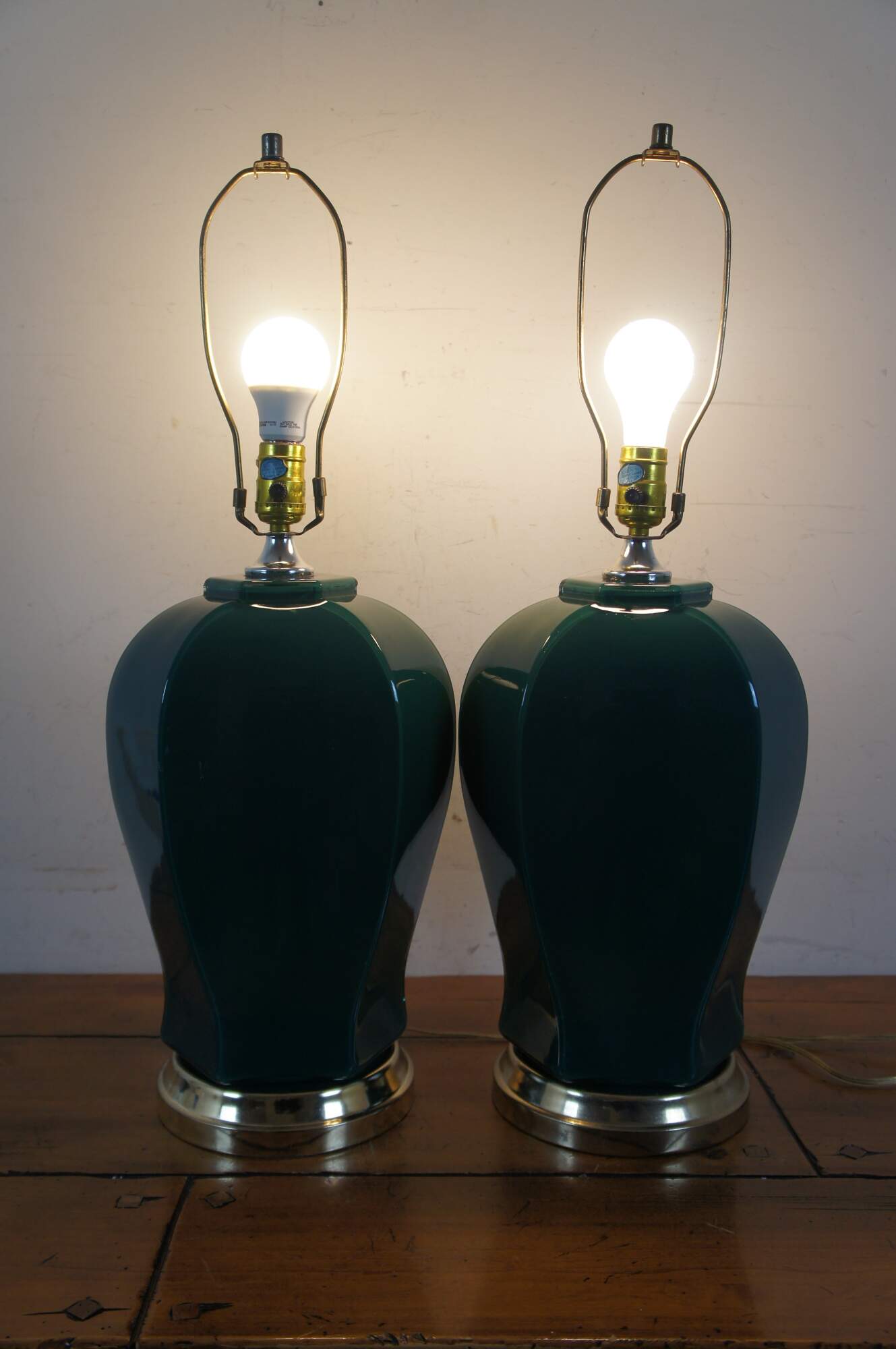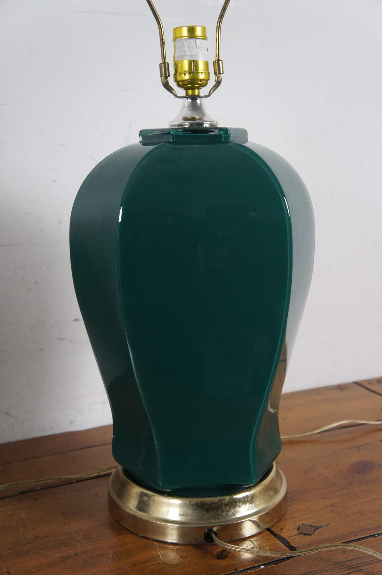Pair of mid 20th century glass table lamps, reverse painted in forest green featuring brass bases and a unique faceted ginger jar / urn shaped body. Includes harp and simple cap shaped finials.
