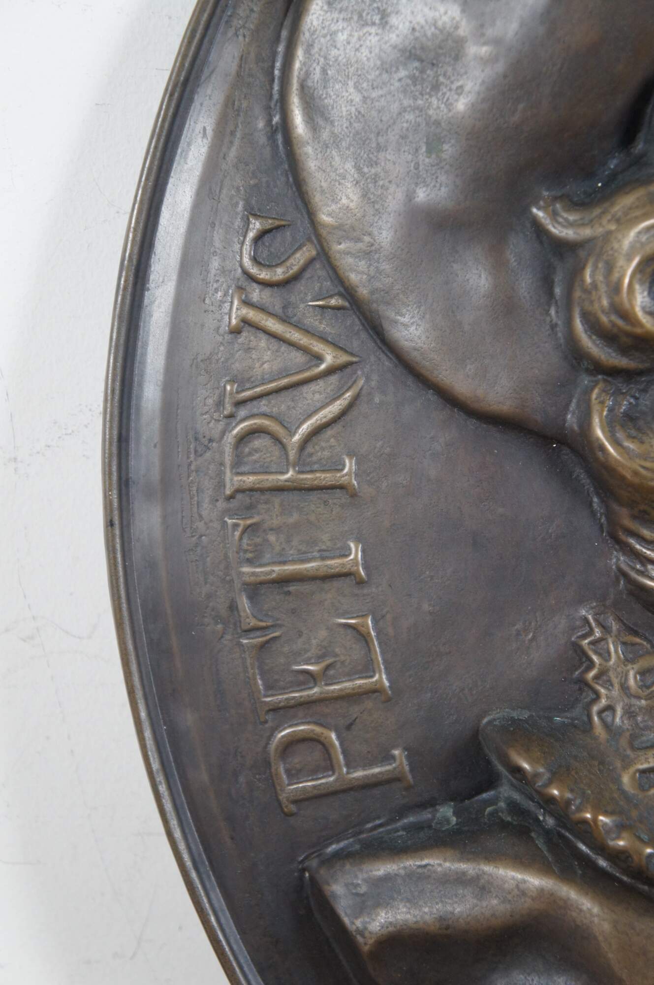 Early 20th century embossed copper wall hanging bust portrait plaque featuring a portrait of Flemish artist Peter Paul Rubens, framed by his name in Latin and accented with a coat of arms.