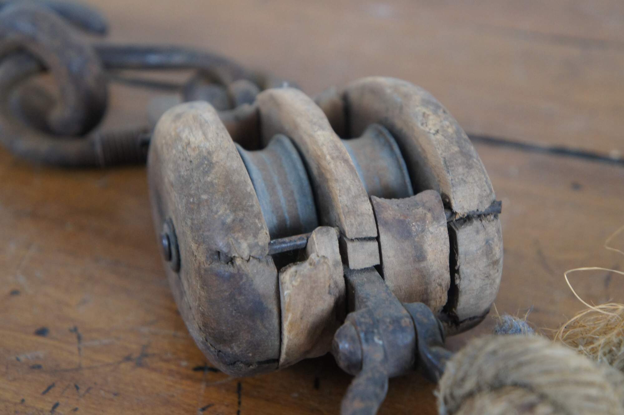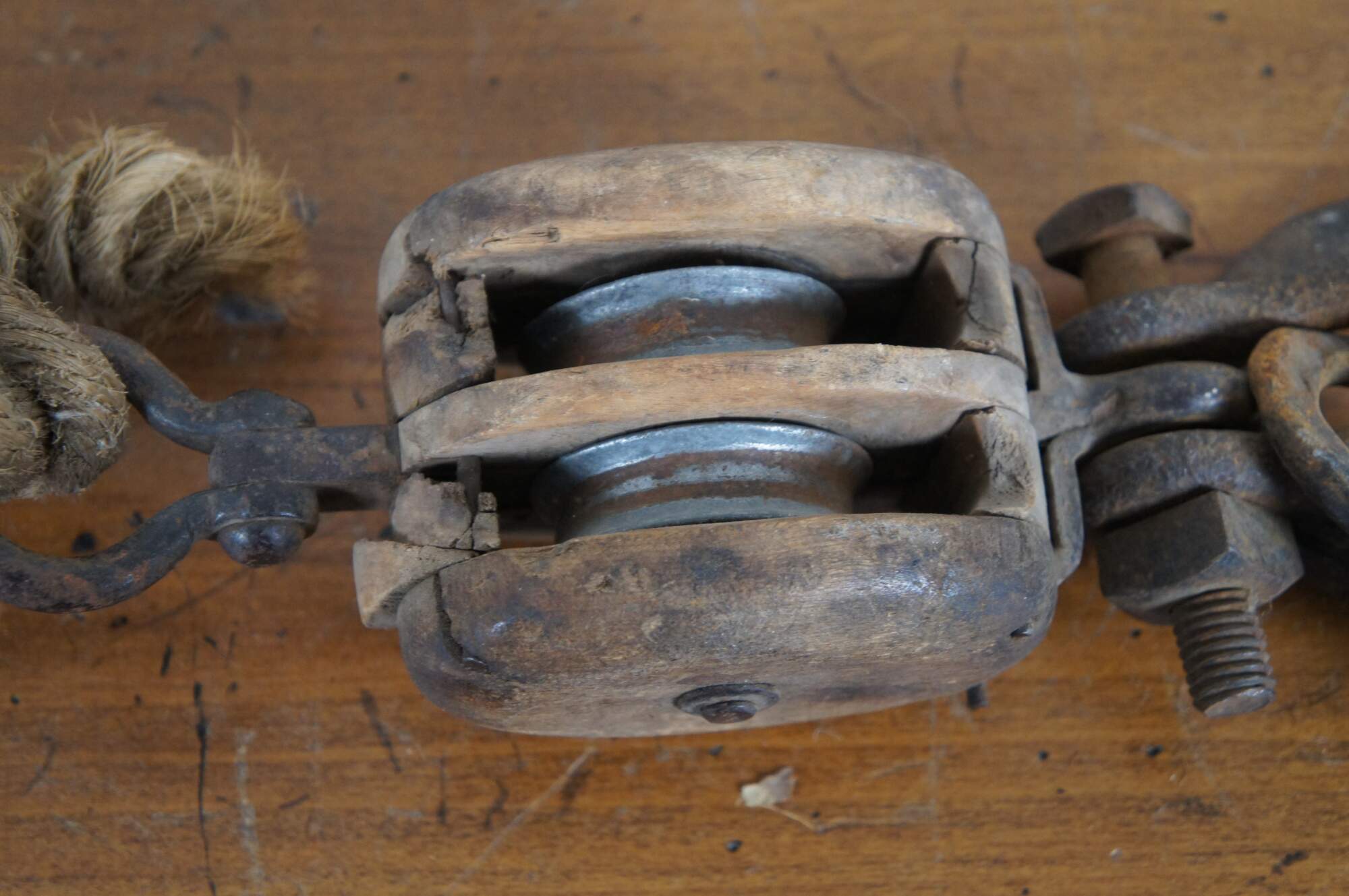 Antique industrial country farmhouse wood and cast iron double block pulley and hook.
