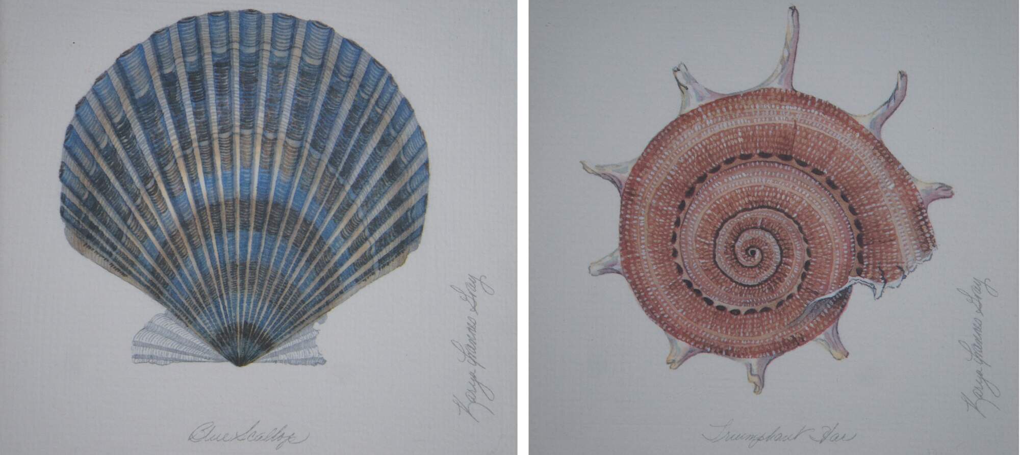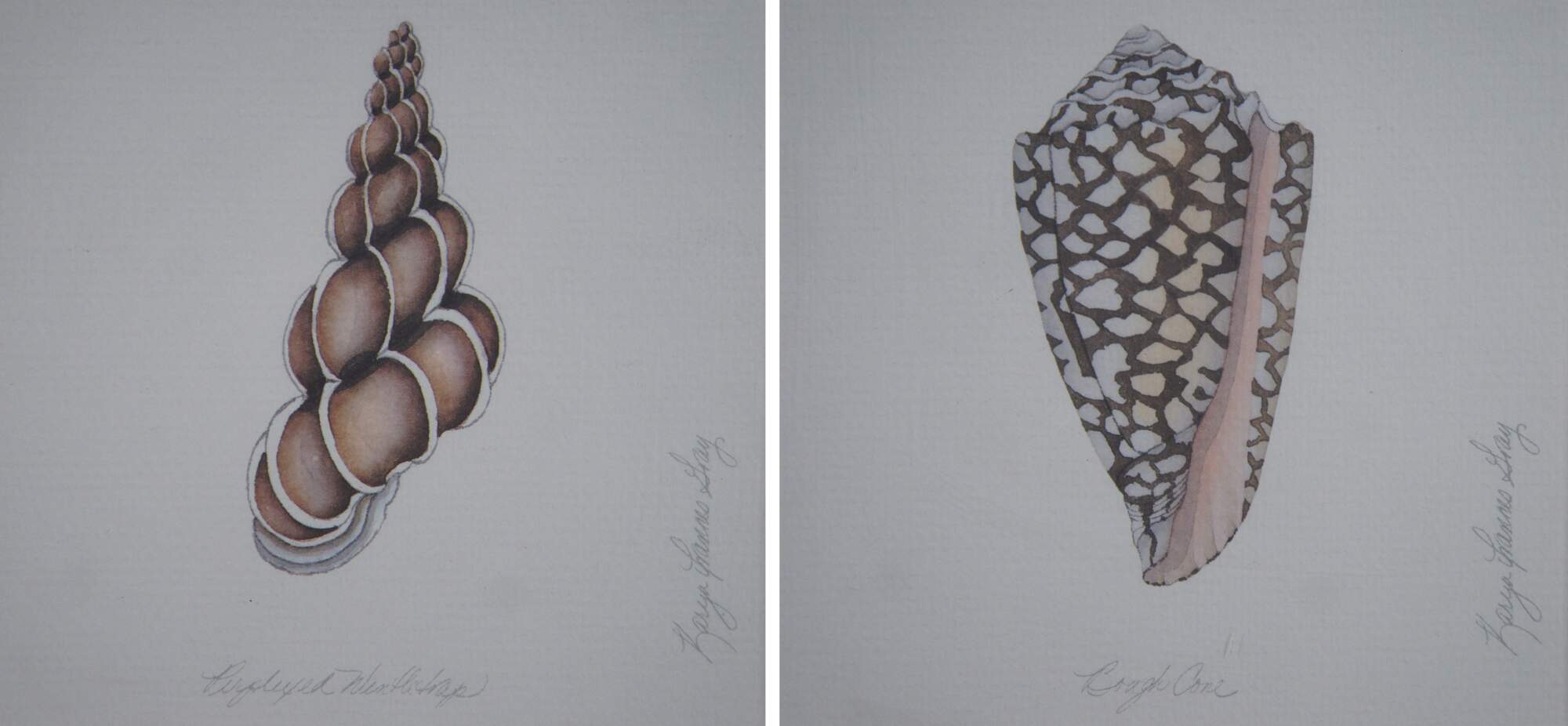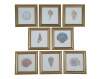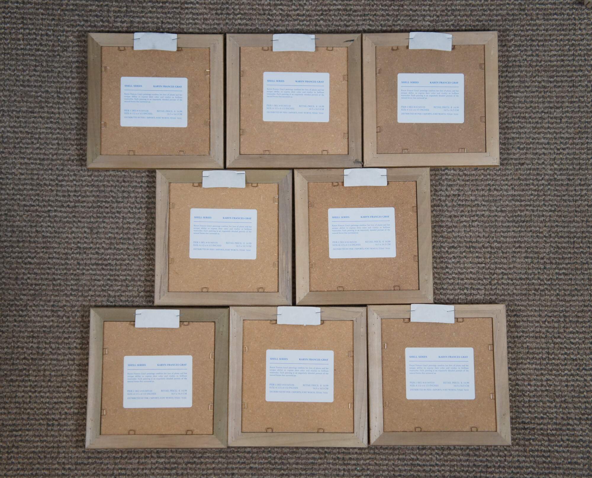 Set of eight digital prints by Karyn Frances Gray from her Sea Shell Series for Pier 1 Imports, including Moon Shell, Channeled Welk, Blue Scallop, Trimphant Star, Perplexed Wentletrap, Bough Cone, Blended Triton and Sand Dollar. Beveled gilt wood frames with beaded and rope twist edge details.