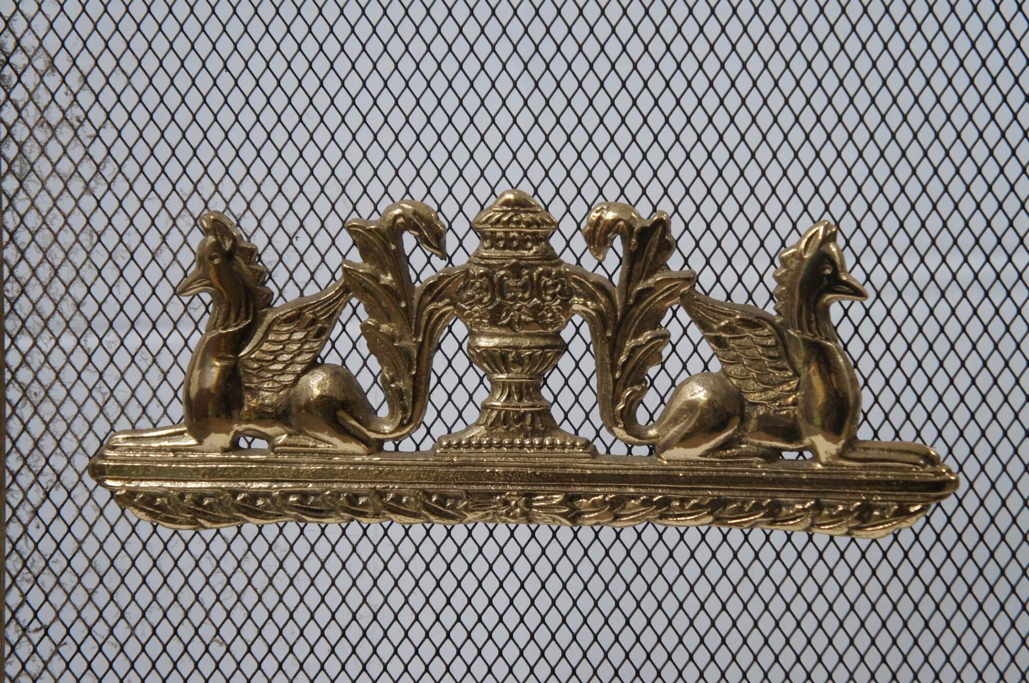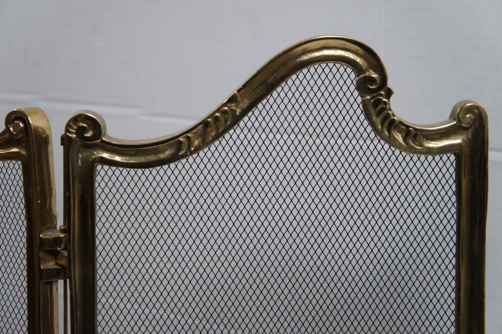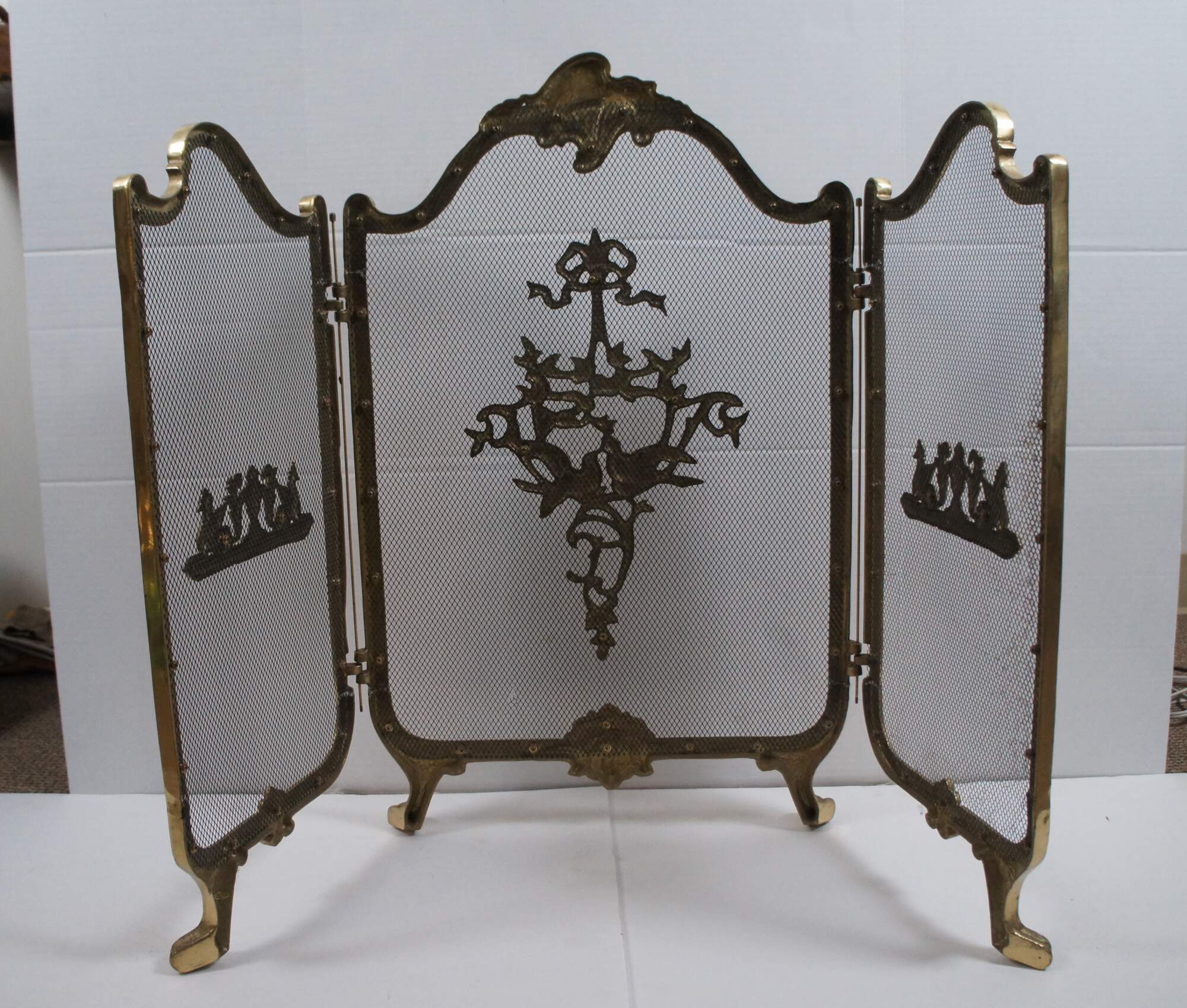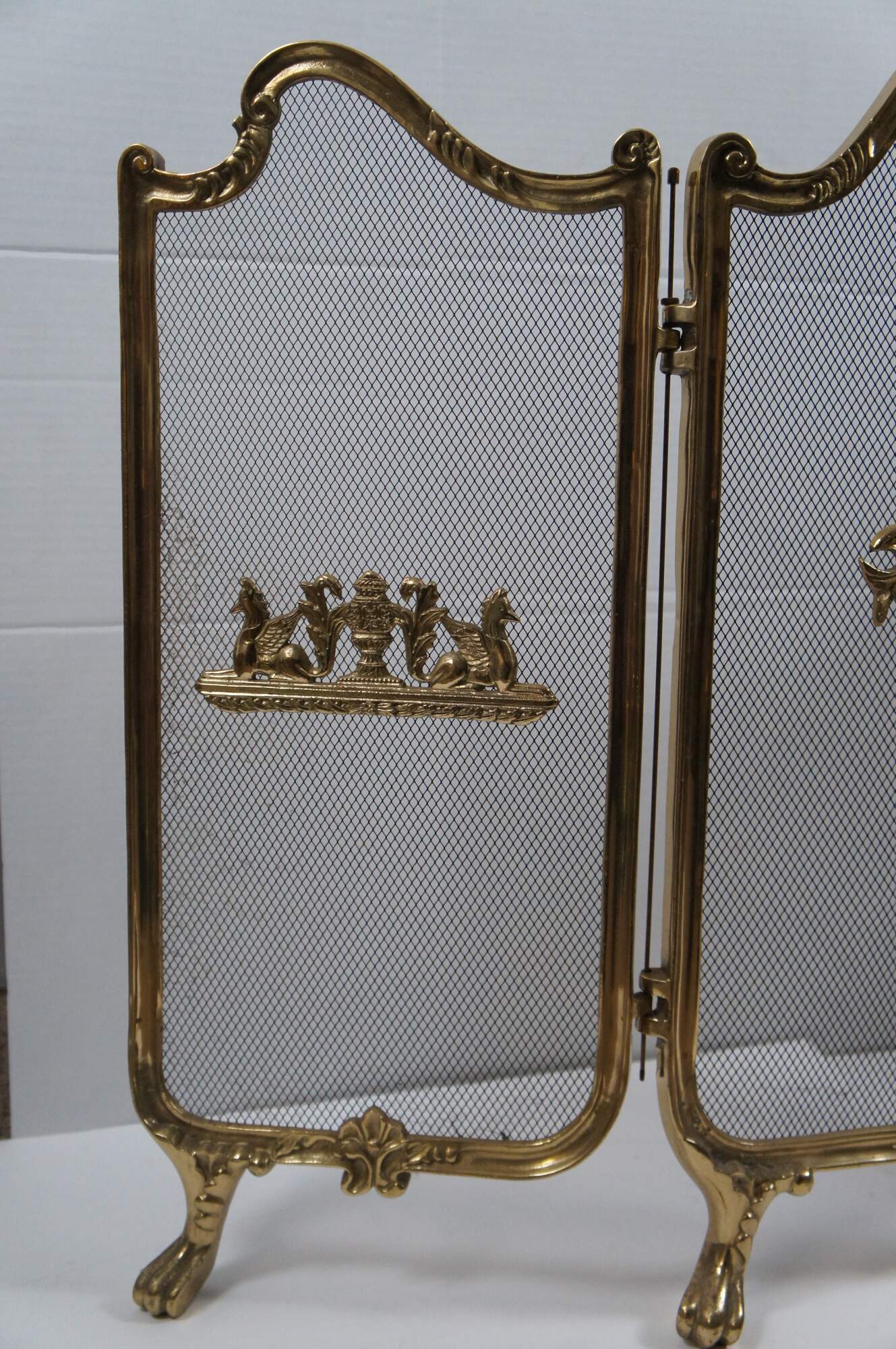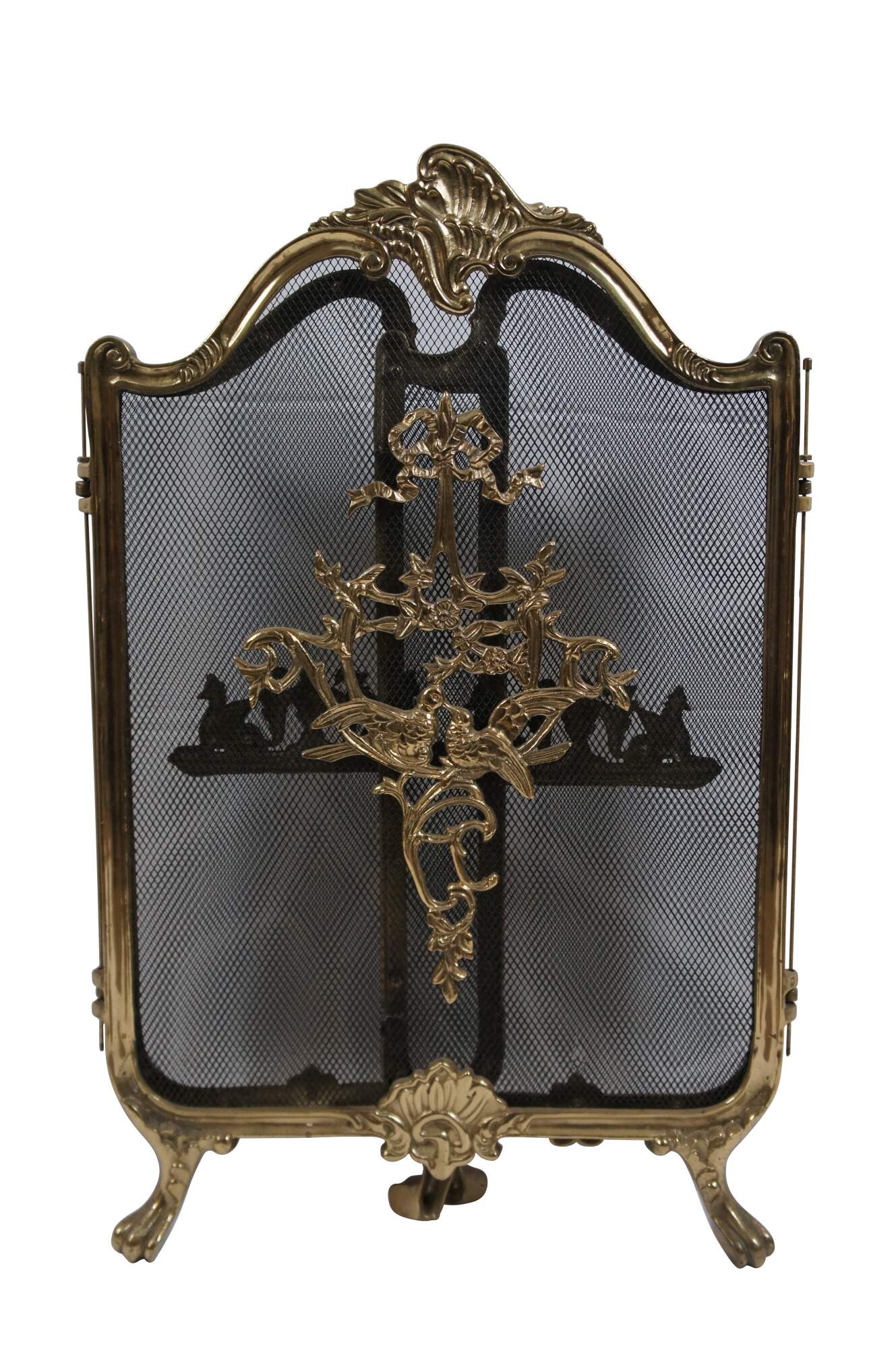 Mid century French Louis XV brass hearth / fireplace screen featuring three folding metal mesh panels framed in scrolled brass with scalloped shell accents, paw feet and appliques featuring a pair of lovebirds below a Neoclassical bow on a flowering branch and winged gryphons flanking a mantel urn / vase.