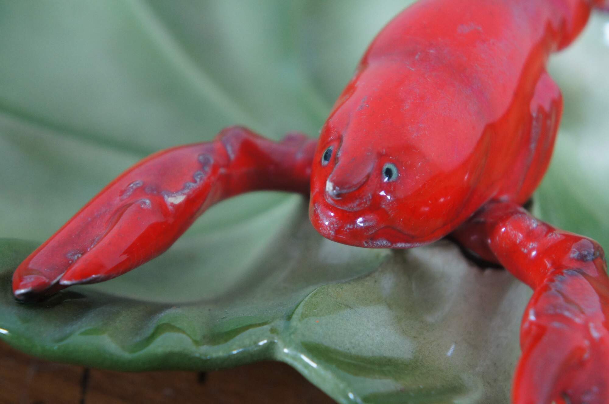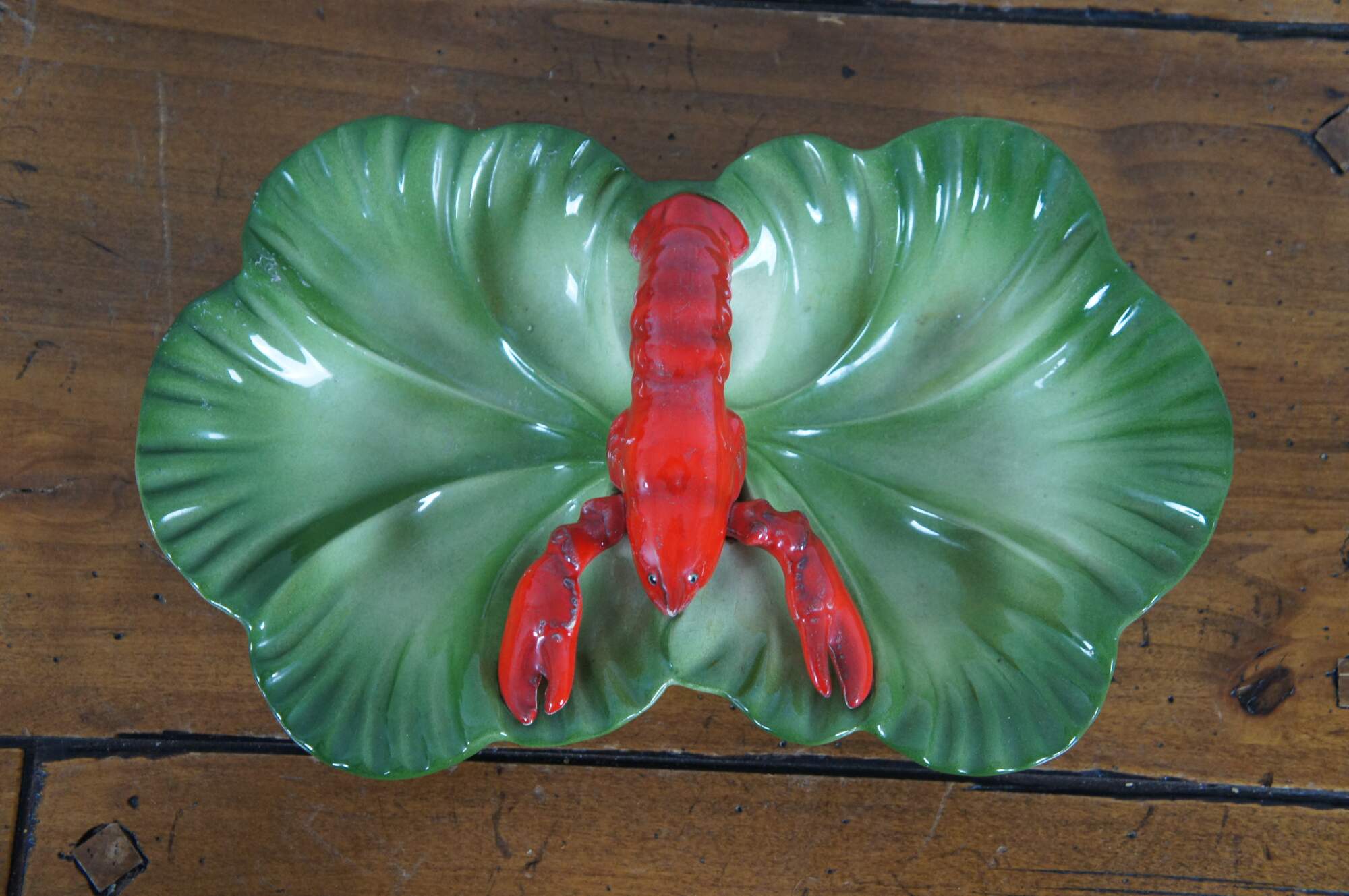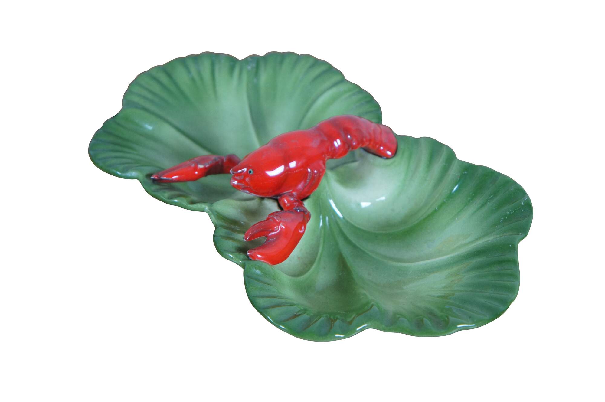 Vintage 1940's Brad Keeler "lobsterware" porcelain divided serving dish in the shape of a red lobster seated at the center of a pair of cabbage / lettuce leaves. Item number 872. Made in USA. Stamped on base.