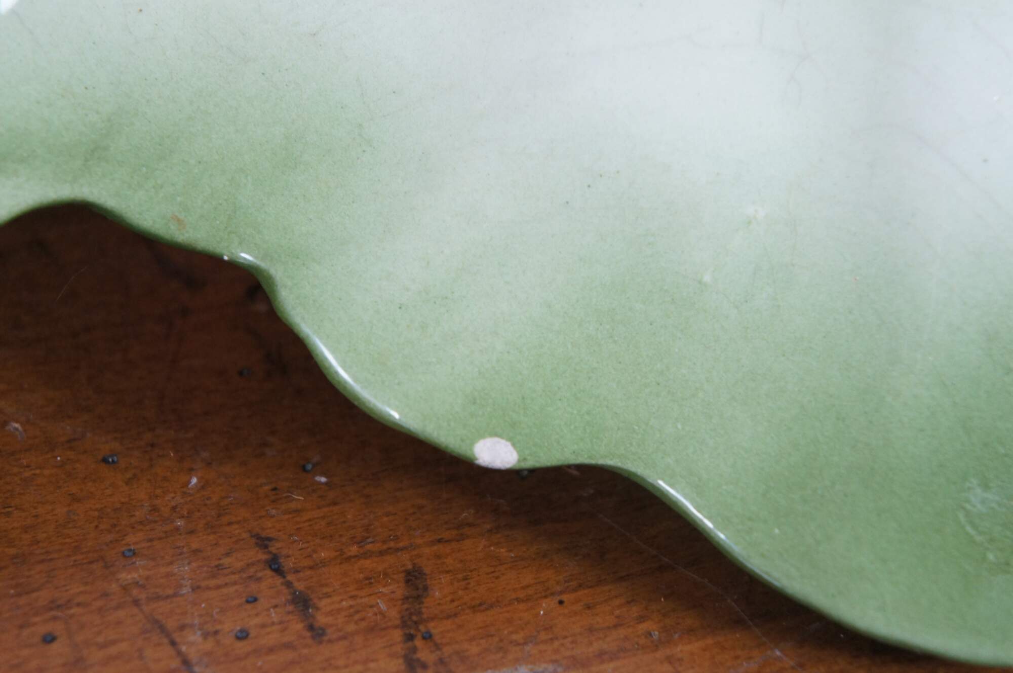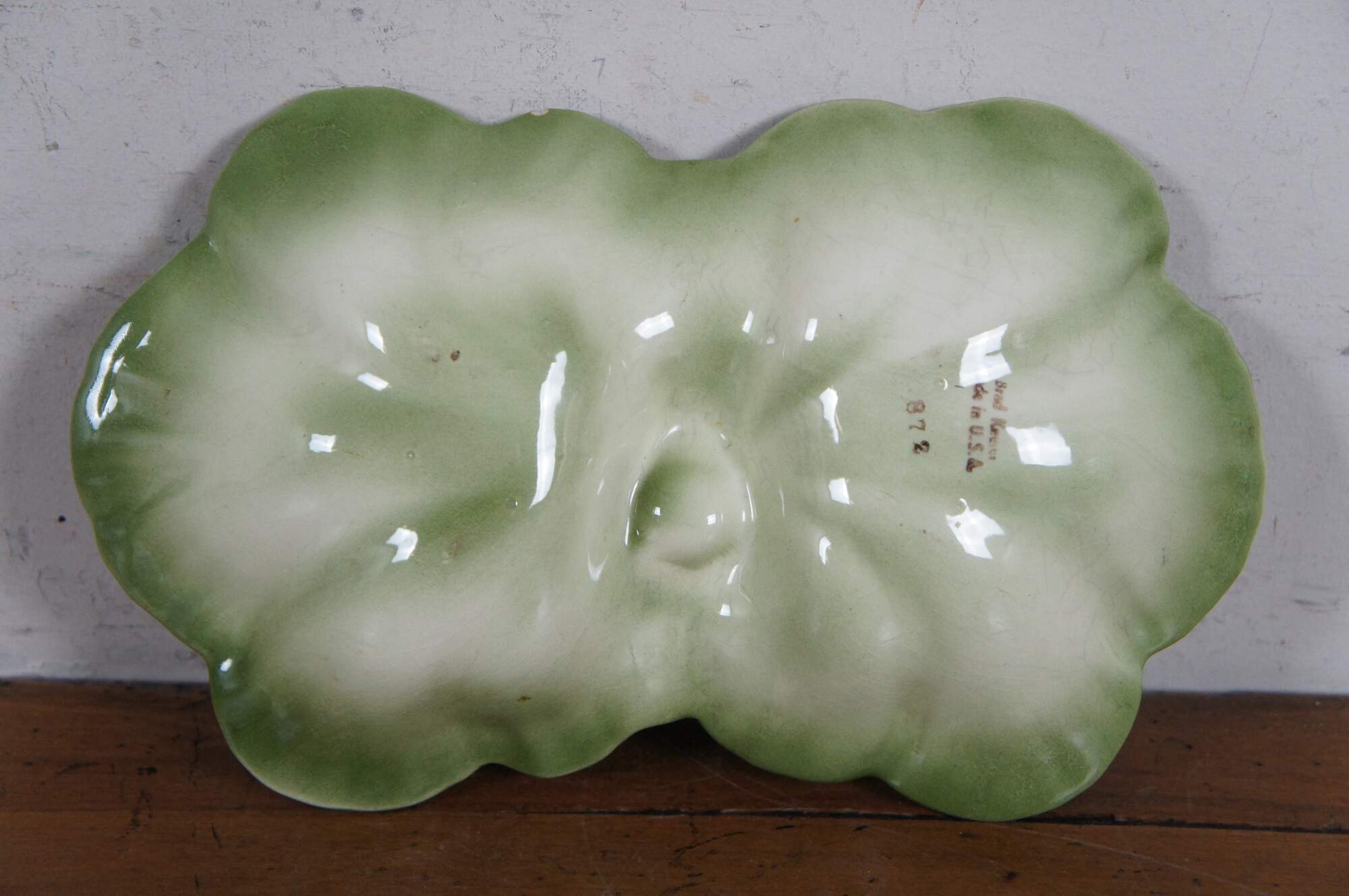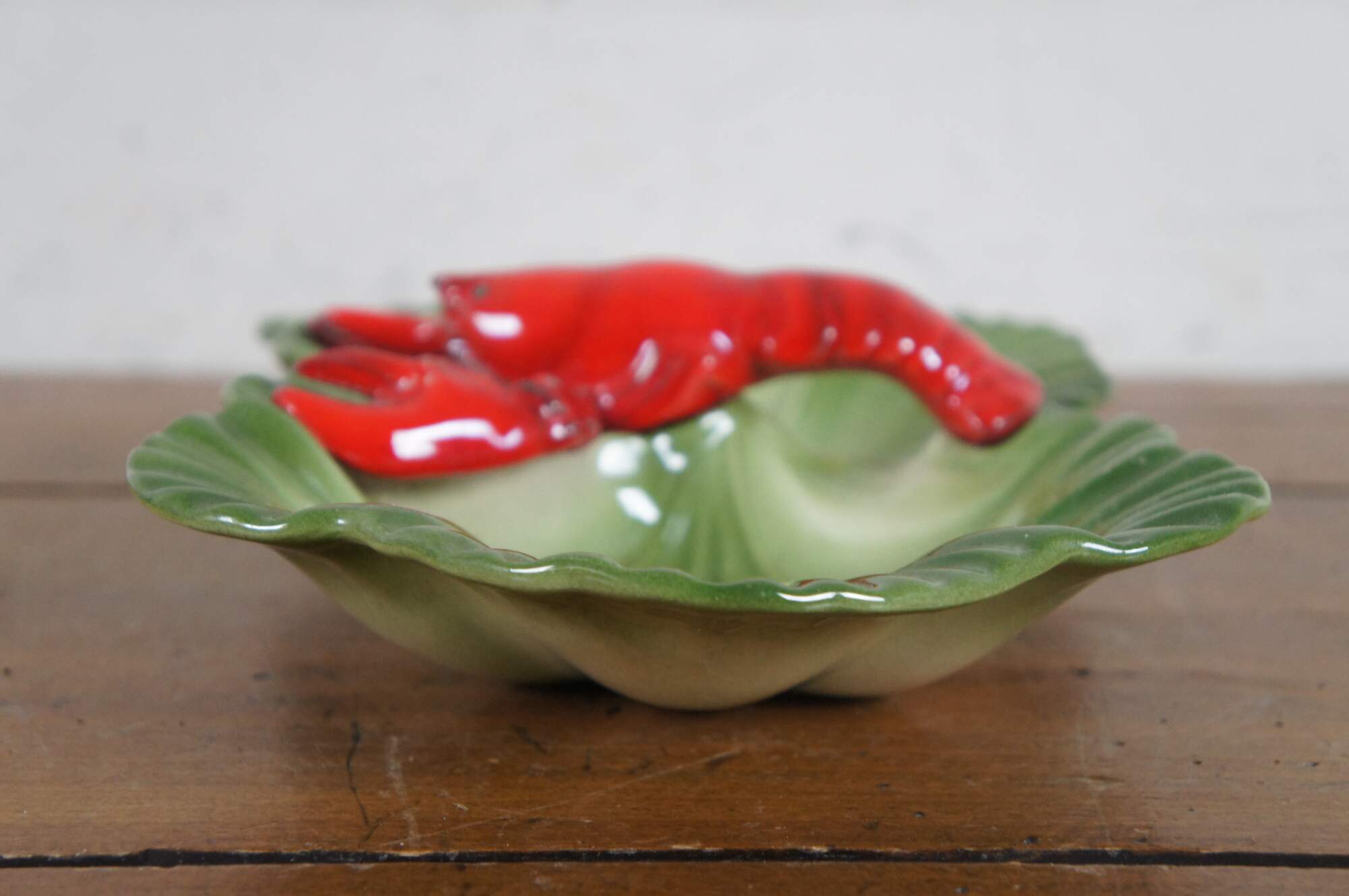 Vintage 1940's Brad Keeler "lobsterware" porcelain divided serving dish in the shape of a red lobster seated at the center of a pair of cabbage / lettuce leaves. Item number 872. Made in USA. Stamped on base.