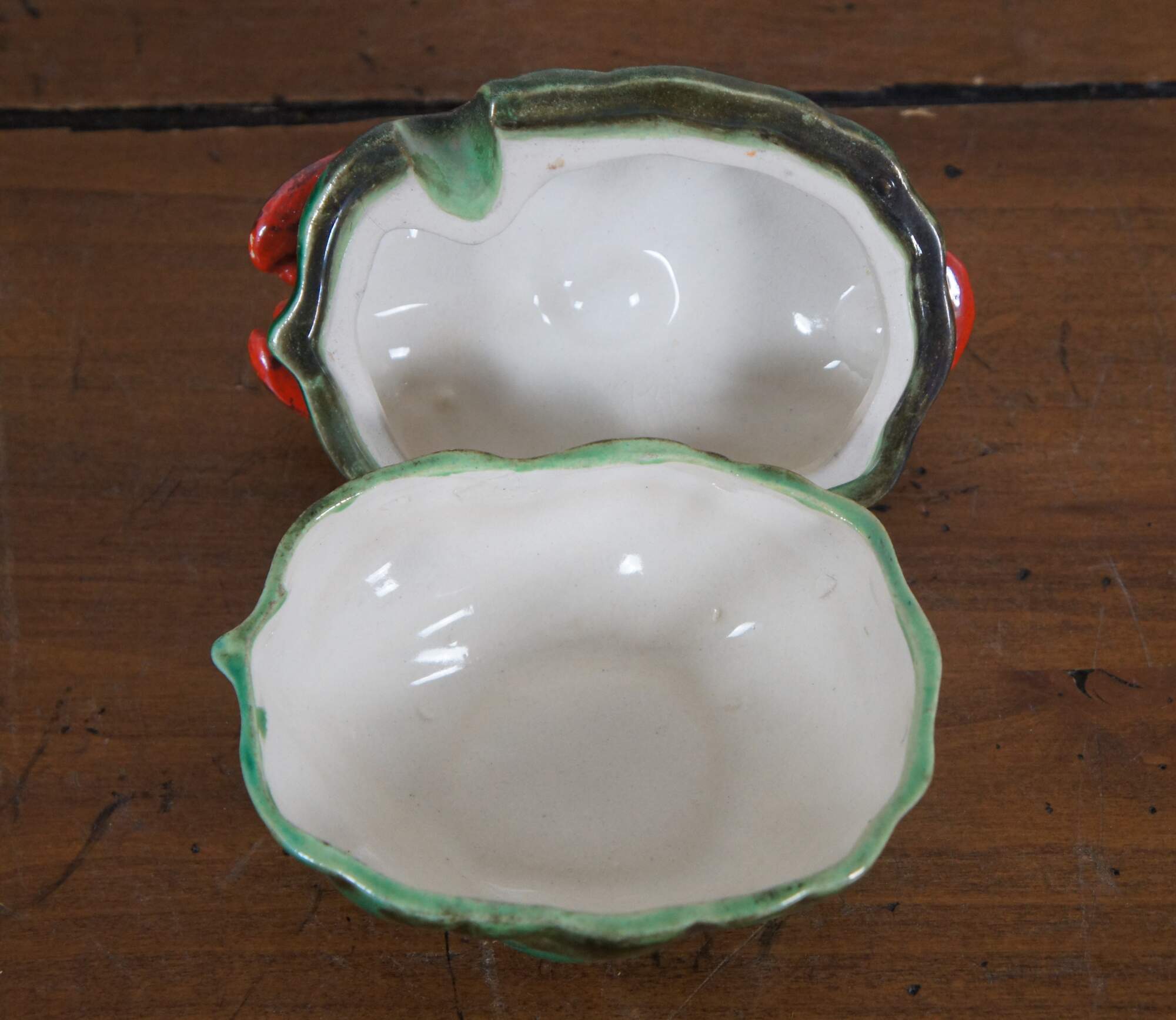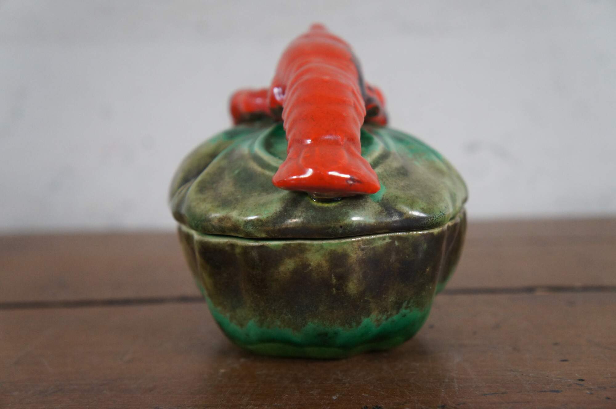 Early 20th century porcelain sugar bowl /jam jar / condiment dish featuring cabbage / lettuce leaves forming the base and lid, glazed in green and brown, with a red lobster perched on top. Half round opening on one side of lid allows a spoon to sit inside. Stamped Japan on base.