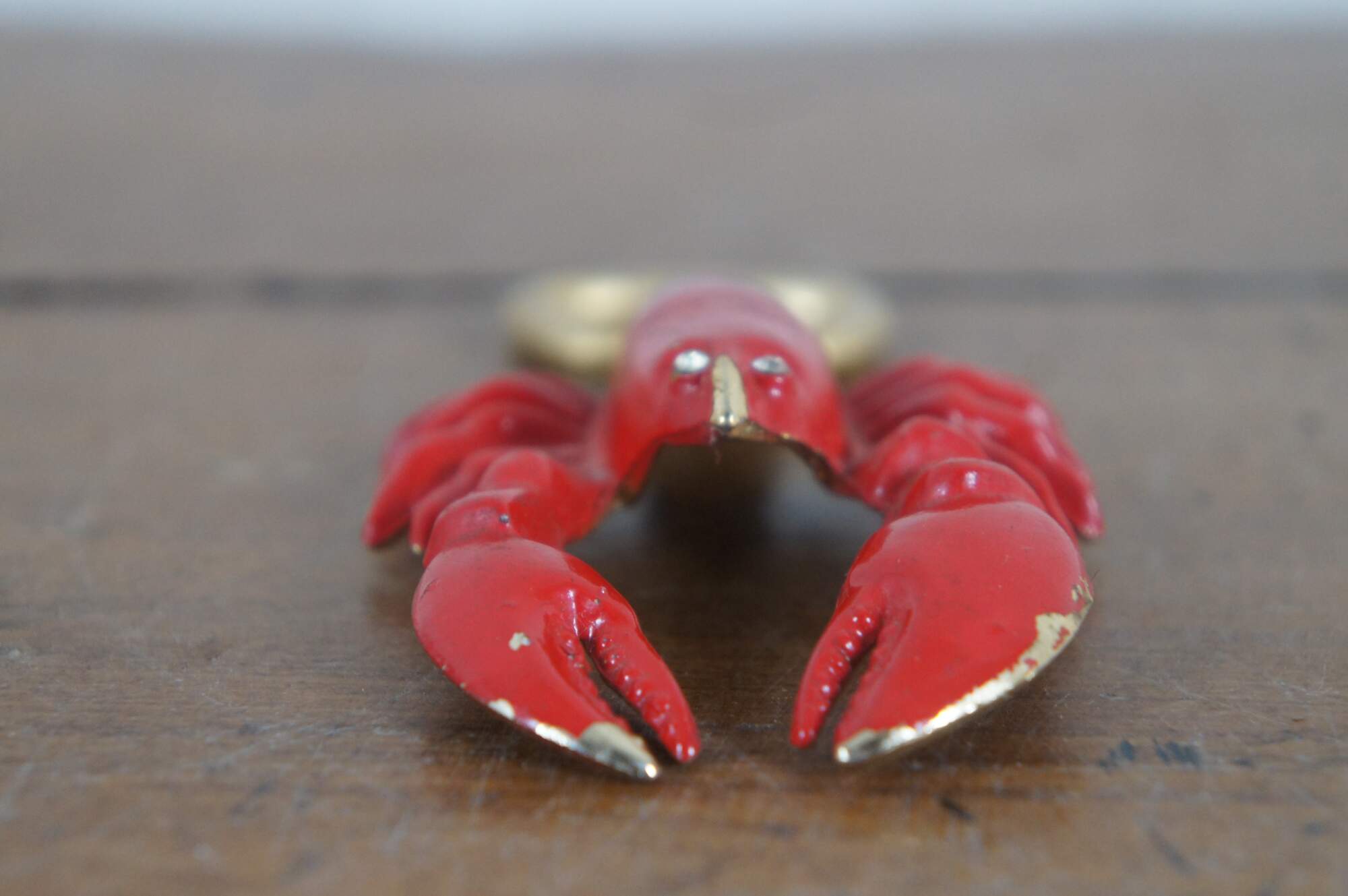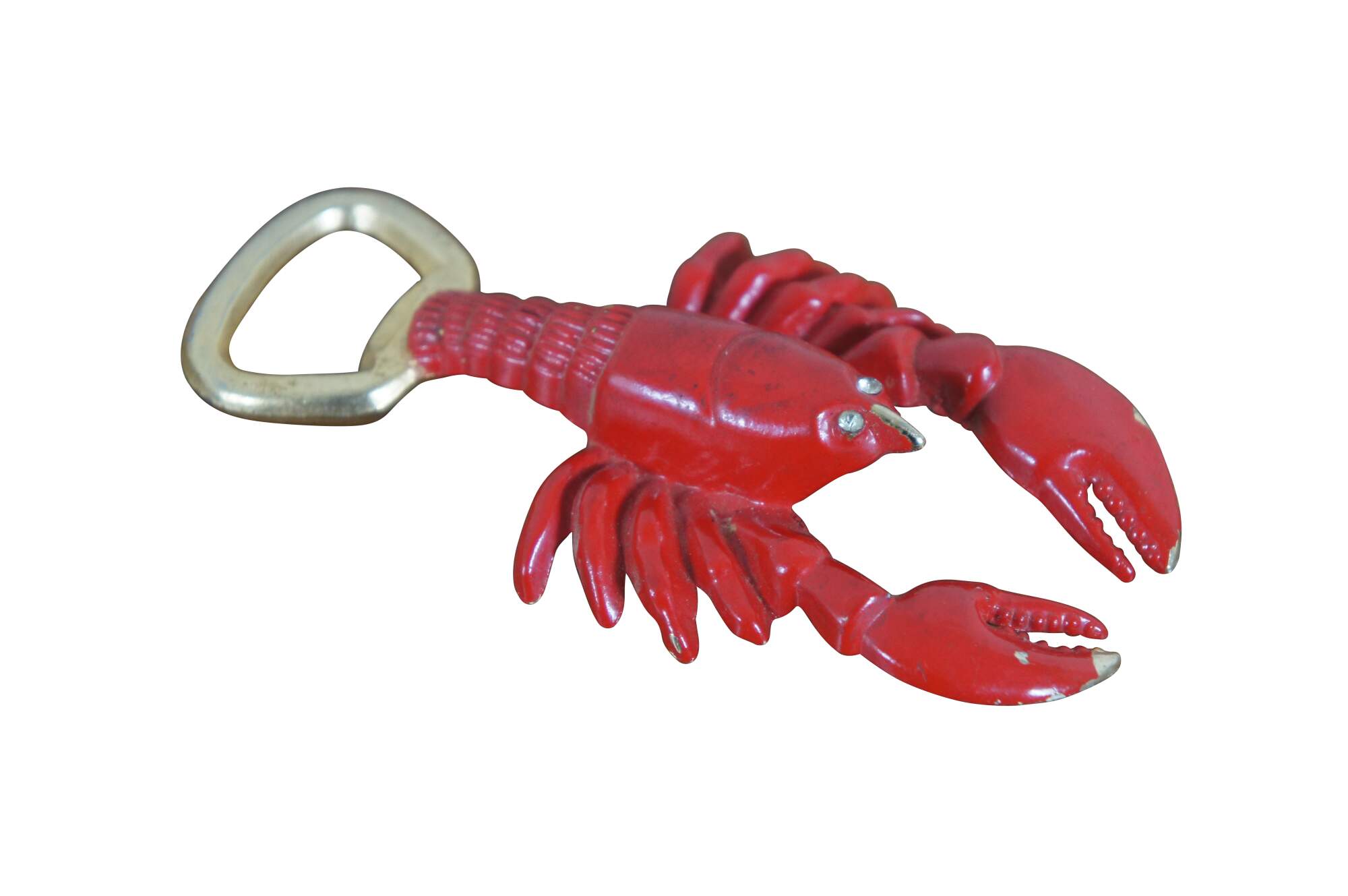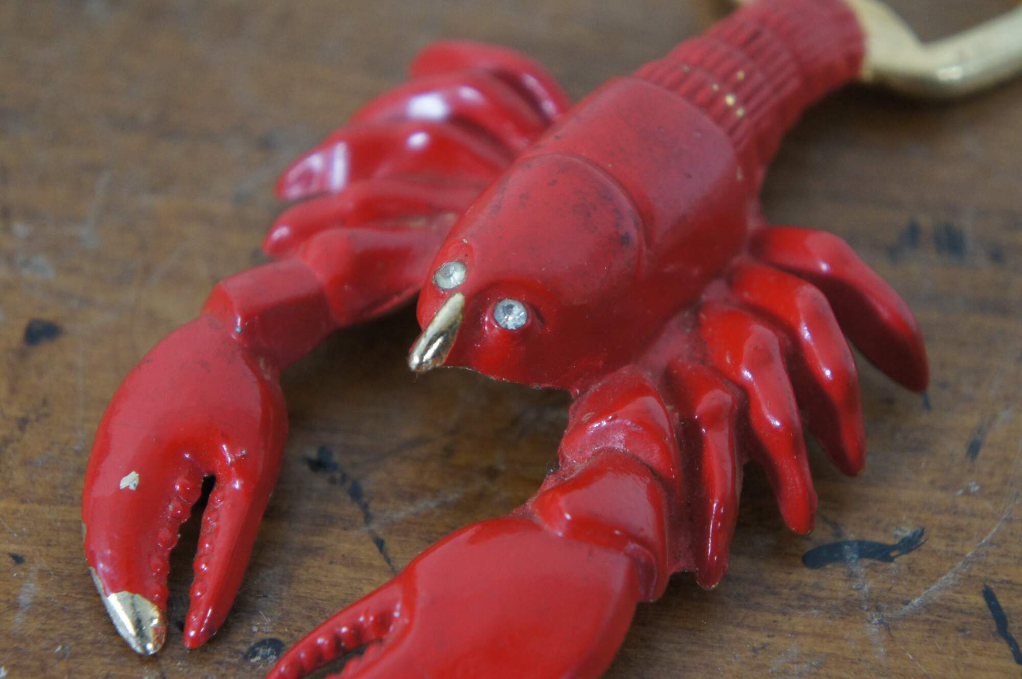 Vintage gilt brass bottle opener in the shape a lobster, painted in glossy red with white rhinestone eyes.
