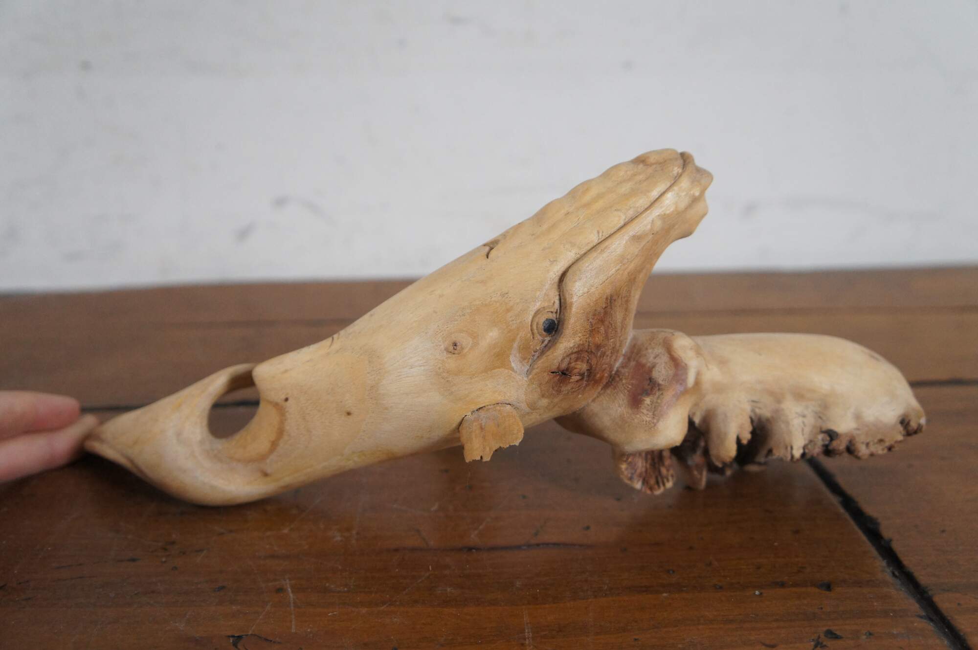 Pair of mid to late 20th century hand carved teak wood whale figurines - one sperm whale with inlaid eyes and one humpback whale perched on a small burl.